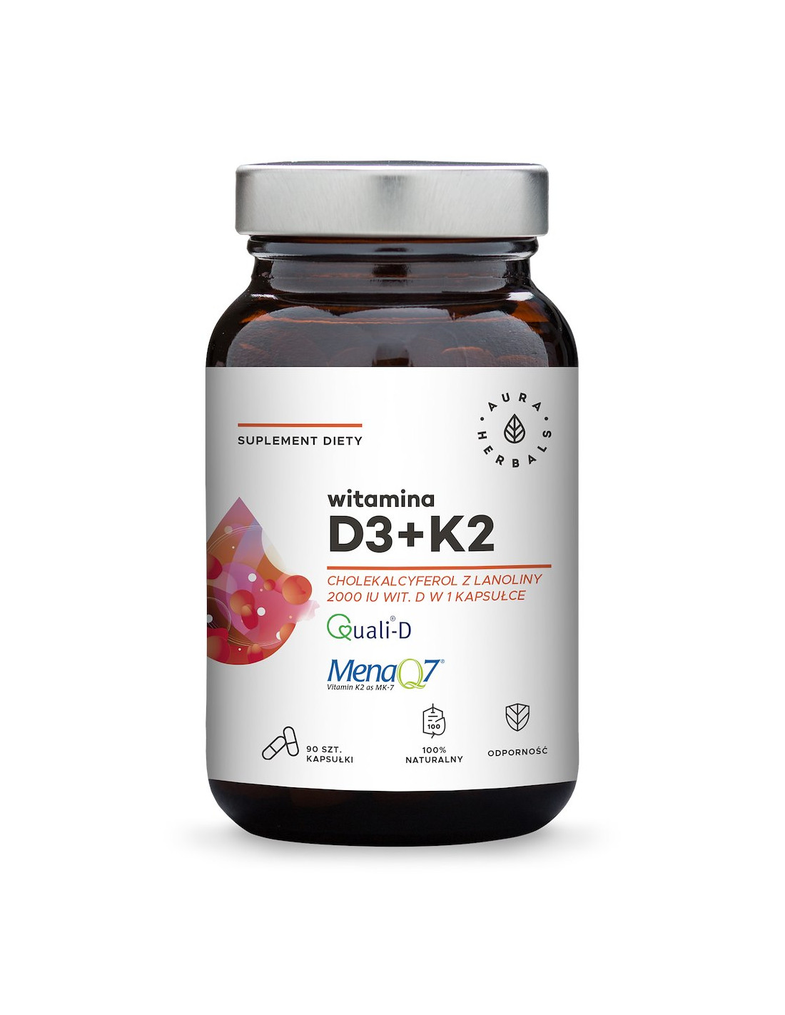Do jej produkcji wykorzystaliśmy certyfikowane witaminy: Quali-D® oraz MenaQ7®. Witamina D – Quali-D® to najwyższej jakości witamina D pozyskiwana z lanoliny, wełny żywych i zdrowych owiec, żyjących na australijskich i nowozelandzkich pastwiskach . Dzięki drobno rozproszonym cząsteczkom pozyskanym w specjalistycznych szwajcarskich laboratoriach, Quali-D® charakteryzuje się bardzo stabilną formą. Ten innowacyjny proces sprawił, że w preparacie Aura Herbals znajdziesz witaminę D naturalnego pochodzenia, która jest jeszcze szybciej i łatwiej wchłaniana przez organizm ludzki.