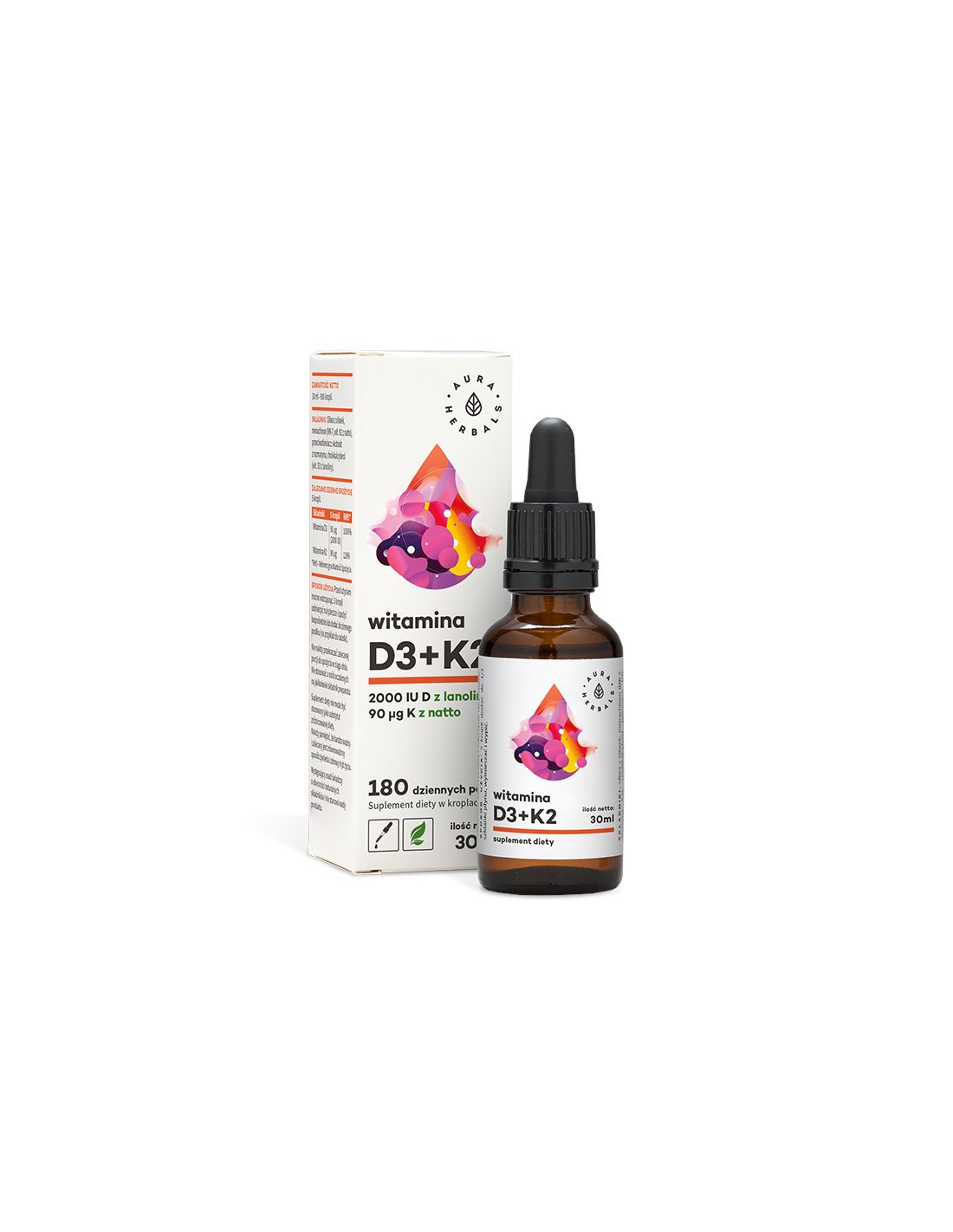 Ilość netto: 30ml - 900 kropli po 400 IU witaminy D3 (360 000 IU D3) i 18μg K2 (16 200 ug K2).