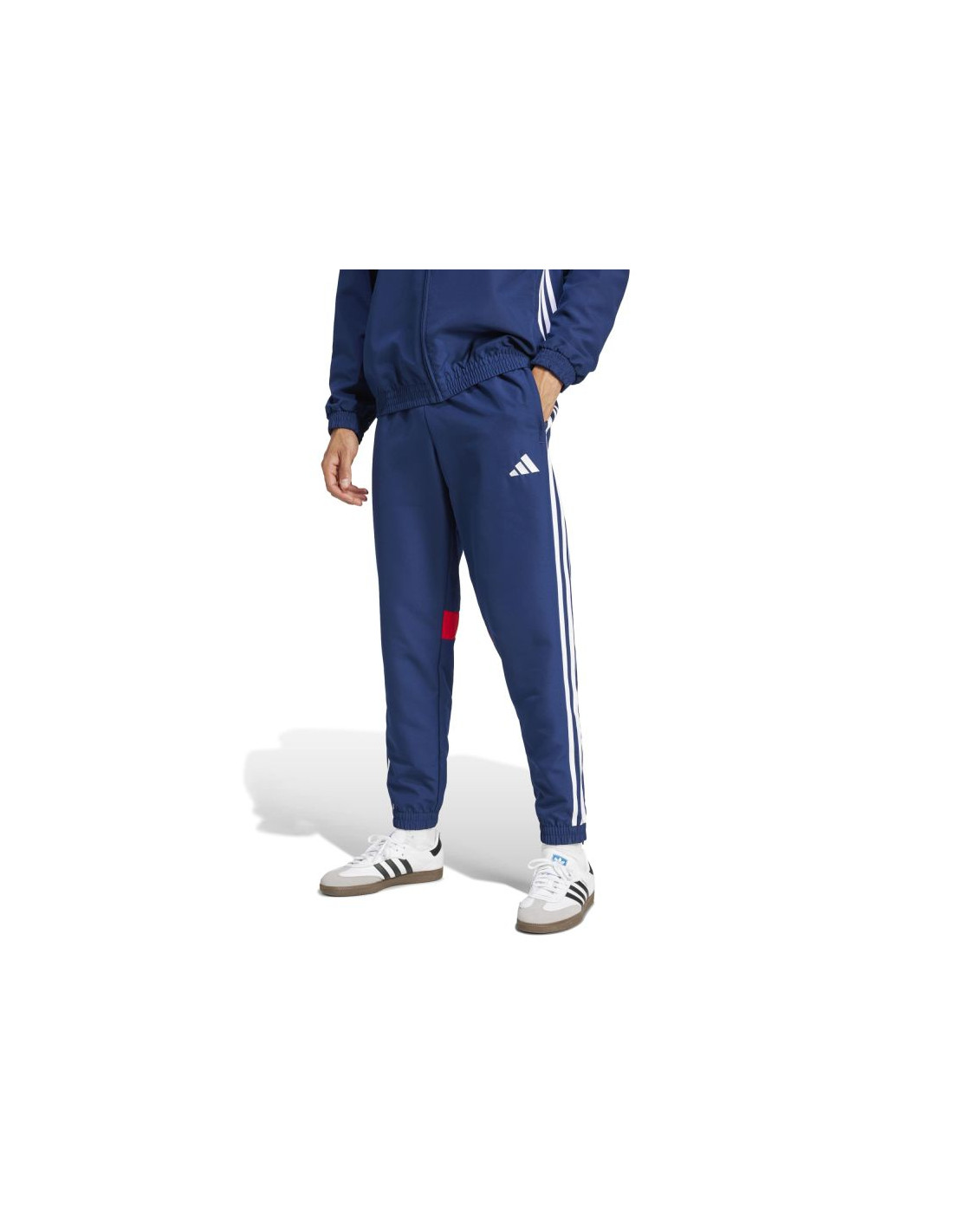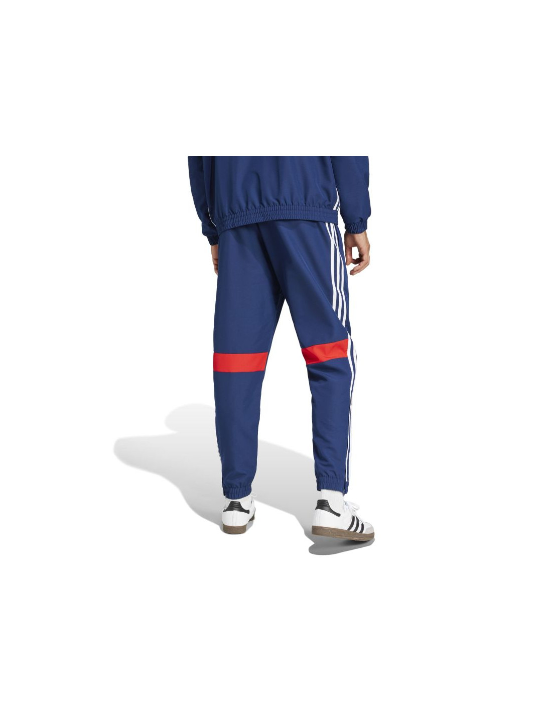 - Model z lampasem, paskami na bokach i kontrastowym logo.