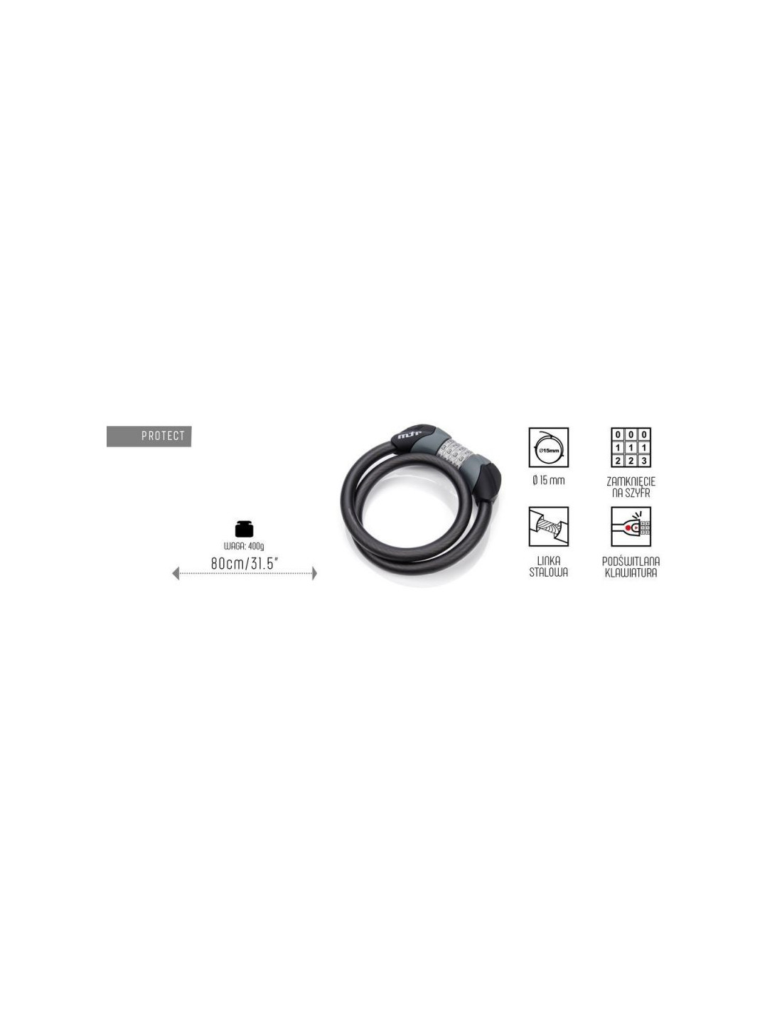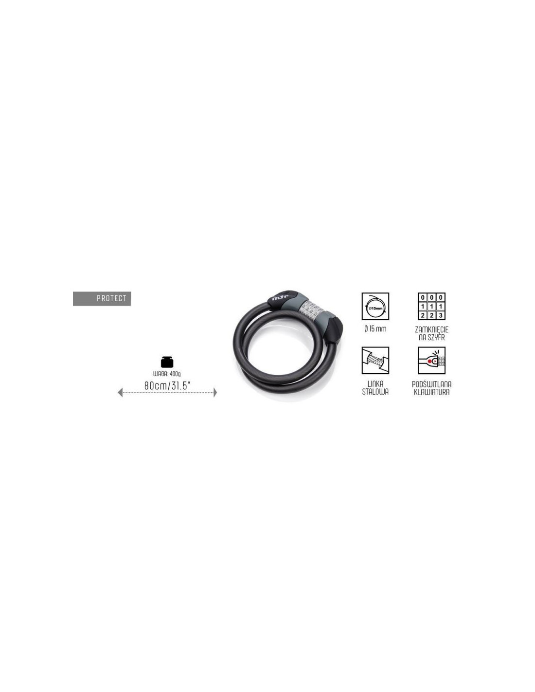 Zapięcie rowerowe w postaci linki stalowej pokrytej tworzywem sztucznym, zabezpieczającym przed zarysowaniem ramy. Zajmuje niewiele miejsca, dzięki czemu jest łatwe do przechowywania i przenoszenia na rowerze.