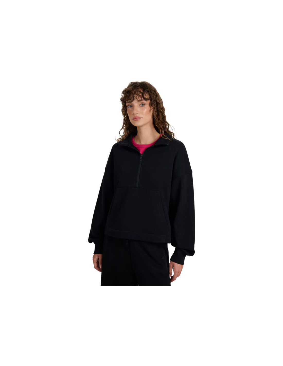Gramatura 330 gsm - solidna grubość materiału zapewniająca trwałość i komfort noszenia· Wnętrze bez podszycia - lżejsza konstrukcja zapewniająca komfort użytkowania· Krój oversize - luźno układa się na sylwetce i zapewnia swobodę ruchu· Długość do bioder - klasyczna, uniwersalna długość· Wykonana w przeważającej części z bawełny - miękka, trwała i przyjemna w dotyku· Dodatek poliestru - zwiększa wytrzymałość materiału i odporność na zużycie· Jednolita kolorystyka - łatwa do zestawienia z innymi elementami garderoby· Dzianina dresowa french terry - gładka na zewnątrz, z pętelkowym splotem wewnątrz dla lepszej wentylacji· Dekolt ze stójką i zamkiem - dodatkowa ochrona szyi i możliwość regulacji rozpięcia· Mankiety ze ściągaczem - utrzymują rękawy na właściwym miejscu· Kieszeń kangurka z przodu - wygodne miejsce na dłonie i drobiazgi· Wkładana przez głowę - proste i szybkie zakładanie· Obniżona linia ramion – podkreśla swobodny charakter kroju