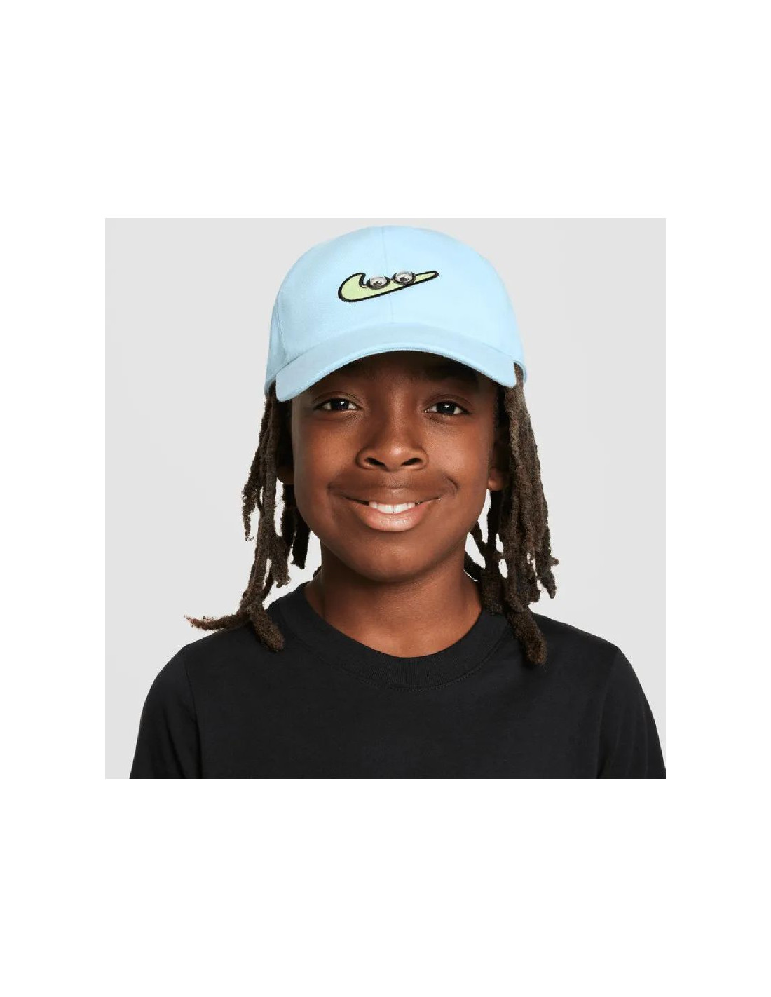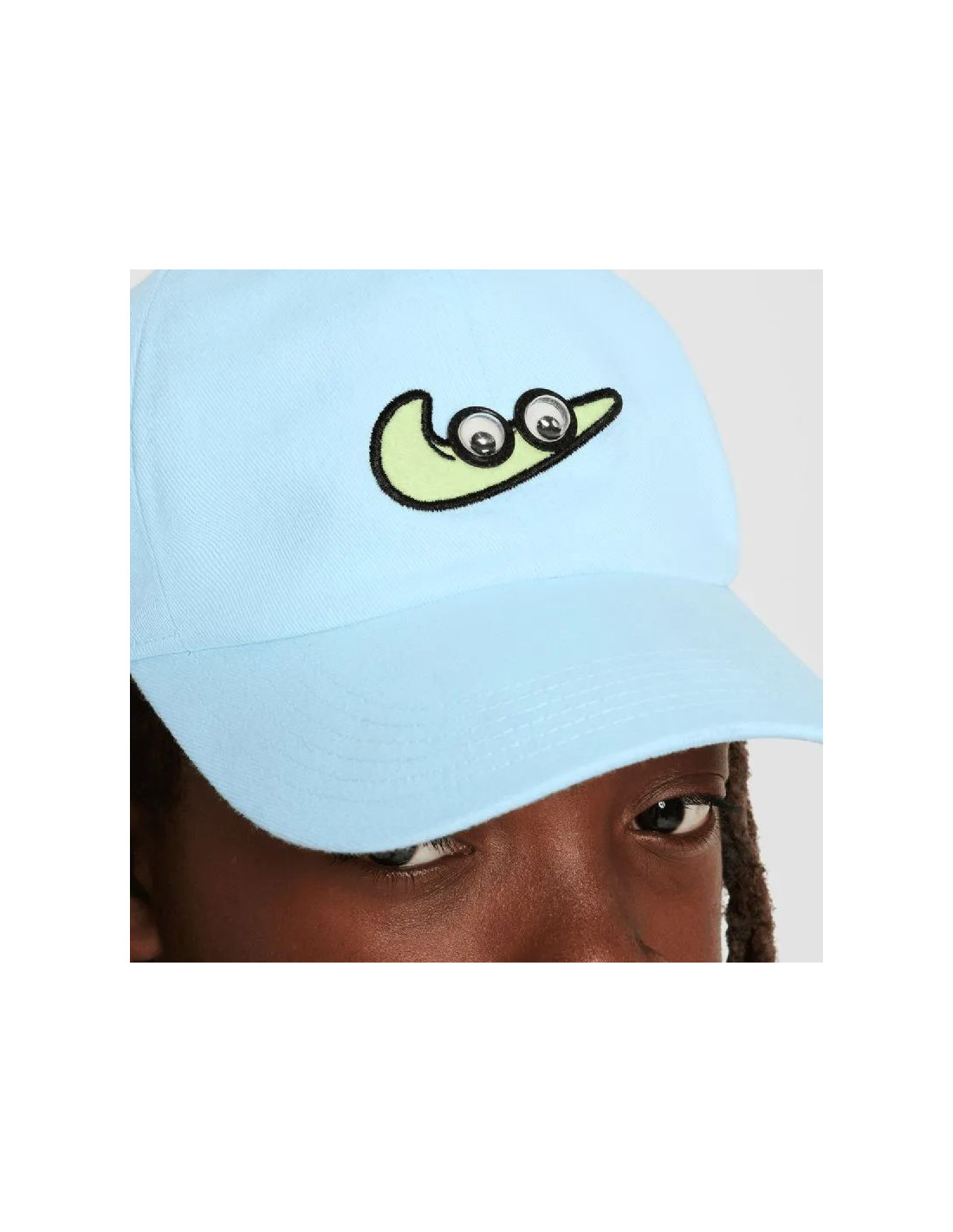 Na froncie umieszczono logo Swoosh z ruchomymi oczami, które podkreśla zabawny, dziecięcy charakter czapki i wyróżnia ją na tle klasycznych modeli.