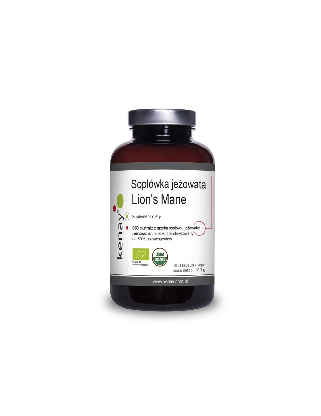 Ekologiczny ekstrakt z grzyba soplówki jeżowatej (owocniki) Hericium erinaceus, standaryzowany na polisacharydy: 50%; kapsułka: hydroksypropylometyloceluloza.
