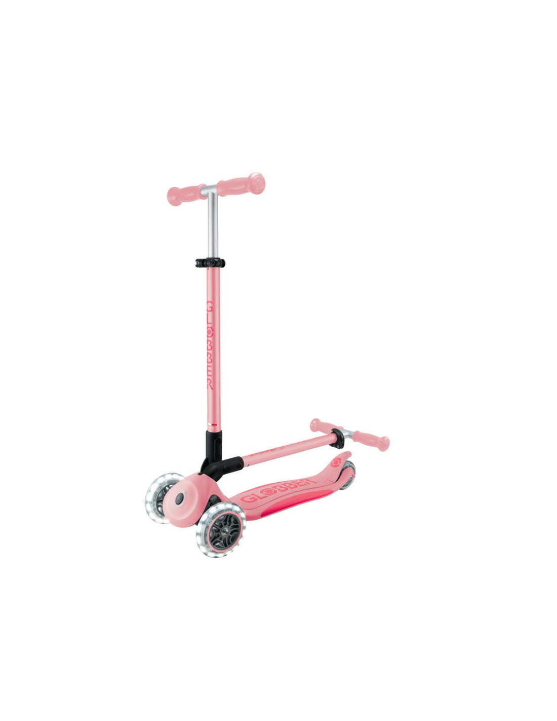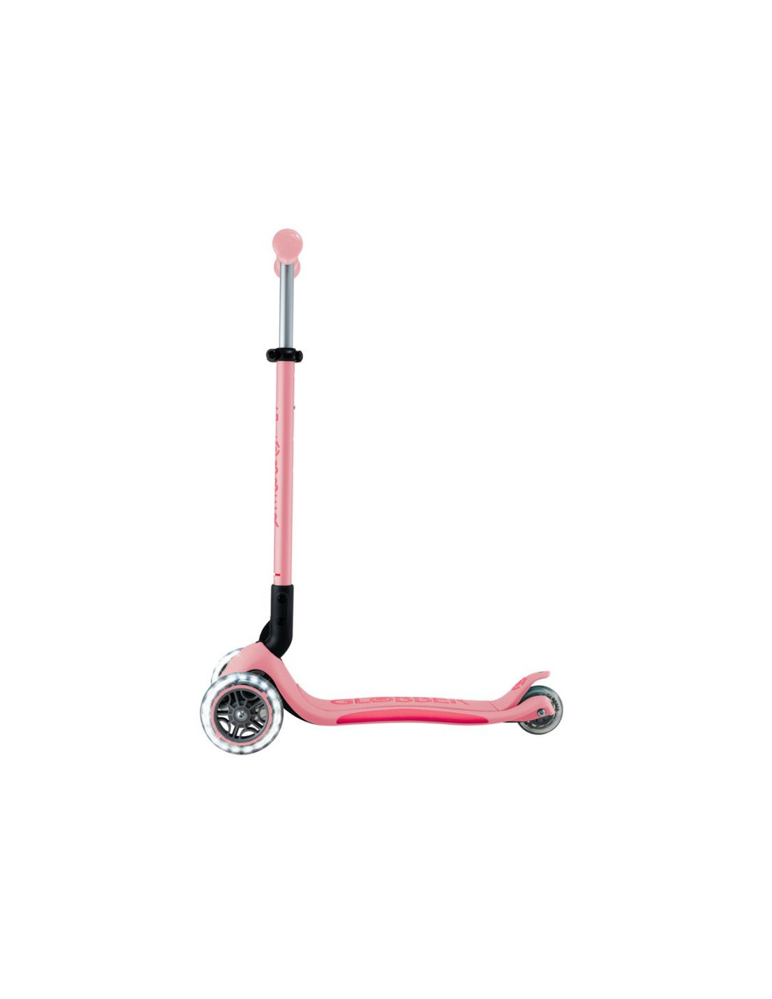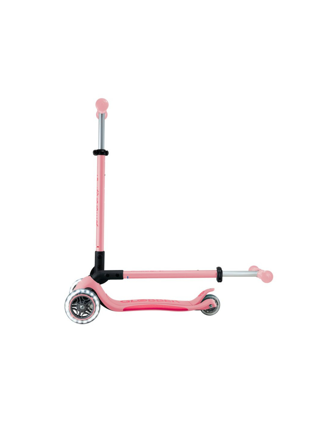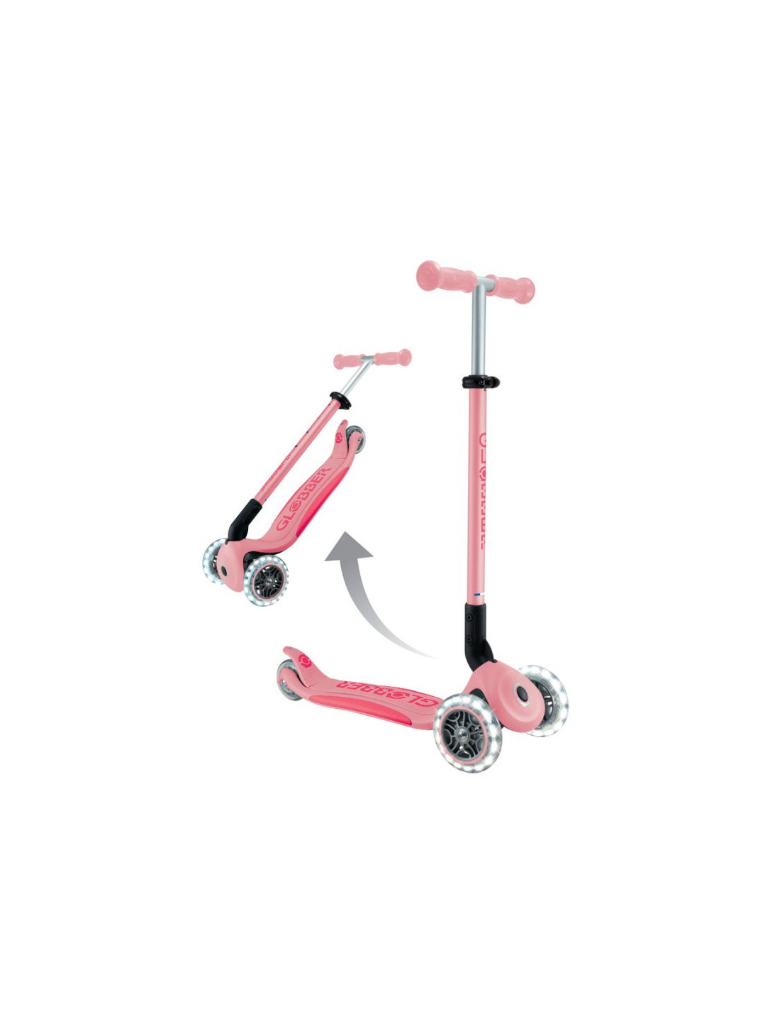 - 3-kołowa hulajnoga z opatentowanym przez Globber systemem składania z bezpiecznym przyciskiem, który składa hulajnogę w tryb wózka. Wygodnie przenoś, tocz lub przechowuj po zabawie!