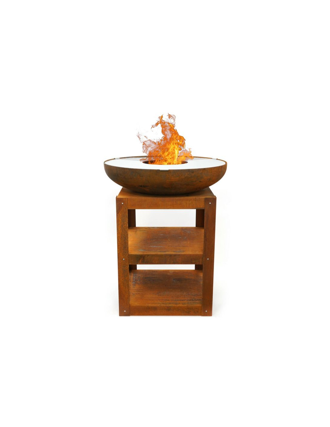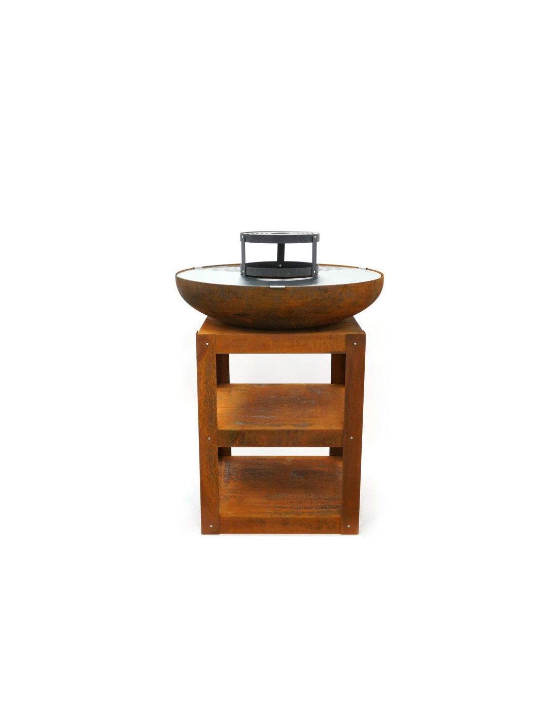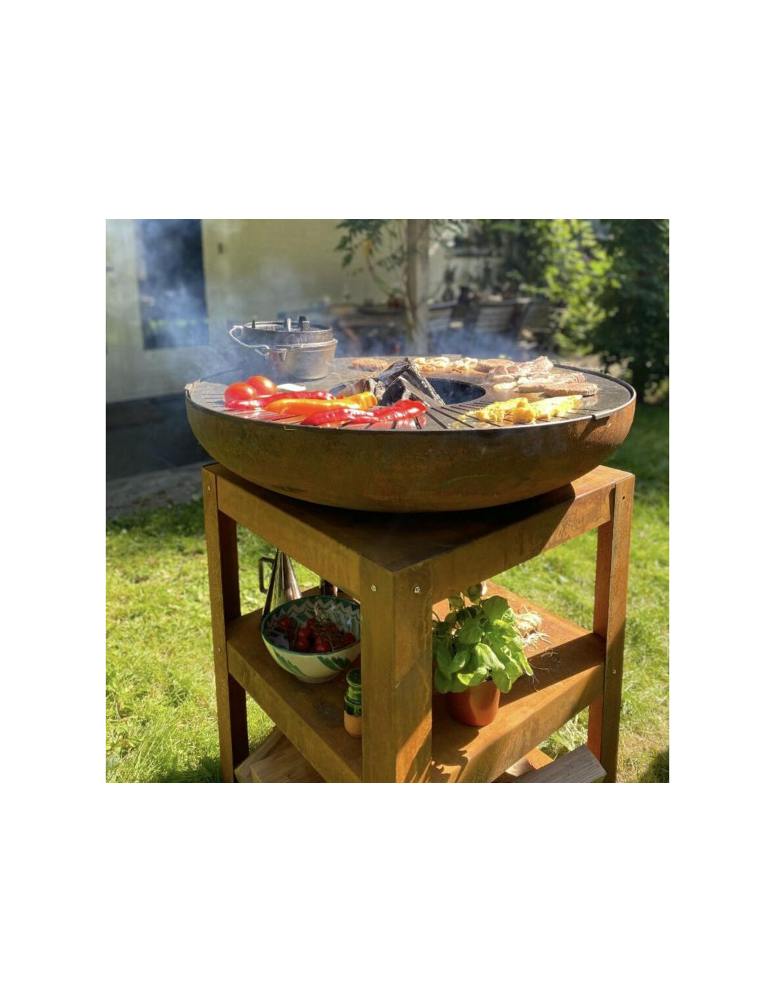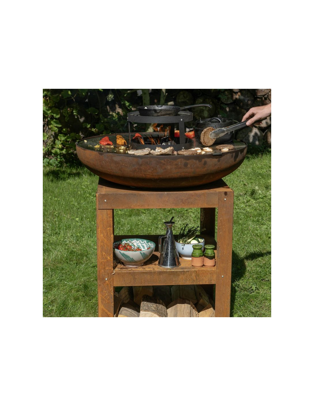 Stabilna, stalowa rama o wymiarach 60 × 60 cm i wysokości 80 cm zapewnia wygodną powierzchnię roboczą, a jednocześnie mieści dwie praktyczne półki na drewno i akcesoria. Kuchnia może być dodatkowo rozbudowana o ruszt typu "turret grill", który zwiększa powierzchnię do grillowania lub umożliwia ustawienie patelni.