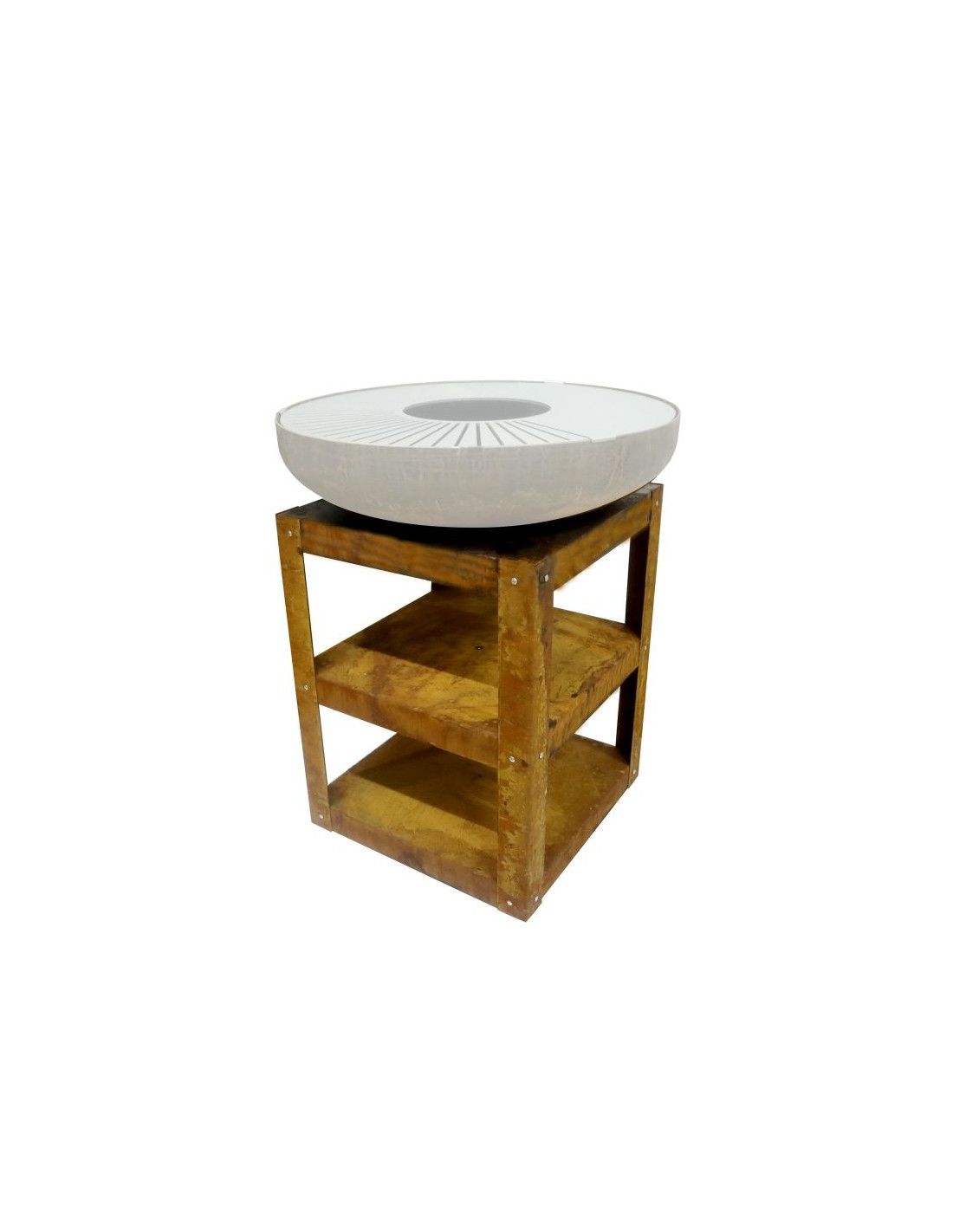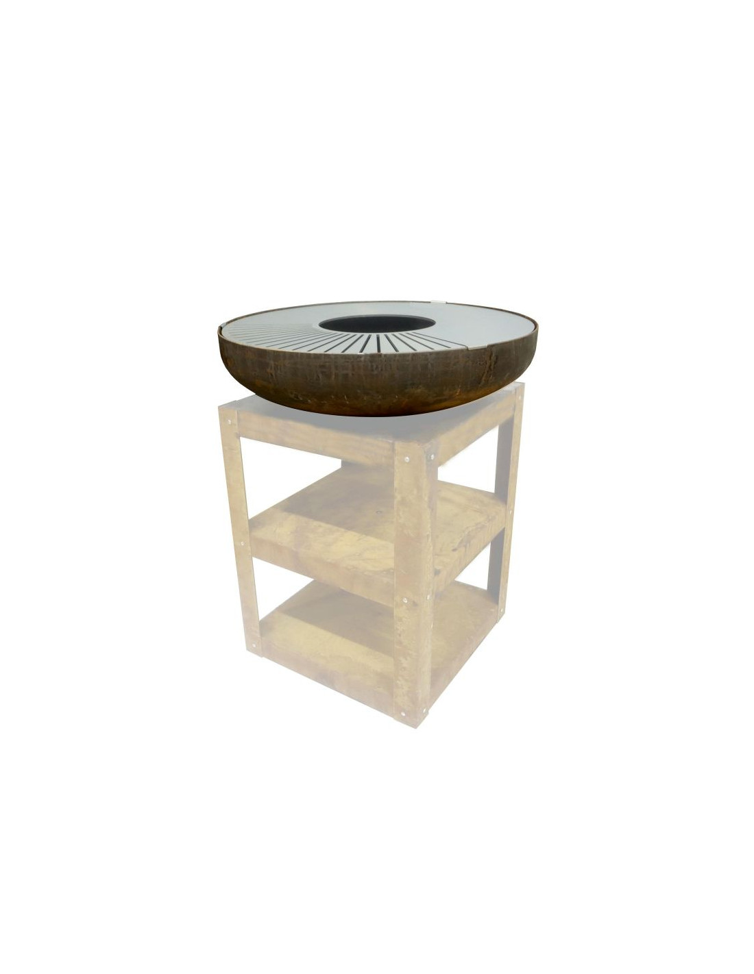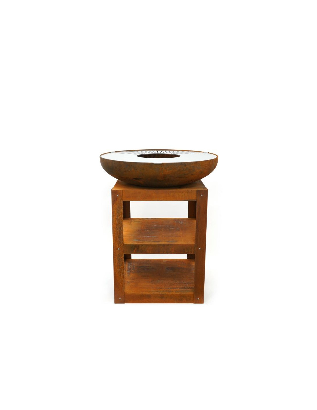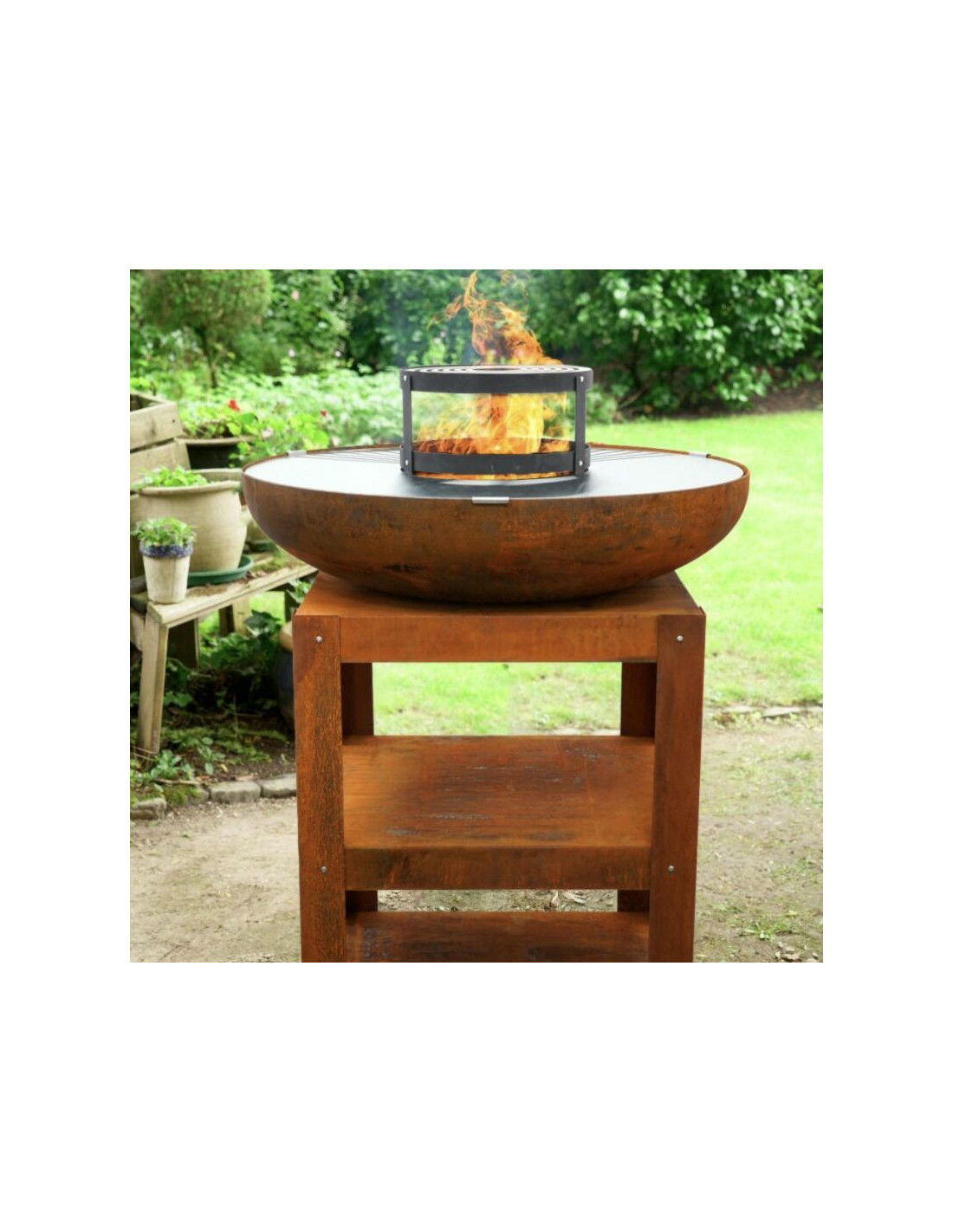 Stabilna, stalowa rama o wymiarach 60 × 60 cm i wysokości 80 cm zapewnia wygodną powierzchnię roboczą, a jednocześnie mieści dwie praktyczne półki na drewno i akcesoria. Kuchnia może być dodatkowo rozbudowana o ruszt typu "turret grill", który zwiększa powierzchnię do grillowania lub umożliwia ustawienie patelni.