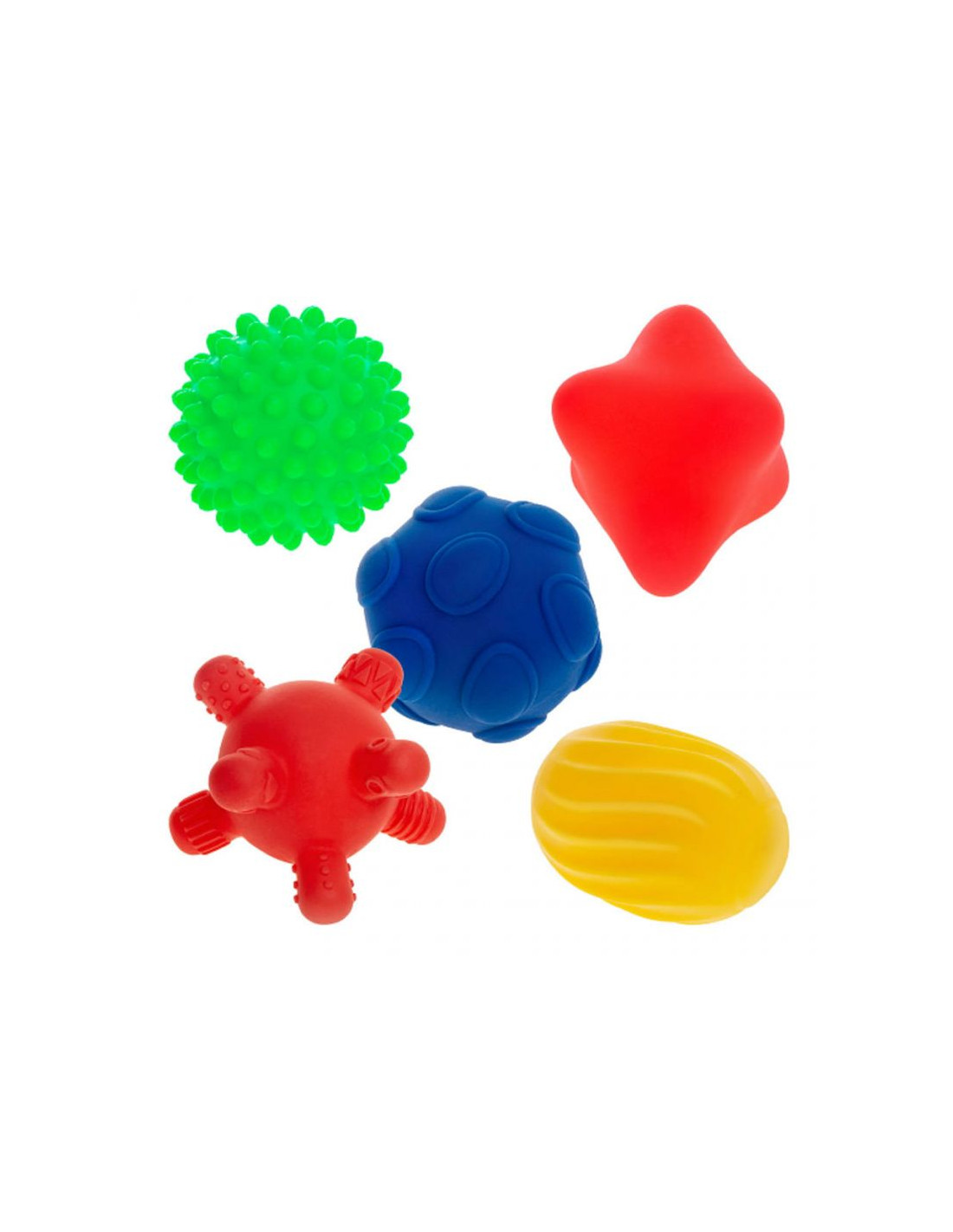 - Zestaw zawiera 5 piłeczek o różnych kształtach i fakturze.