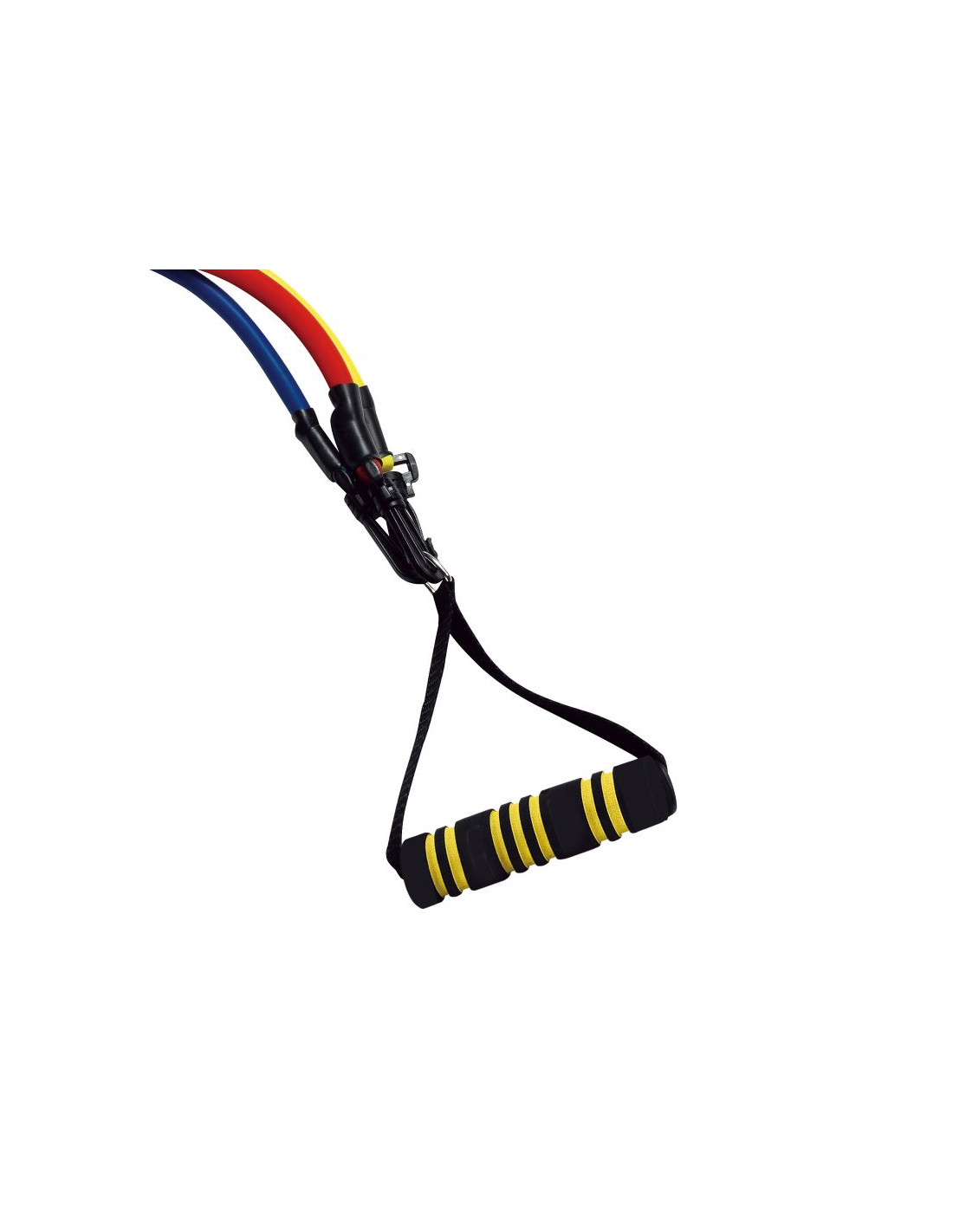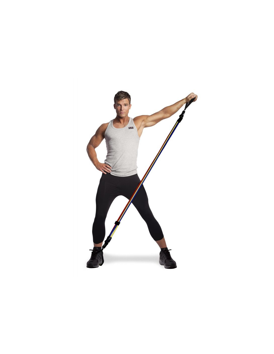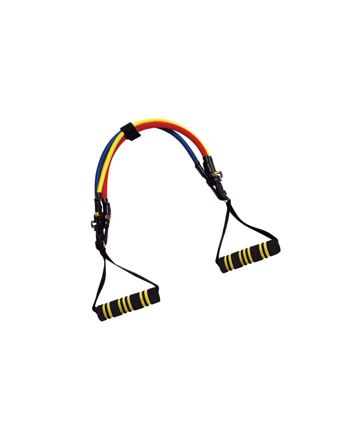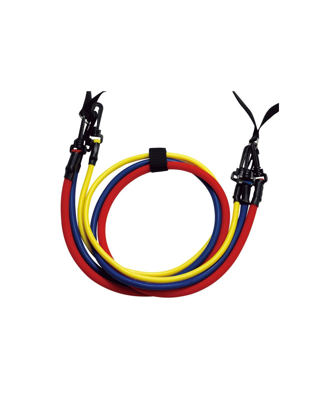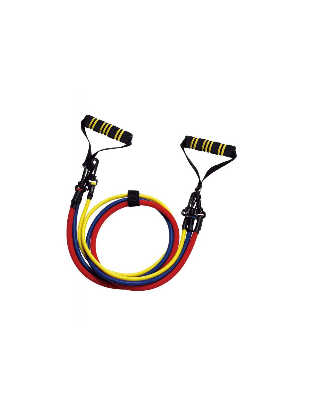 ZESTAW GUM FITNESS zawiera: 3 kolorowe odłączane gumy: czerwoną (2,5 kg), niebieską (1,5 kg) i żółtą (1 kg). Długość gum: 114,3 cm. Regulacja siły oporu możliwa jest dzięki prostemu systemowi odłączania gum.