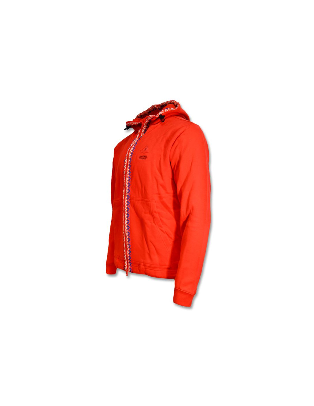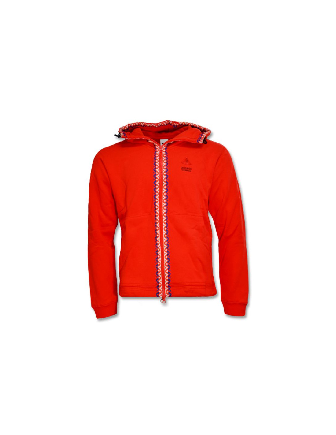Produkt w kolorystyce czerwonej, zdobiony wzdłuż zamka i kaptura, nastomiast na plecach posiada duże logo.