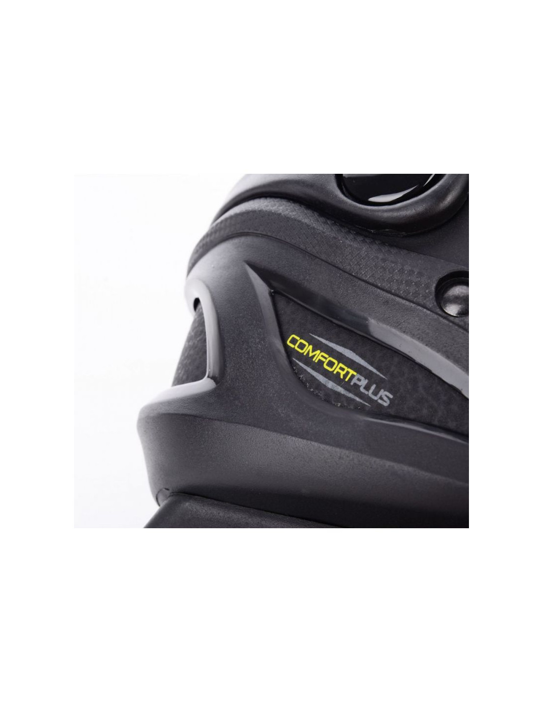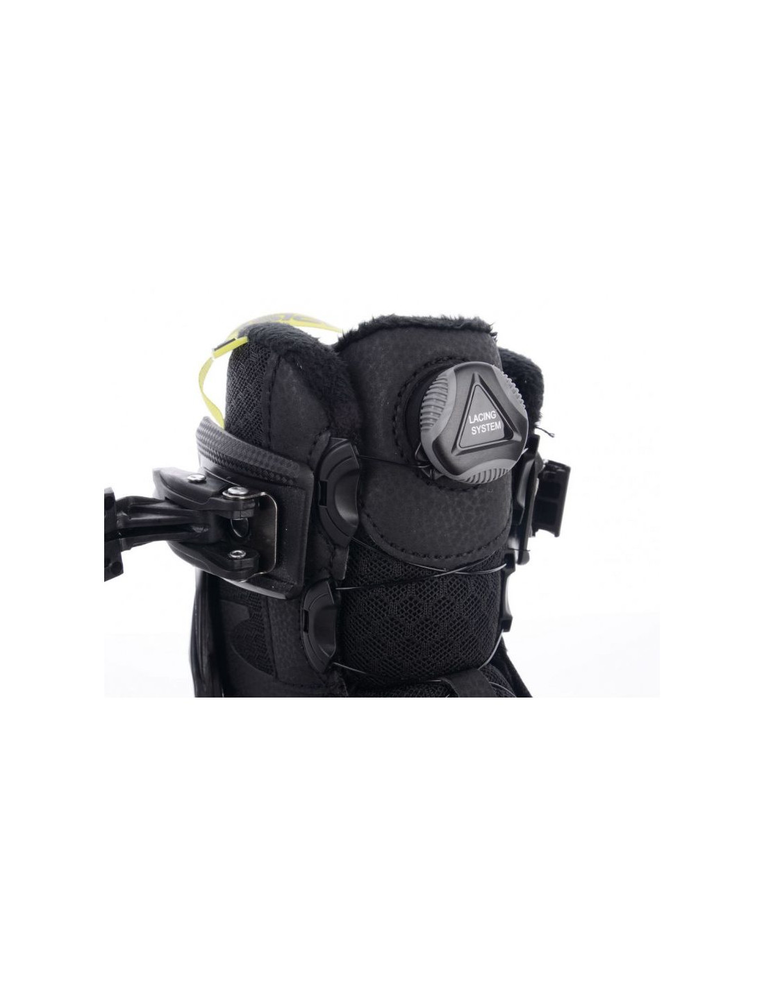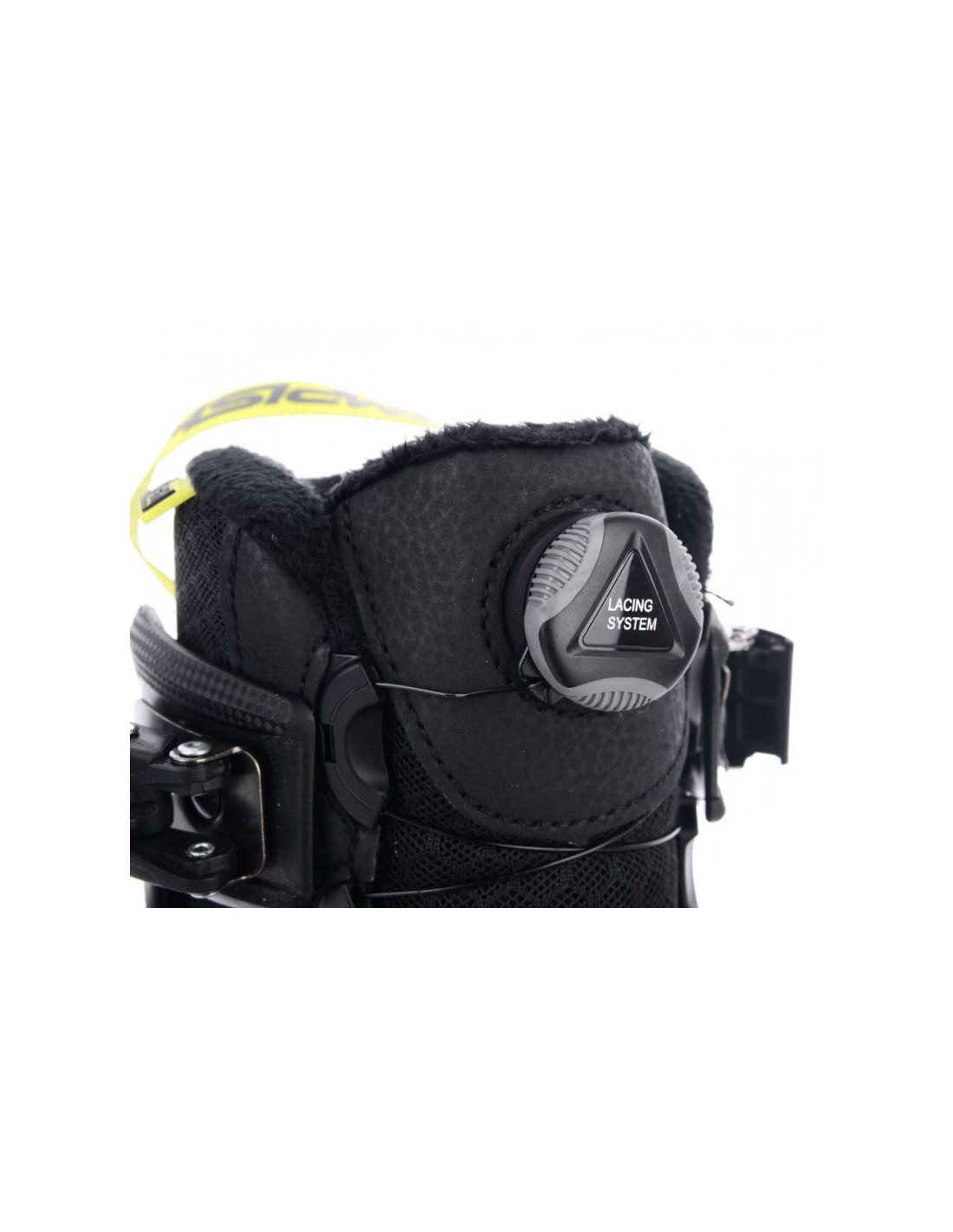 - Górny kołnierz dopasowuje się do stopy za pomocą podwójnej klamry z zamkiem zabezpieczającym.