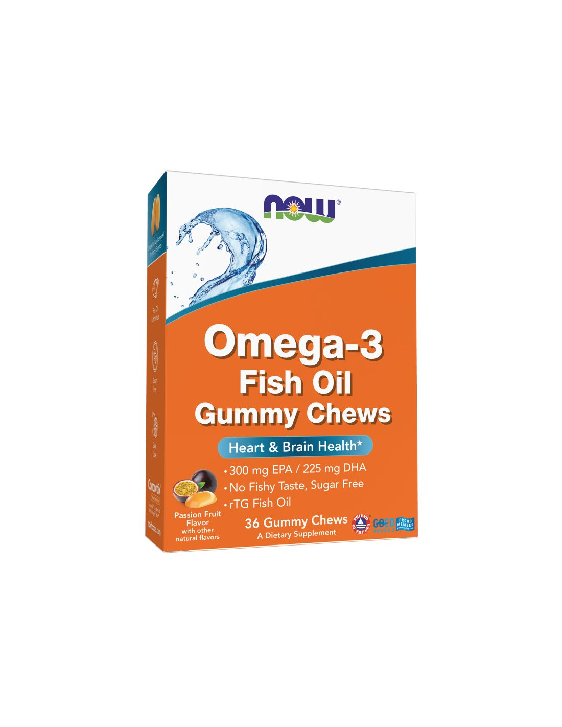 olej z ryb (skoncentrowany) w tym kwasy omega-3: EPA (kwas eikozapentaenowy), DHA (kwas dokozaheksaenowy), woda, substancje słodzące (ksylitol, erytrytol), żelatyna rybia, substancja utrzymująca wilgoć (glicerol), regulatory kwasowości (cytrynian sodu, kwas cytrynowy), substancja zagęszczająca (guma arabska), naturalny aromat pomarańczowy, aromat marakui, aromat cytrynowy, przeciwutleniacze (kwas L-askorbinowy, mieszanina tokoferoli), substancja słodząca (glikozydy stewiolowe ze stewii (E 960a)), barwnik (ekstrakt z papryki).