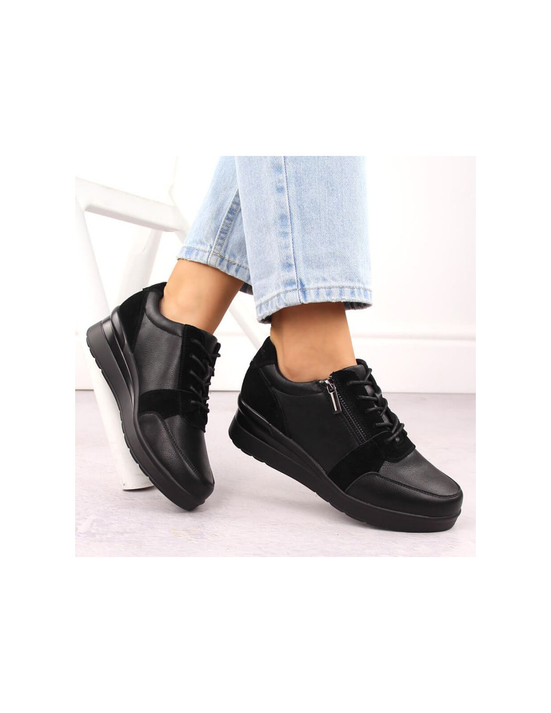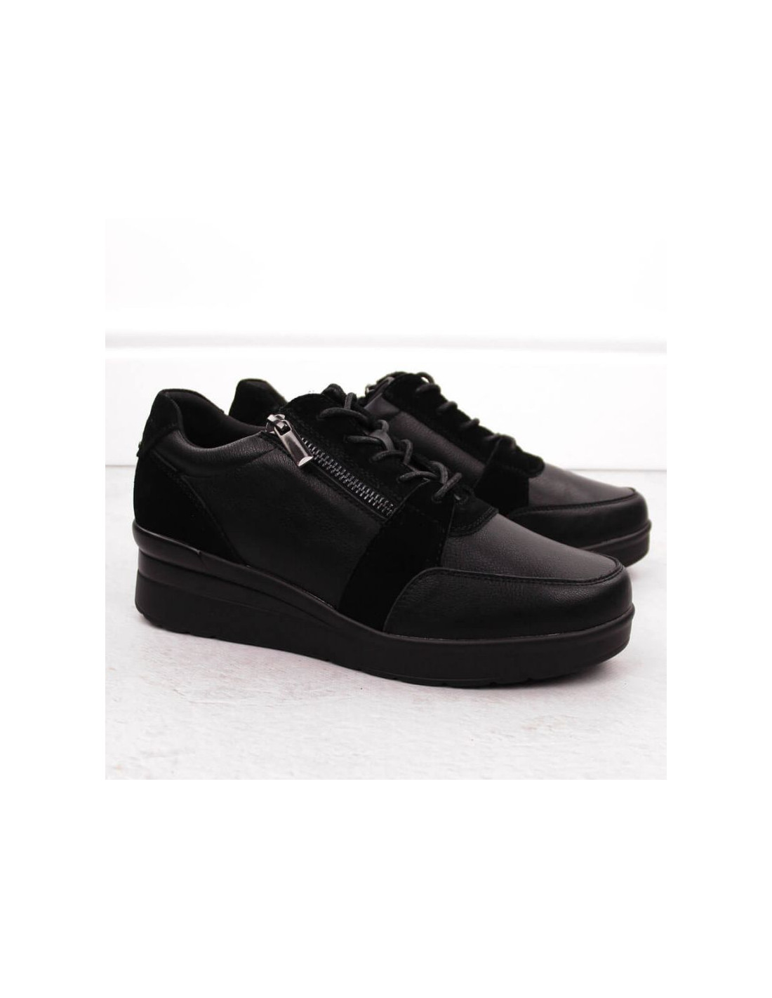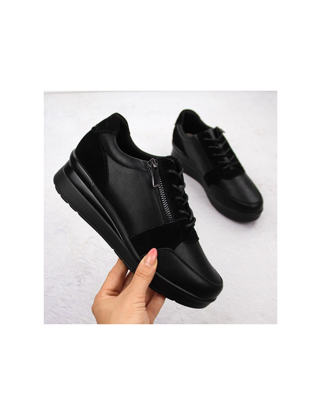 Skórzane sneakersy damskie na koturnie czarne sergio leone pb236-s