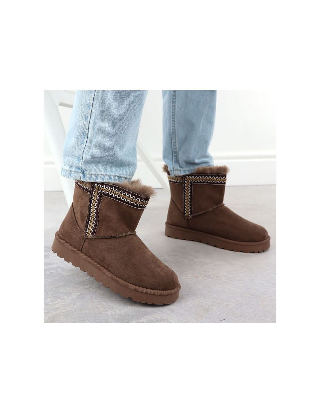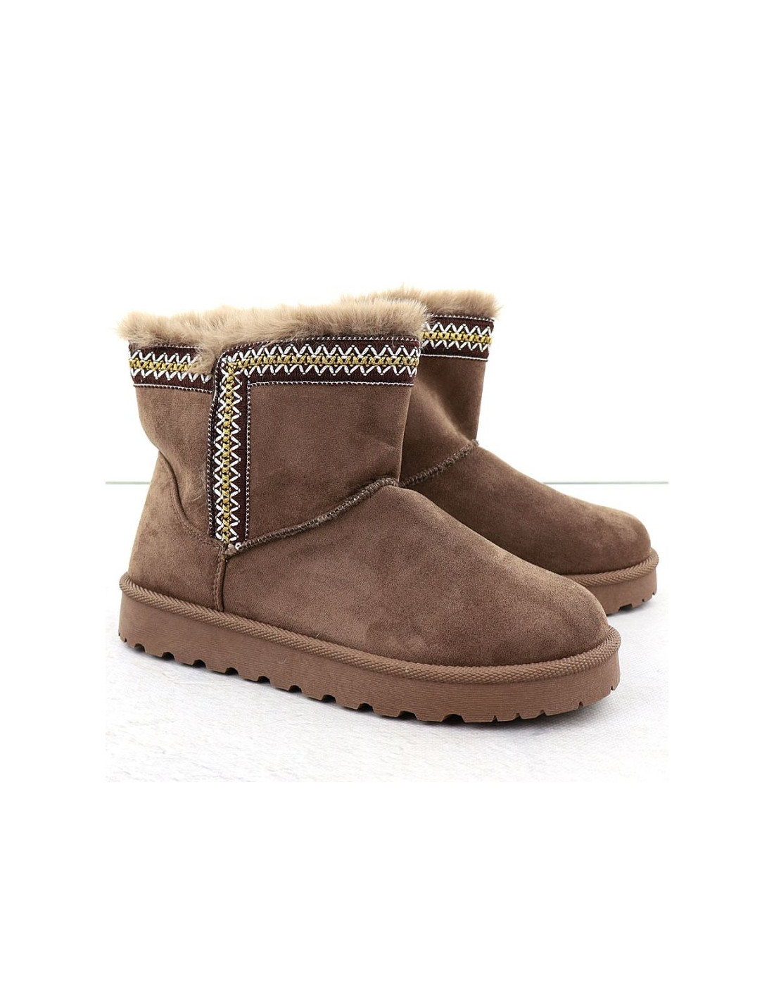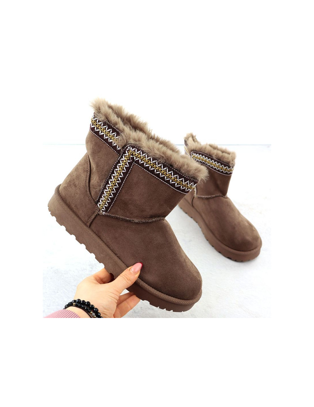 Modne śniegowce wykonane są z wysokojakościowej zamszowej skóry ekologicznej. Buty posiadają grubą podeszwę izolującą od zimna. Wyściółka oraz wkładka są ocieplone przyjemnym w dotyku futerkiem.