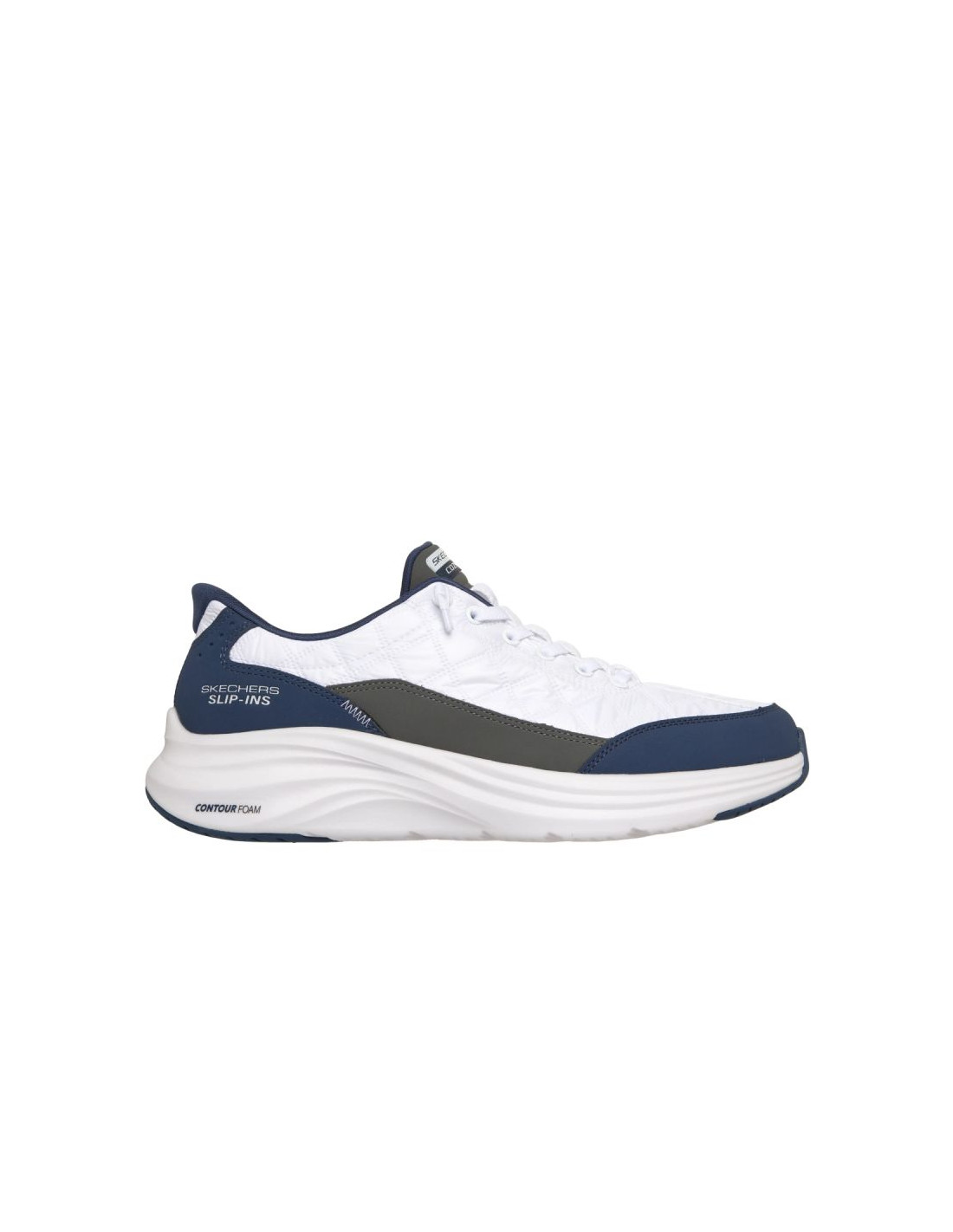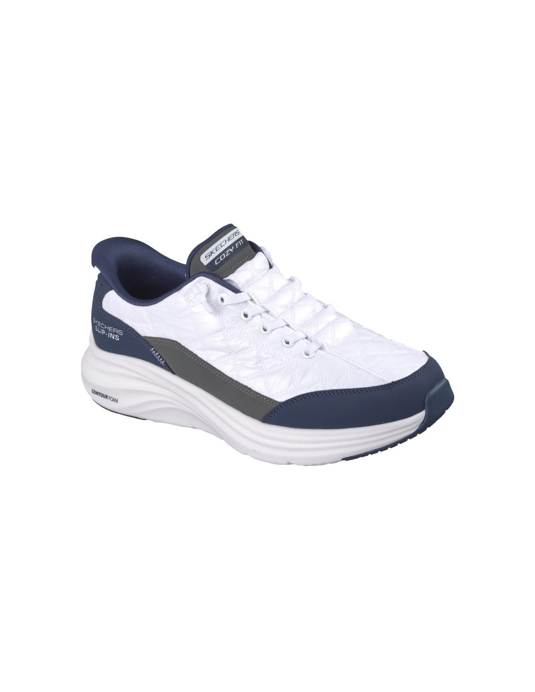 Otul stopy nieskrępowanym komfortem, nosząc Skechers Hands Free Slip-ins®: Contour Foam™ – Cozy Fit™. Wegański model wsuwany z naszą wyjątkową Heel Pillow™, pikowaną cholewką Cozy Fit™ z syntetycznymi nakładkami i podwiązanymi, elastycznymi sznurówkami, amortyzacją podeszwy środkowej Contour Foam™ oraz wkładką z naszą autorską amortyzacją Skechers Air-Cooled Memory Foam™.
