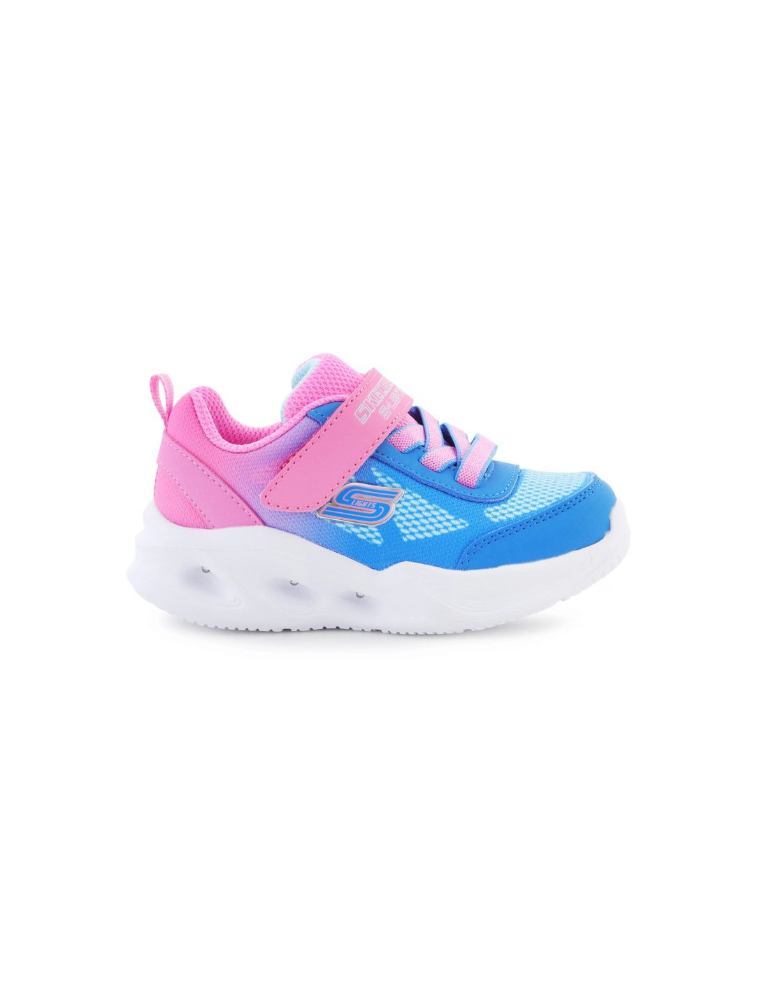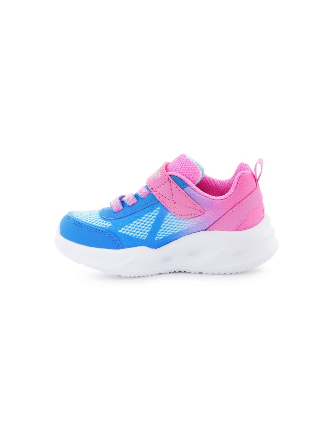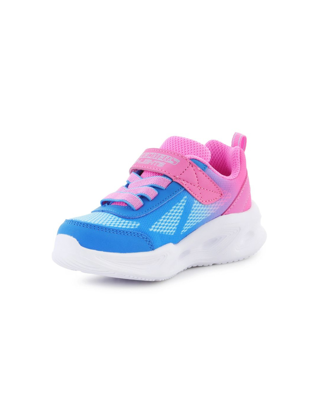 Model Skechers S Lights Sola Glow – Ombre Deluxe to dziecięce sneakersy, które zachwycają nie tylko wyglądem, ale też funkcjonalnością. Wyjątkowy, cieniowany kolor hot pink i błękitu przyciąga wzrok, a wbudowane światełka w podeszwie rozświetlają każdy krok dziecka. Elastyczne sznurowanie i pasek na rzep zapewniają szybkie i wygodne zakładanie. Miękka wkładka i lekka podeszwa zapewniają komfort przez cały dzień, zarówno podczas zabawy, jak i spacerów.