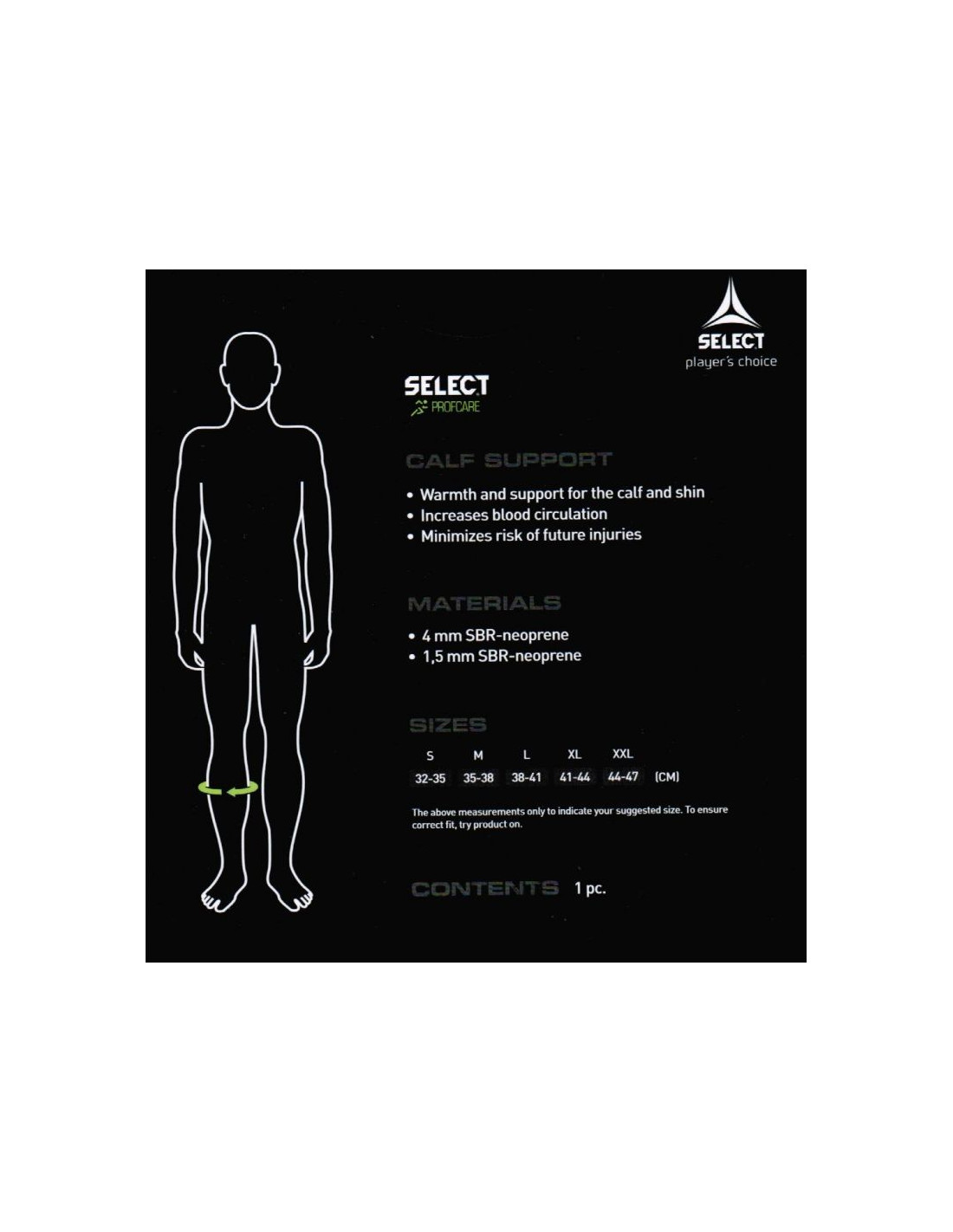 Ochraniacz łydki z częścią przednią z 1,5 mm SBR-neoprenu, z częścią tylną z 4 mm SBR-neoprenu, zapewniający znaczne ciepło łydki, a także doskonałą ochronę. Poprawia krążenie, co pomaga w łagodzeniu nadwyrężeń i bólu po nadmiernym wysiłku.