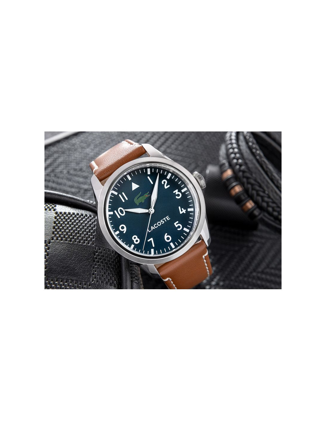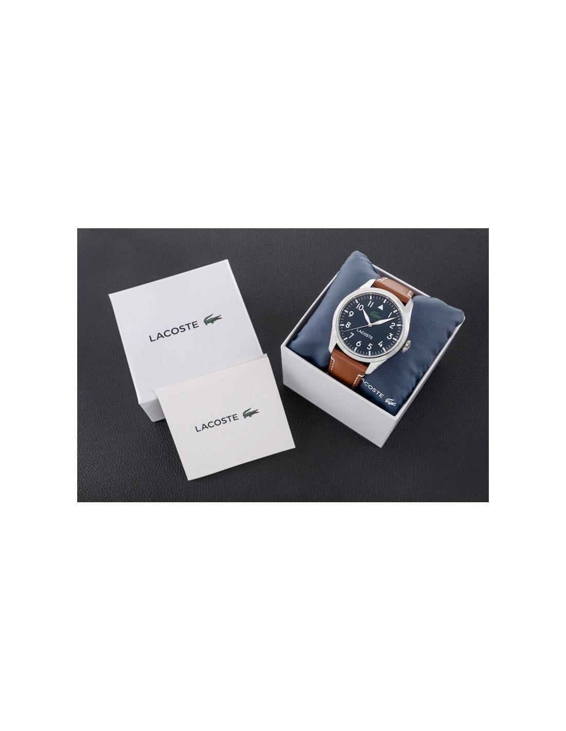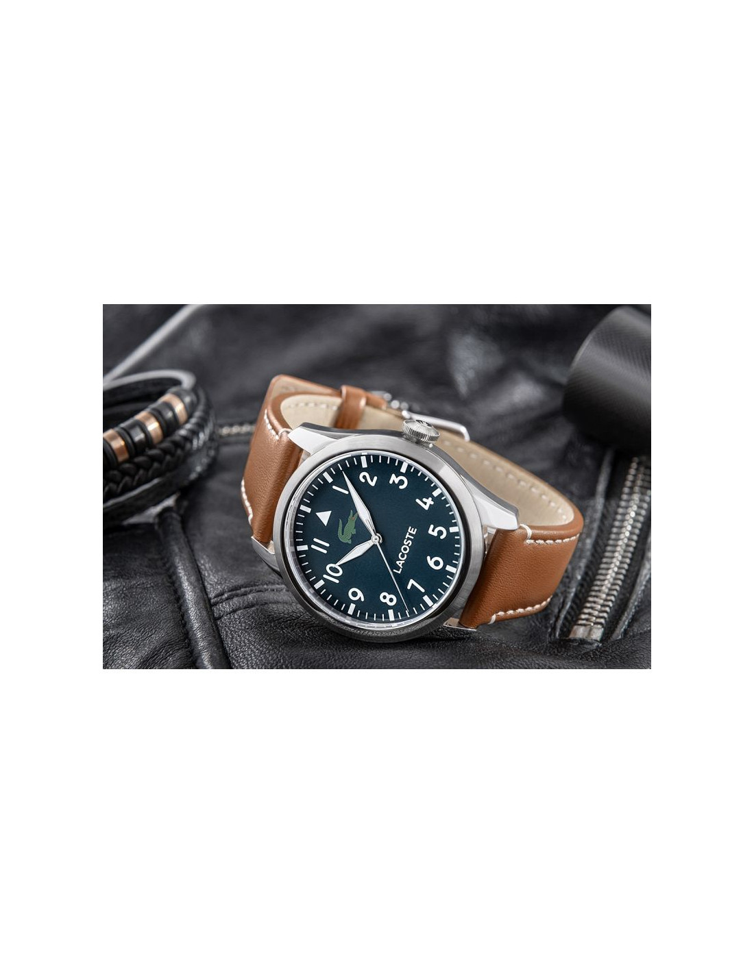 Ten zegarek to prawdziwy gracz z charakterem. Granatowa tarcza? Głęboka i pewna siebie, tworzy tło, które mówi: „sprawdzaj czas, ale rób to z klasą”. Białe cyfry arabskie są jak wojskowe oznaczenia – konkretne, mocne, nie do przeoczenia, idealne dla faceta, który nie marnuje ani sekundy. Biało-srebrne wskazówki odbijają światło jak ostrze, dając subtelny błysk przy każdym ruchu – bo zegarek ma żyć razem z Tobą.A krokodyl Lacoste w intensywnej zieleni? To nie tylko logo, to symbol, który przypomina, że pod tą elegancką powłoką czai się dzikość i nieokiełznana energia. Brązowy, skórzany pasek z białymi przeszyciami to coś jak klasyczna kurtka skórzana – ciepła, stylowa, ale z pazurem, gotowa na każde wyzwanie. To zegarek dla faceta, który łączy elegancję z luzem, zawsze gotowy na nowe wyzwania, ale nie tracący przy tym klasy.