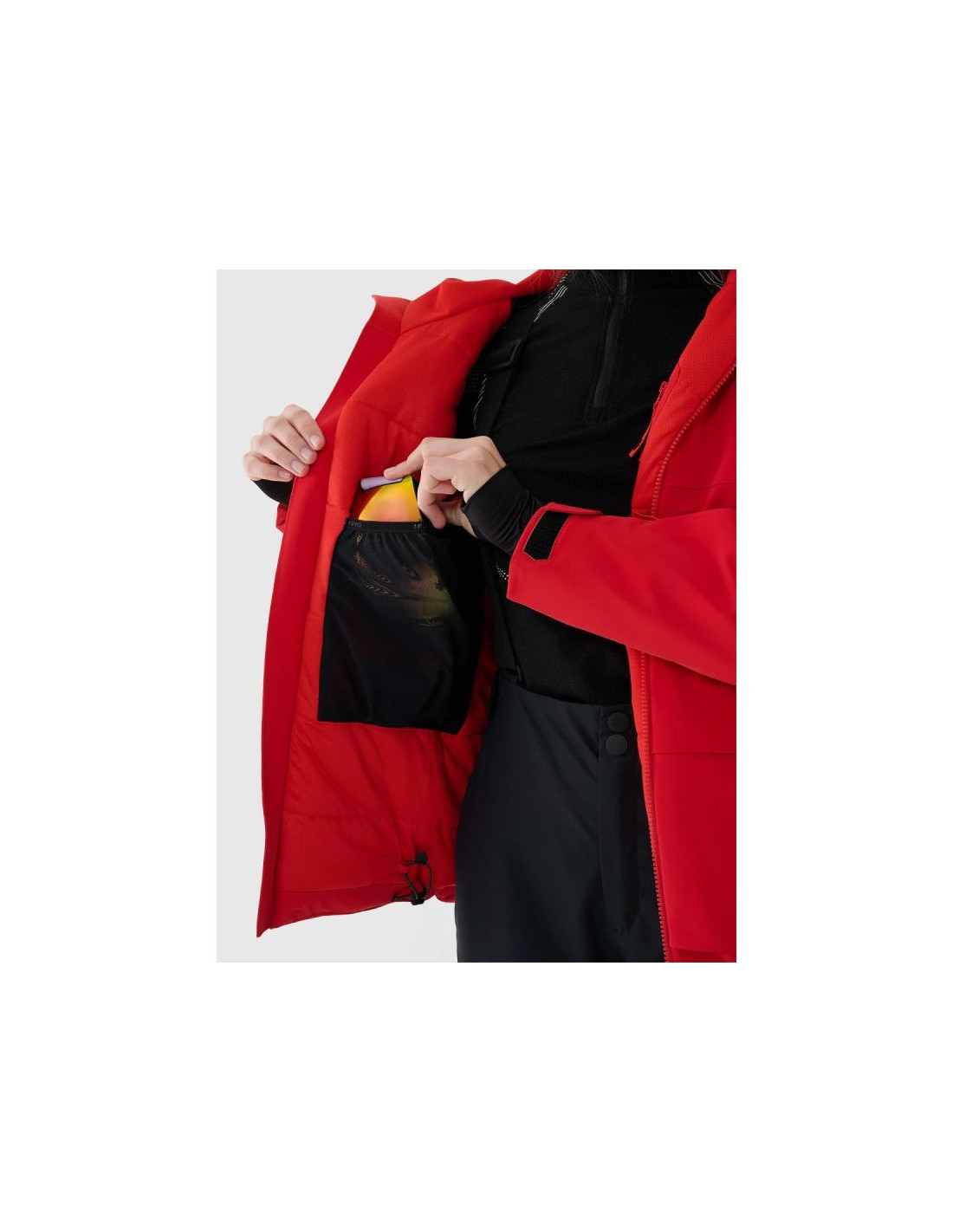 - Kieszeń na gogle + ściereczka – wewnątrz kurtki