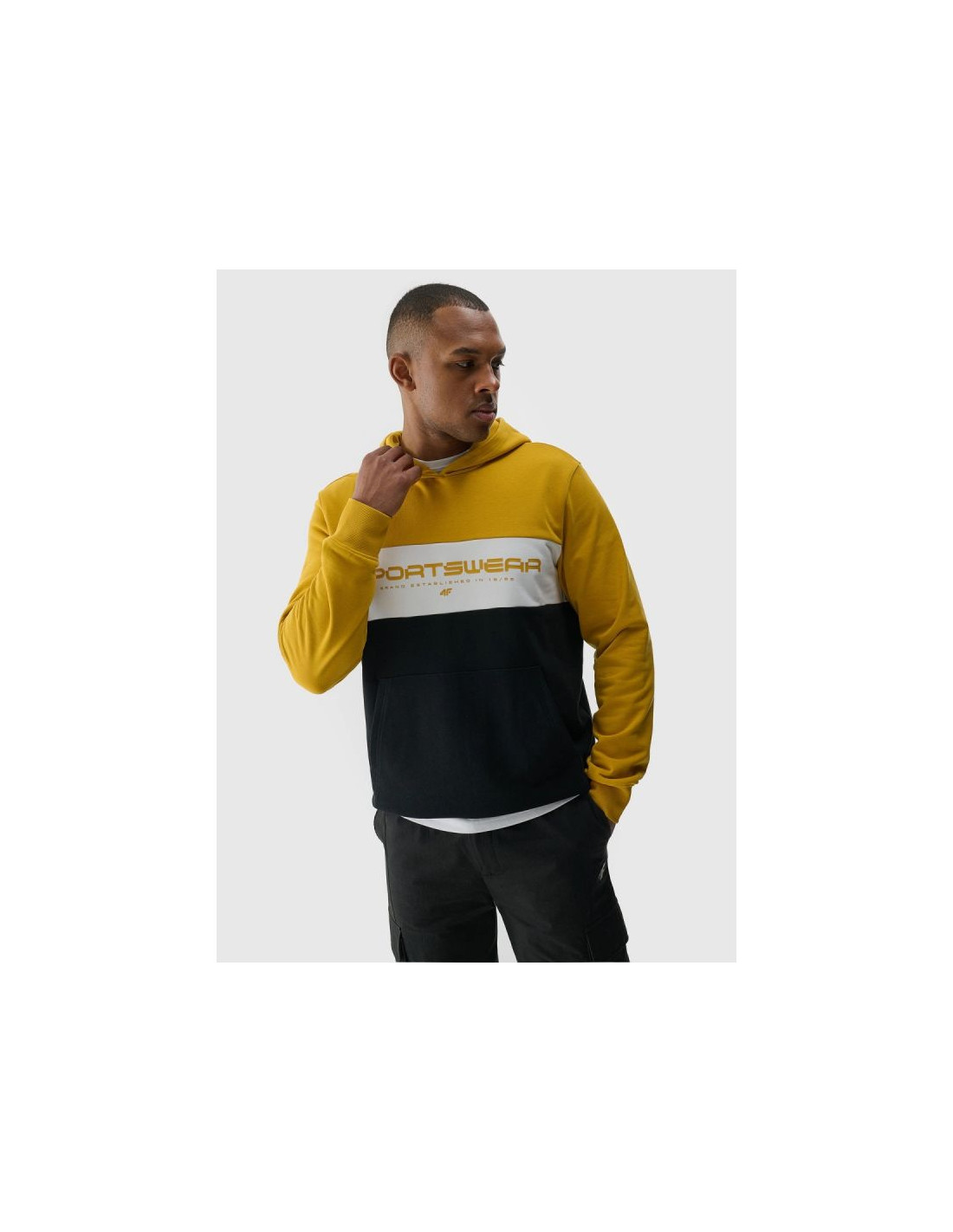 Bluza dresowa męska z kapturem 4F z linii COLOUR BLOCKING to połączenie miejskiego stylu inspirowanego współczesną architekturą oraz codziennego komfortu użytkowania. Charakterystyczne bloki kolorów w odcieniach granatu, szarości, żółci i brązu, uzupełnione wyrazistym nadrukiem typograficznym „Sportswear”, podkreślają nowoczesny, streetwearowy charakter bluzy. Krój regular zapewnia wygodne dopasowanie do sylwetki, a dzianina dresowa french terry – gładka na zewnątrz i z pętelkowym splotem od wewnątrz – jest miękka, lekka i bardziej przewiewna, dzięki czemu bluza sprawdzi się zarówno w stylizacjach casualowych, jak i sportowych. Średnia gramatura 340 gsm daje przyjemne poczucie jakości bez nadmiernego obciążenia, a wysoka zawartość bawełny (79%) gwarantuje komfort noszenia, trwałość i przyjemność w dotyku. Zintegrowany kaptur, kieszeń kangurka oraz elastyczne ściągacze zwiększają funkcjonalność na co dzień.
