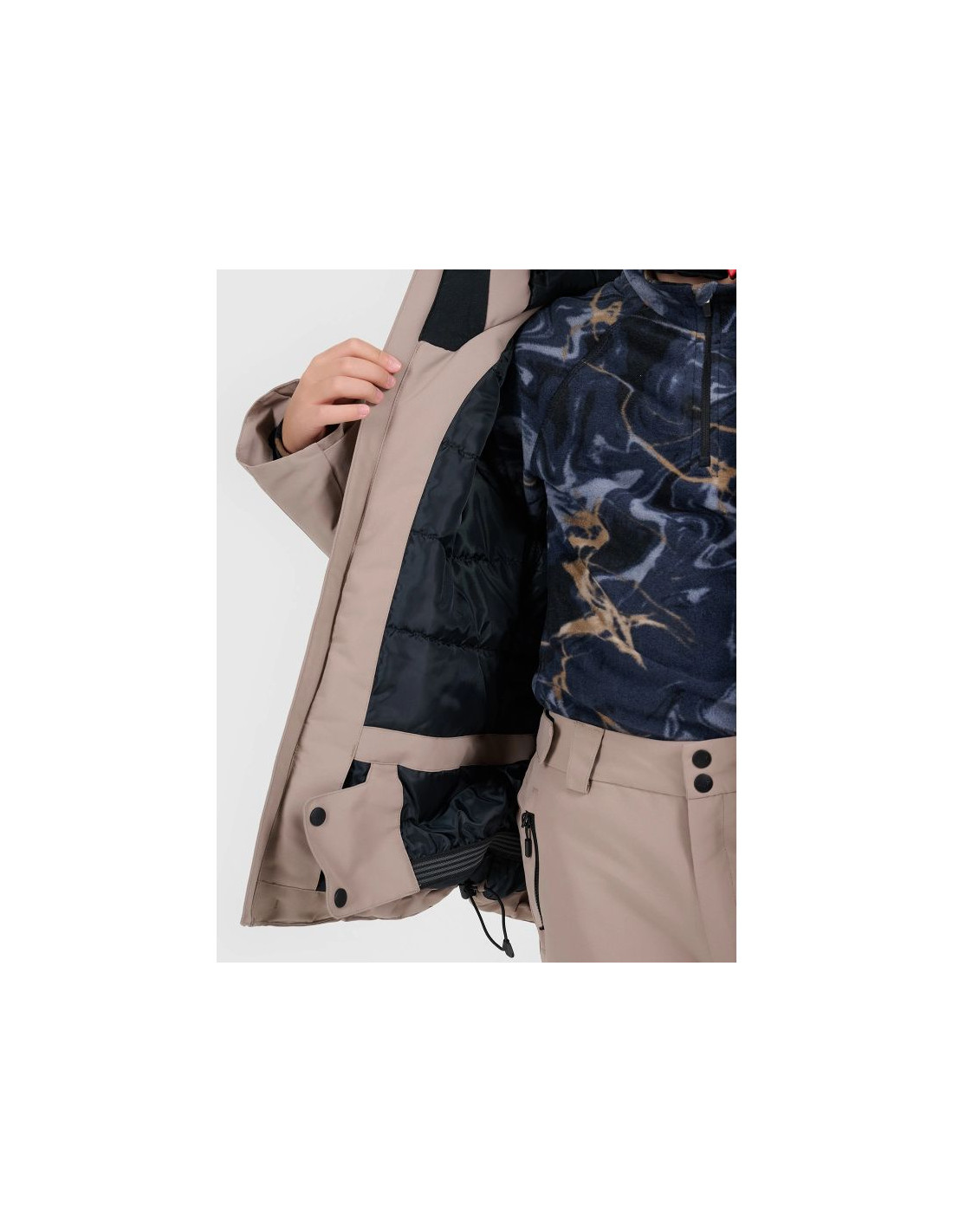 Do dyspozycji są kieszenie boczne na zamek, dodatkowa kieszeń na rękawie, kieszeń ski pass oraz wewnętrzna kieszeń na gogle, które pozwalają bezpiecznie przechować najpotrzebniejsze rzeczy na stoku.