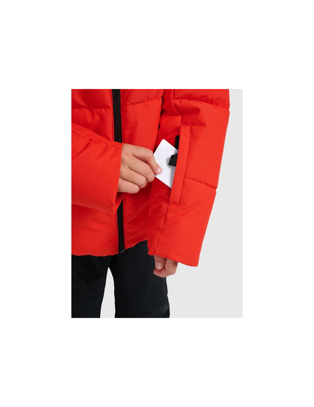 Funkcjonalne detale, takie jak jednokierunkowy zamek główny, boczne kieszenie na zamek oraz kieszeń na ski pass, ułatwiają użytkowanie na stoku. Elementy odblaskowe poprawiają widoczność przy słabym oświetleniu.