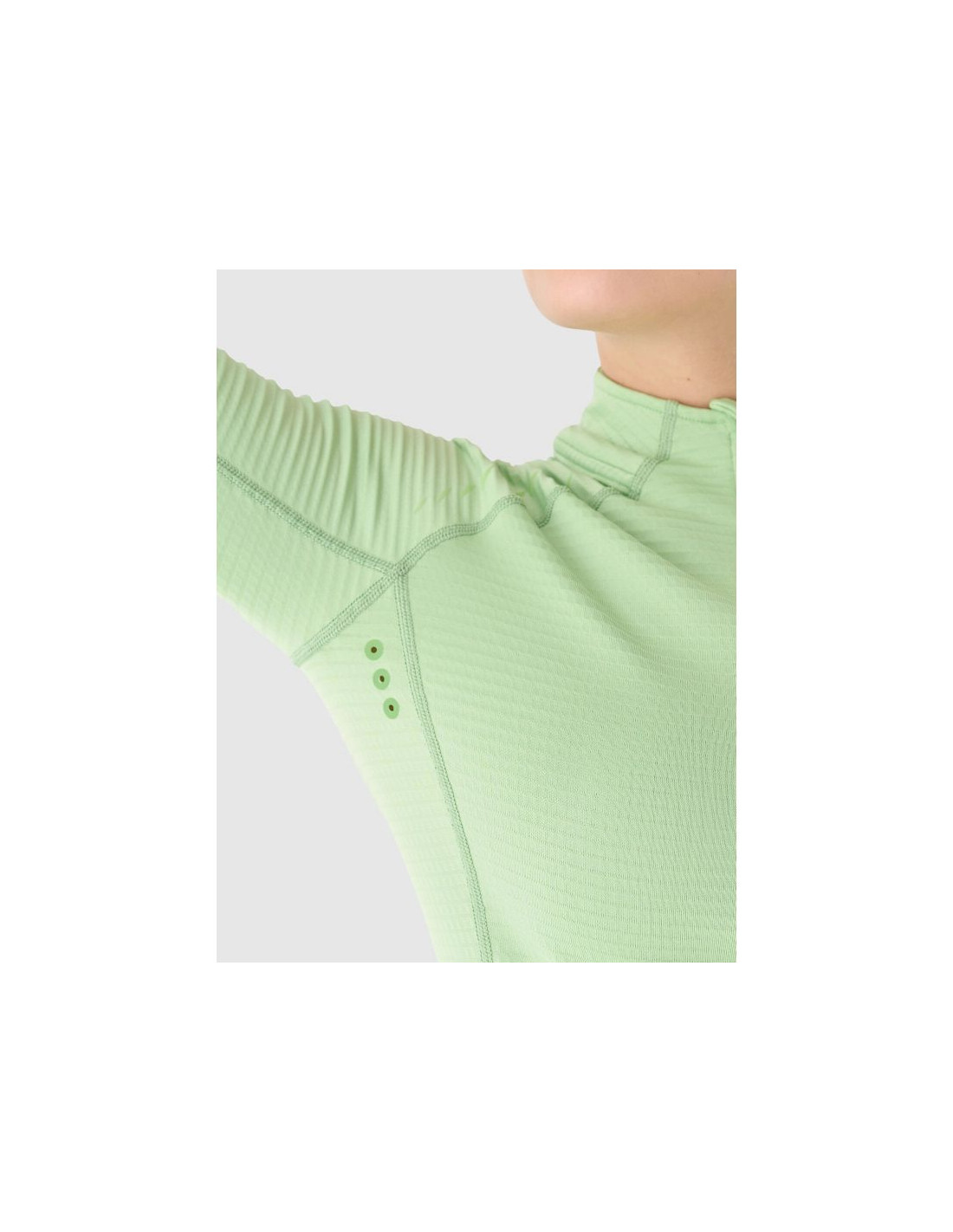Stójka pod szyją zapinana na zamek umożliwia regulację wentylacji, a laserowo cięte otwory pod pachami usprawniają przepływ powietrza. Raglanowe rękawy wspierają naturalny zakres ruchów, a elementy odblaskowe poprawiają widoczność po zmroku. Klasyczny fason bez kieszeni oraz konstrukcja wkładana przez głowę podkreślają sportowy, minimalistyczny charakter.