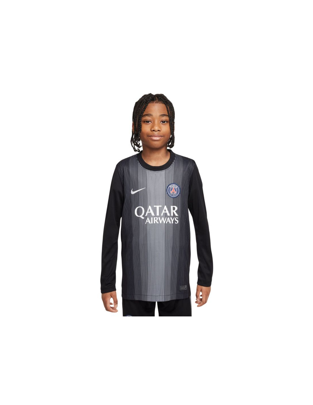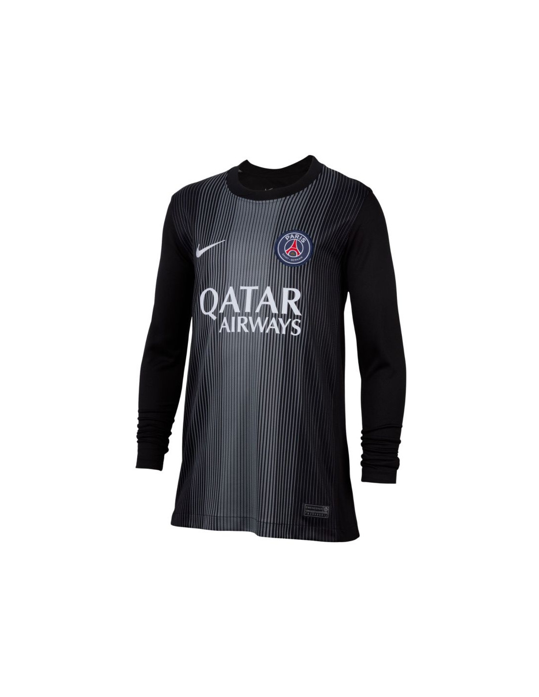 Koszulka dla dzieci Nike PSG Goalkeeper Stadium 2025/26 czarna HJ5267 010 Wkładając koszulkę drużyny Paris Saint-Germain Twoje dziecko będzie mogło się upodobnić wyglądem do jej bramkarza. Standardowy krój z długimi rękawami. Technologia Nike Dri-FIT odprowadza nadmiar wilgoci. Koszulka ma detale wzorowane na strojach, które nosi drużyna. Materiał: 100% poliester