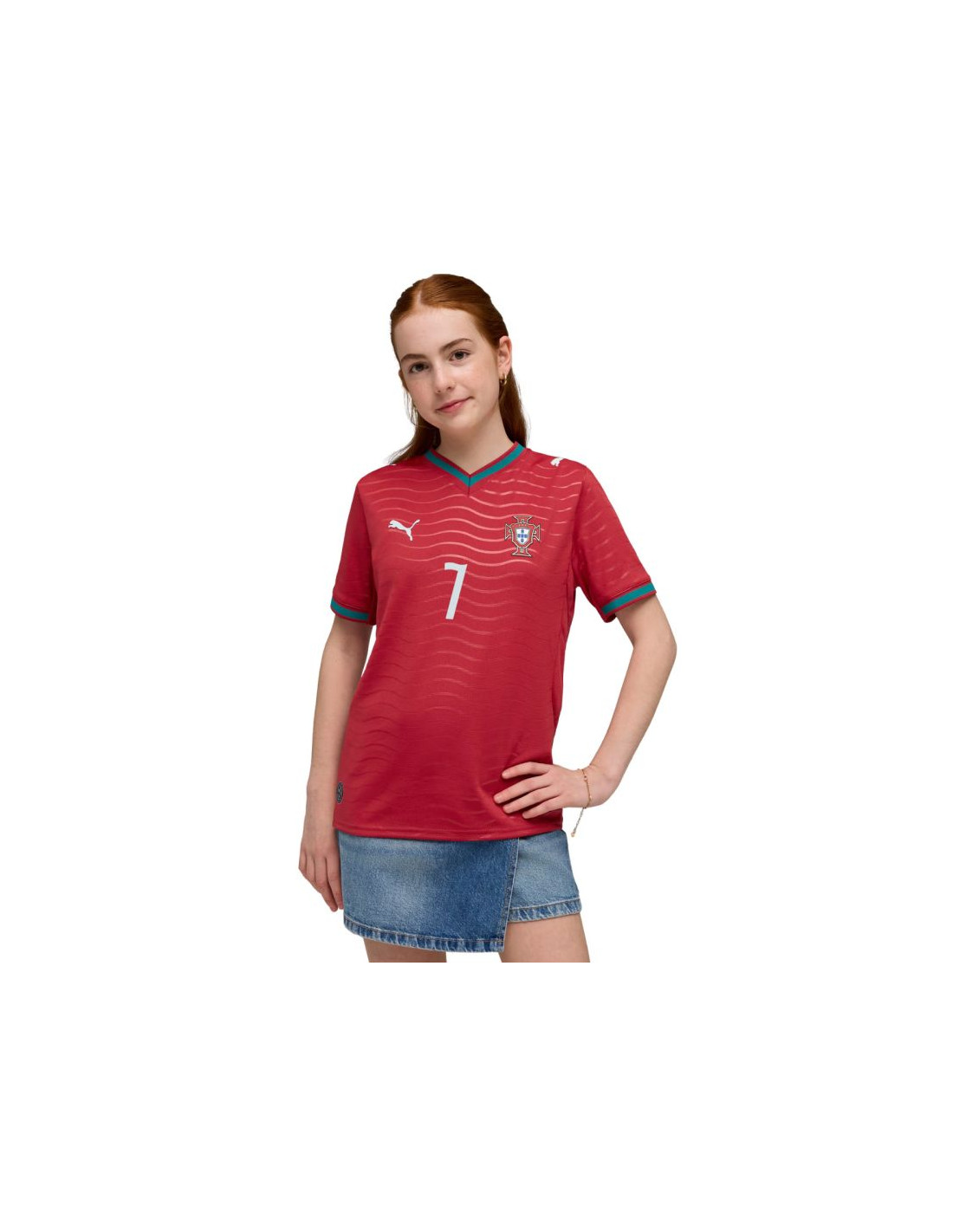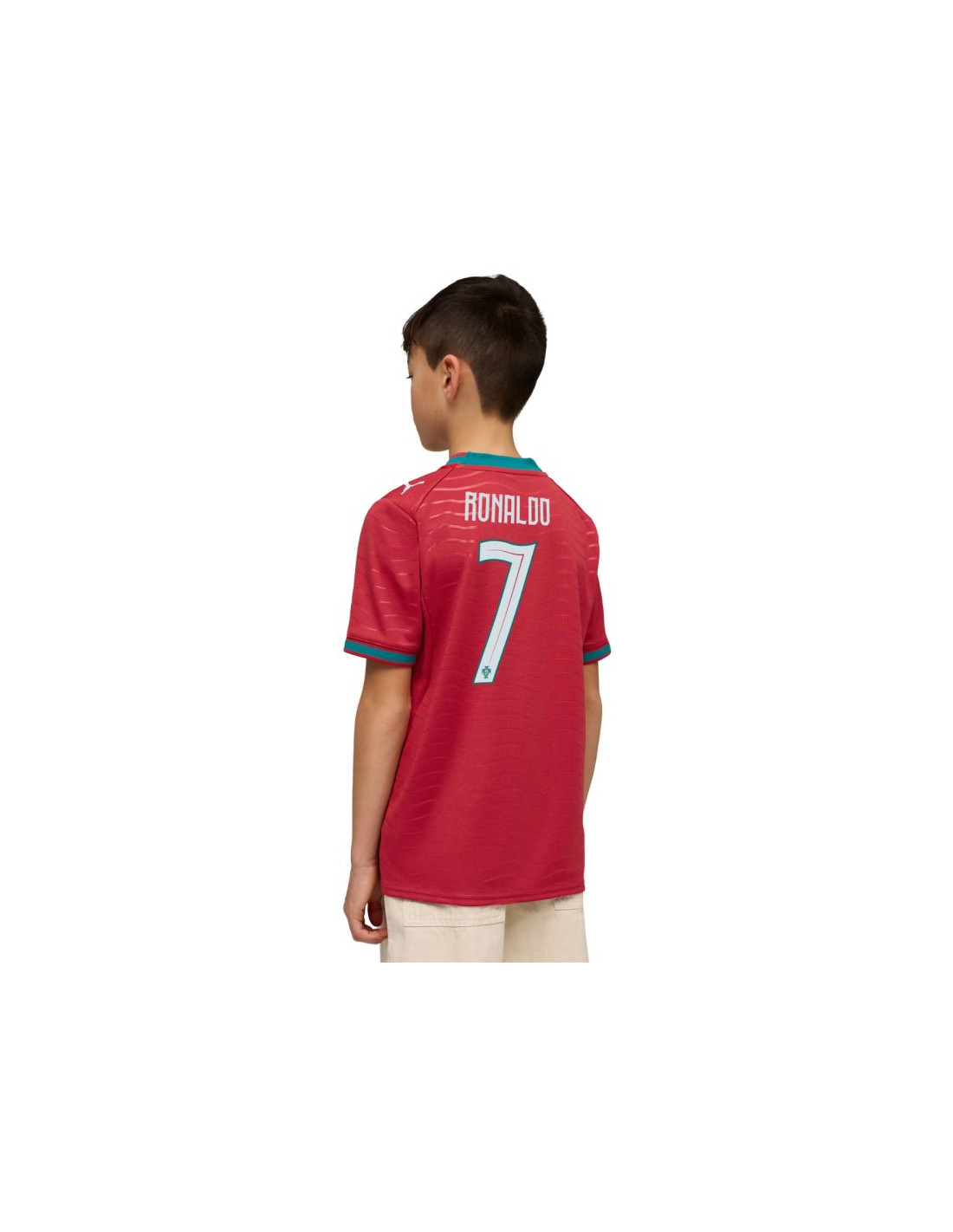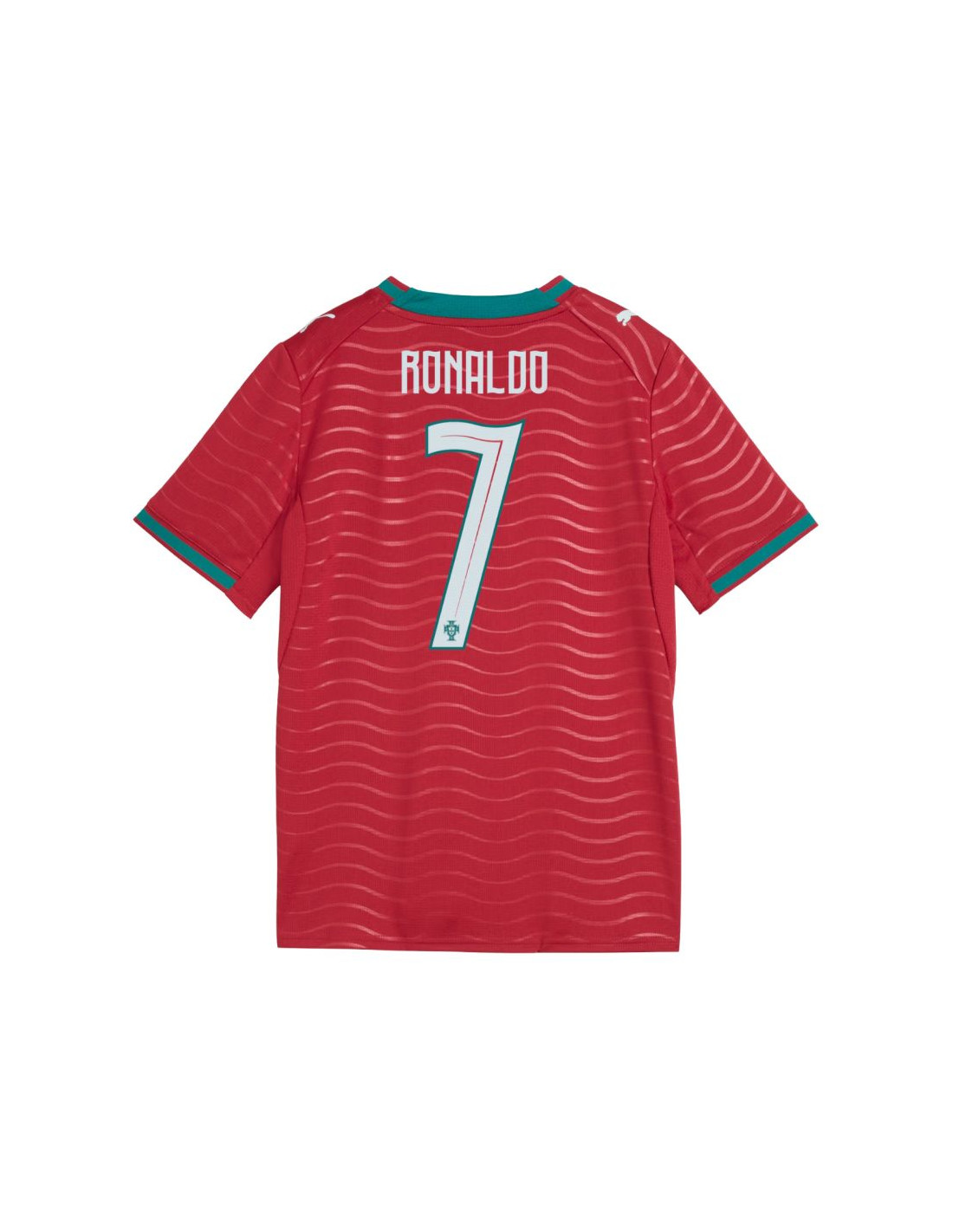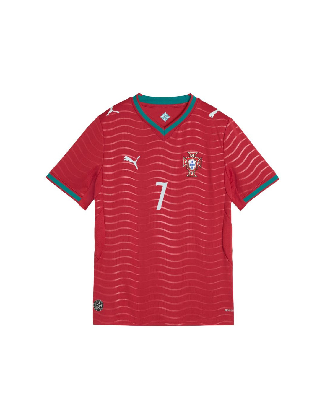 Koszulka dla dzieci Puma FPF Home Jersey Replica 788144 77 Koszulka dla dzieci Puma pozwoli pokazać, że kibicujesz reprezentacji Portugalii. Godło klubowe oraz nazwisko i numer Ronaldo. Standardowy krój. Technologia DryCell. Siateczkowe panele. Replika. Materiał: 100% poliester