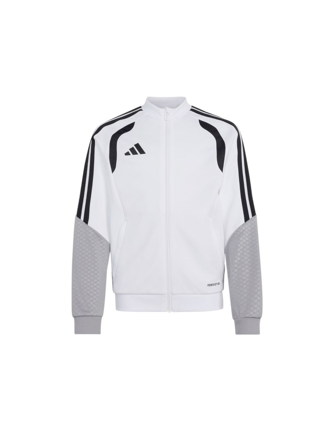 Bluza dla dzieci adidas Tiro 26 Competition Training biało-szara KA7716 Bluza piłkarska adidas przeznaczona dla dzieci sprawdzi się podczas treningów. Stójka. Długi zamek wykończono patką chroniącą podbródek. Dopasowany krój. Technologia Formotion zadba o jeszcze lepszą mobilność. Siateczkowe panele umieszczone na klatce piersiowej. Paski w górnej części rękawów. Mankiety wykończone elastycznymi ściągaczami. Wytłoczone elementy na ramionach i bokach. Materiał: 100% poliester z recyklingu