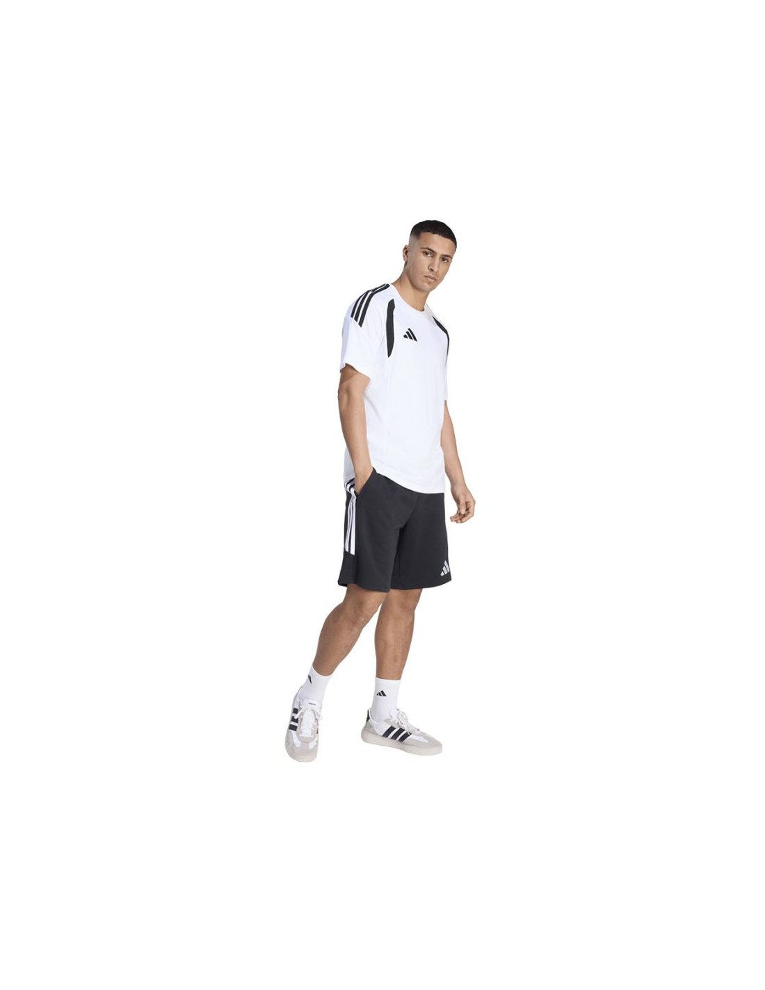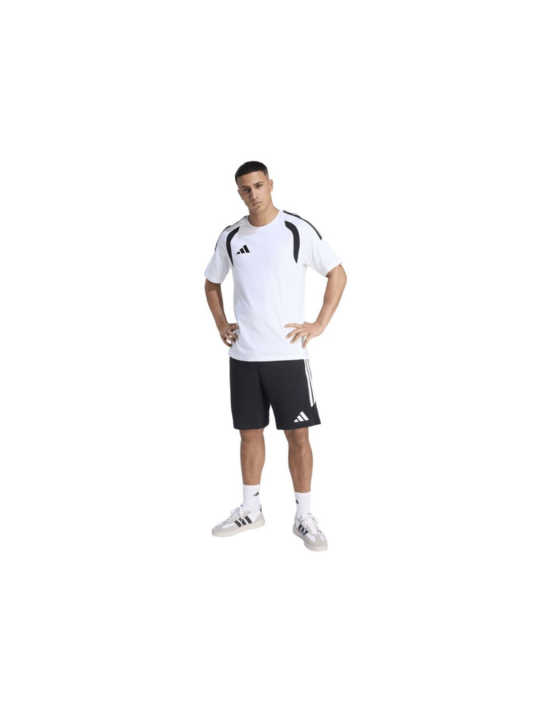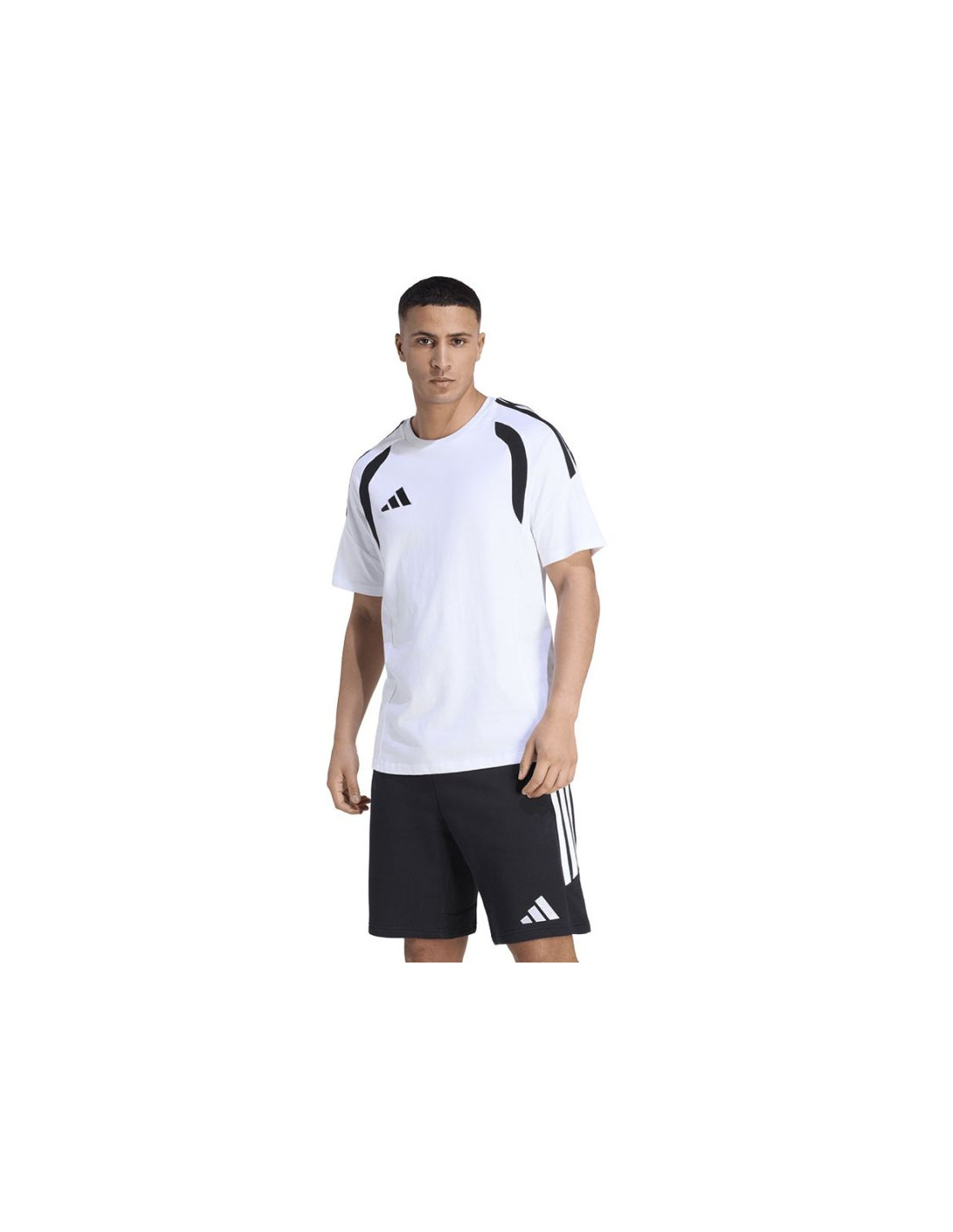 Koszulka męska adidas Tiro 26 League Tee biało-czarna KC3698 Koszulka męska adidas sprawdzi się podczas odpoczynku poza linią boiska. Model z linii Tiro jest inspirowany światem piłki nożnej. Haftowane logo adidas i 3 paski. Kontrastowe wstawki na klatce piersiowej. Miękki, bawełniany materiał. Regularny krój. Materiał: 100% bawełna