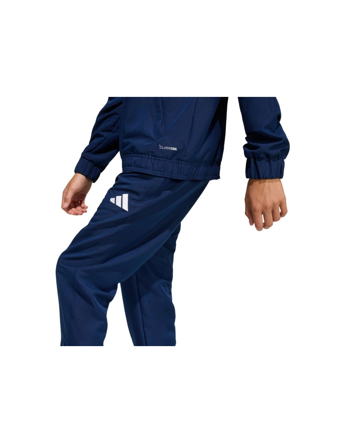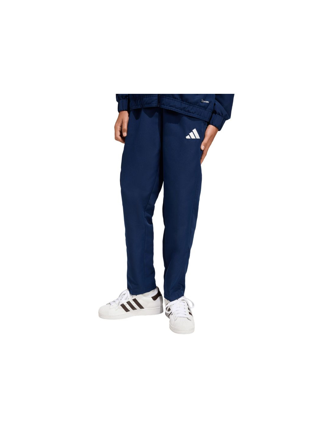 Spodnie dla dzieci adidas Entrada 26 Presentation granatowe JZ9128 Piłkarskie spodnie dla dzieci adidas z piłkarskiej linii Entrada. Uszyte z tkaniny o płóciennym splocie. Regularny krój. Średni stan i sznurek do regulacji w talii. Technologia Climcool skutecznie odprowadza wilgoć. Zamki u dołu nogawek. Materiał: 100% poliester z recyklingu