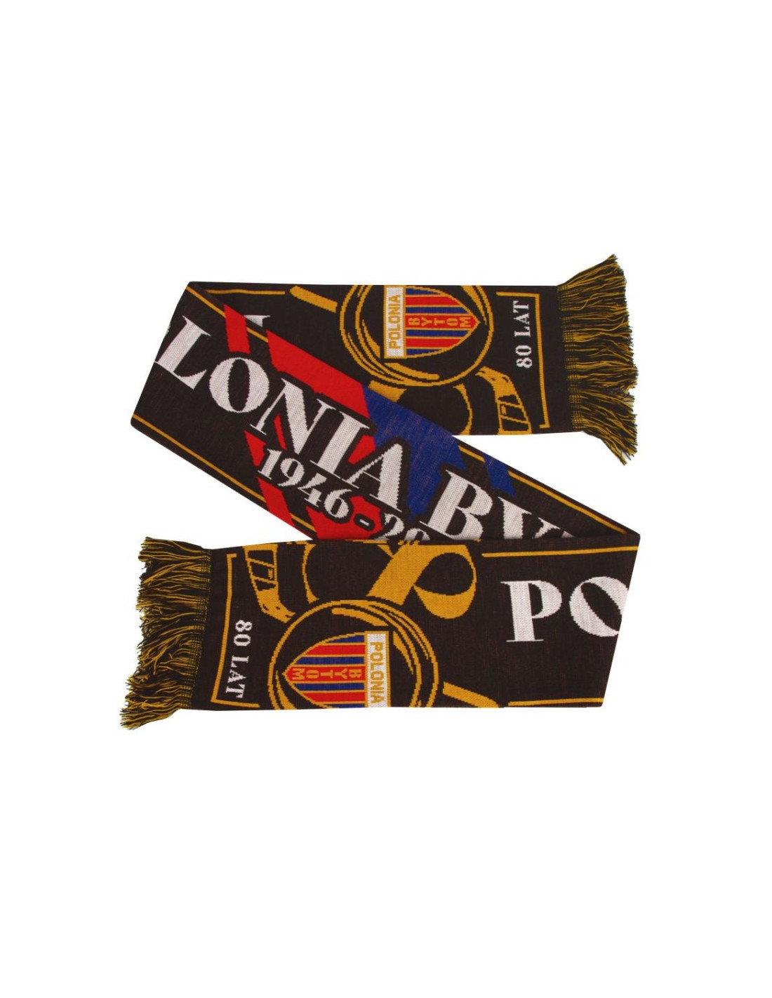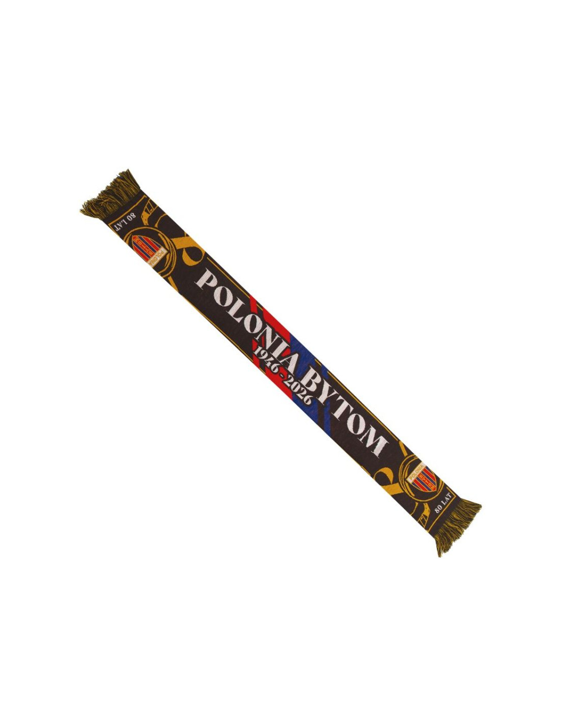 Szal Polonia Bytom – 80 Lat Hokeja Jubileuszowy symbol dumy i tradycji Szal Polonia Bytom – 80 Lat Hokeja to wyjątkowy gadżet stworzony z okazji jubileuszu klubu, podkreślający jego bogatą historię i sportowe dziedzictwo. Elegancki design z motywami rocznicowymi, herbem Polonii Bytom oraz napisem „80 LAT” sprawia, że szal stanowi nie tylko praktyczny element garderoby, ale również cenną pamiątkę dla każdego kibica. Starannie dobrana kolorystyka i wyraziste detale nadają mu prestiżowy charakter. Główne cechy: Edycja jubileuszowa: Projekt upamiętniający 80 lat hokejowej historii Polonii Bytom. Klubowe emblematy: Herb drużyny oraz rocznicowe grafiki podkreślają przywiązanie do tradycji. Stylowy, kolekcjonerski design: Połączenie klasycznych barw z nowoczesnymi elementami graficznymi tworzy ponadczasowy wygląd. Komfortowy materiał: Miękka tkanina zapewnia ciepło i wygodę podczas meczów oraz codziennego noszenia. Szal Polonia Bytom – 80 Lat Hokeja to wyjątkowa pamiątka, która pozwala z dumą celebrować historię klubu i wspierać go w każdym sezonie.