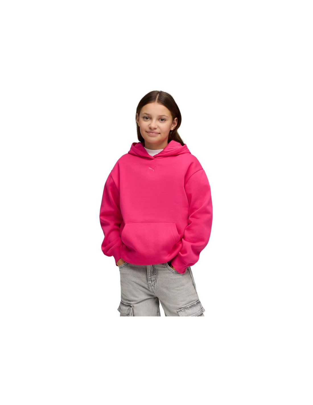 Bluza dla dzieci Puma ESS Centered Cat Logo Relaxed Hoodie fuksja 692973 59 Bluza dla dzieci Puma to funkcjonalny model na co dzień. Design o sportowym charakterze. Fason wyprodukowano z tkaniny o wysokiej zawartości bawełny i dodatku poliestrowych włókien. Obszerny kaptur bez regulacji oraz kieszeń typu kangurka. Ściągacze przy mankietach i u dołu bluzy. Duże logo producenta na froncie. Luźny krój. Materiał: 68% bawełna, 32% poliester Ściągacze: 97% bawełna, 3% elastan