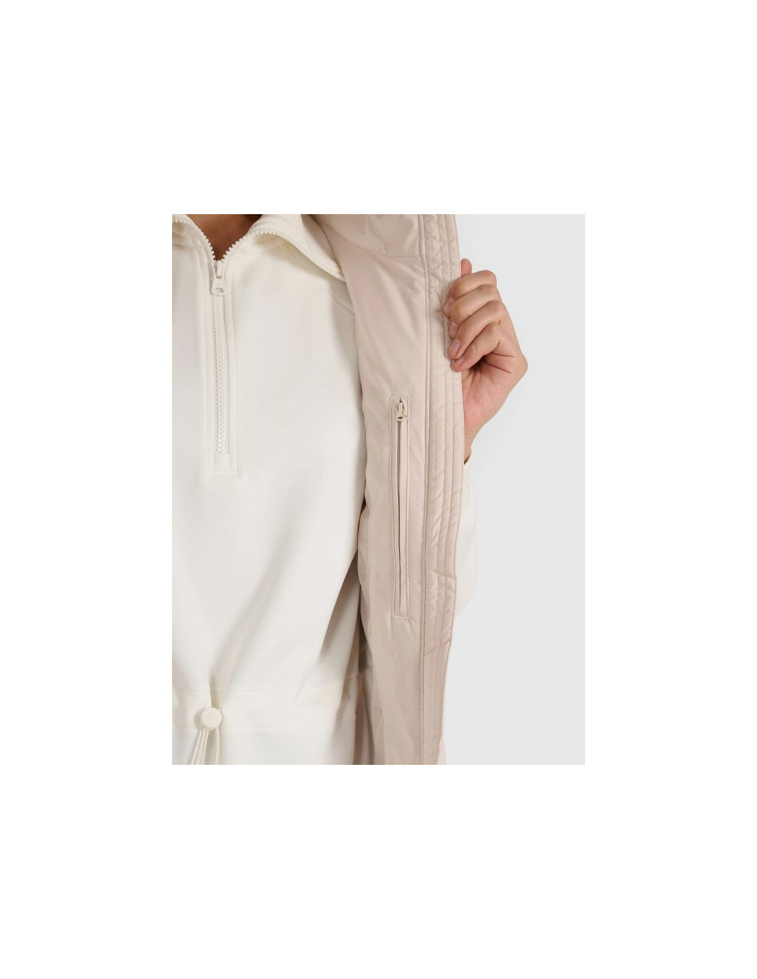 Bezrękawnik posiada zintegrowany kaptur z regulacją, który zwiększa ochronę przed chłodem i wiatrem. Dodatkową osłonę zapewnia także jednokierunkowy zamek błyskawiczny z wewnętrzną plisą, pomagającą ograniczyć napływ zimnego powietrza. Elastyczny dół poprawia dopasowanie, a 2 boczne kieszenie na zamek oraz wewnętrzna kieszeń na zamek pozwalają wygodnie i bezpiecznie przechowywać najpotrzebniejsze drobiazgi.