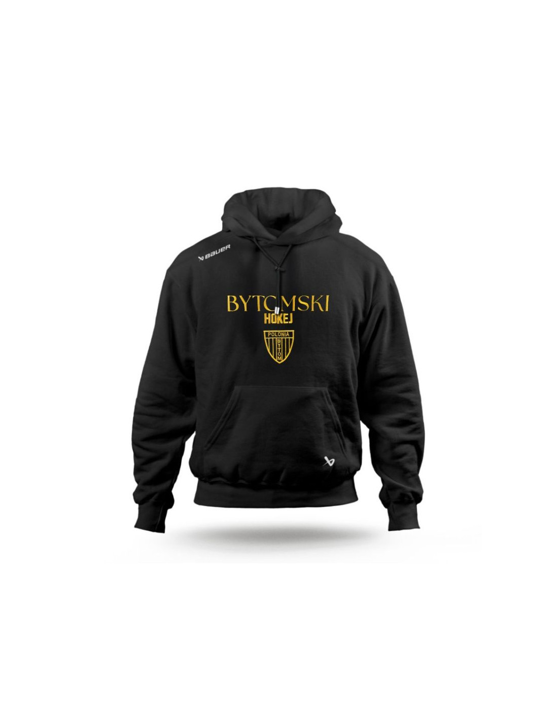Bluza Bytomski Hokej -Haft Styl, duma i komfort dla fanów Polonii Bytom Bluza Bytomski Hokej to obowiązkowy element garderoby każdego kibica klubu hokejowego Polonii Bytom! Klasyczna czarna bluza z kapturem łączy sportowy charakter z codziennym komfortem. Z przodu znajduje się efektowny haft „BYTOMSKI HOKEJ” w złotym kolorze oraz herb klubu Polonia Bytom – symbol dumy i tradycji bytomskiego hokeja. Główne cechy: Wysokiej jakości materiał: Wykonana z miękkiej mieszanki 65% poliestru i 35% bawełny – idealna na chłodne dni, zarówno na trybunach, jak i poza nimi. Sportowy design Bauer: Nowoczesny krój i stylowe logo producenta na ramieniu. Efektowny haft klubowy: Napis „BYTOMSKI HOKEJ” i herb Polonii Bytom w kontrastującym złotym kolorze. Funkcjonalny kaptur i kieszeń kangurka: Idealne rozwiązanie na chłodniejsze dni. Uniwersalny styl: Swietnie sprawdzi się zarówno na trybunach, jak i w codziennym użytkowaniu. Bluza Bytomski Hokej - Haft to połączenie sportowej elegancji i klubowej pasji – idealna dla każdego fana, który chce dumnie reprezentować barwy Polonii Bytom!