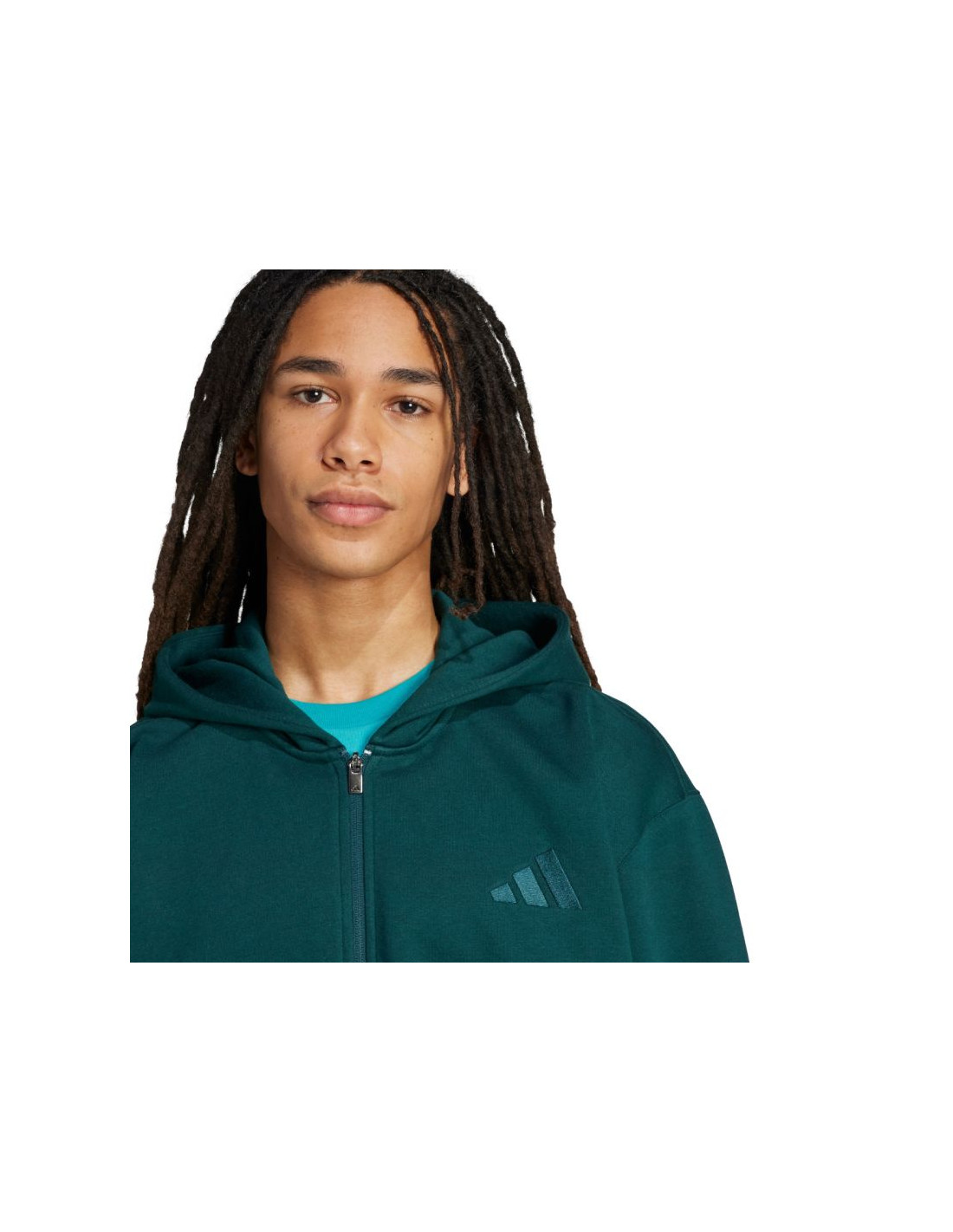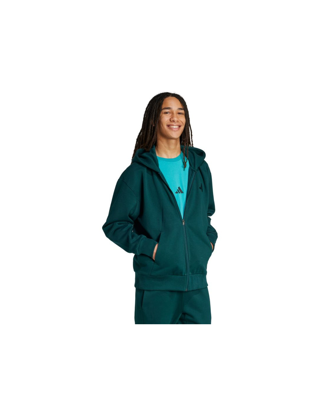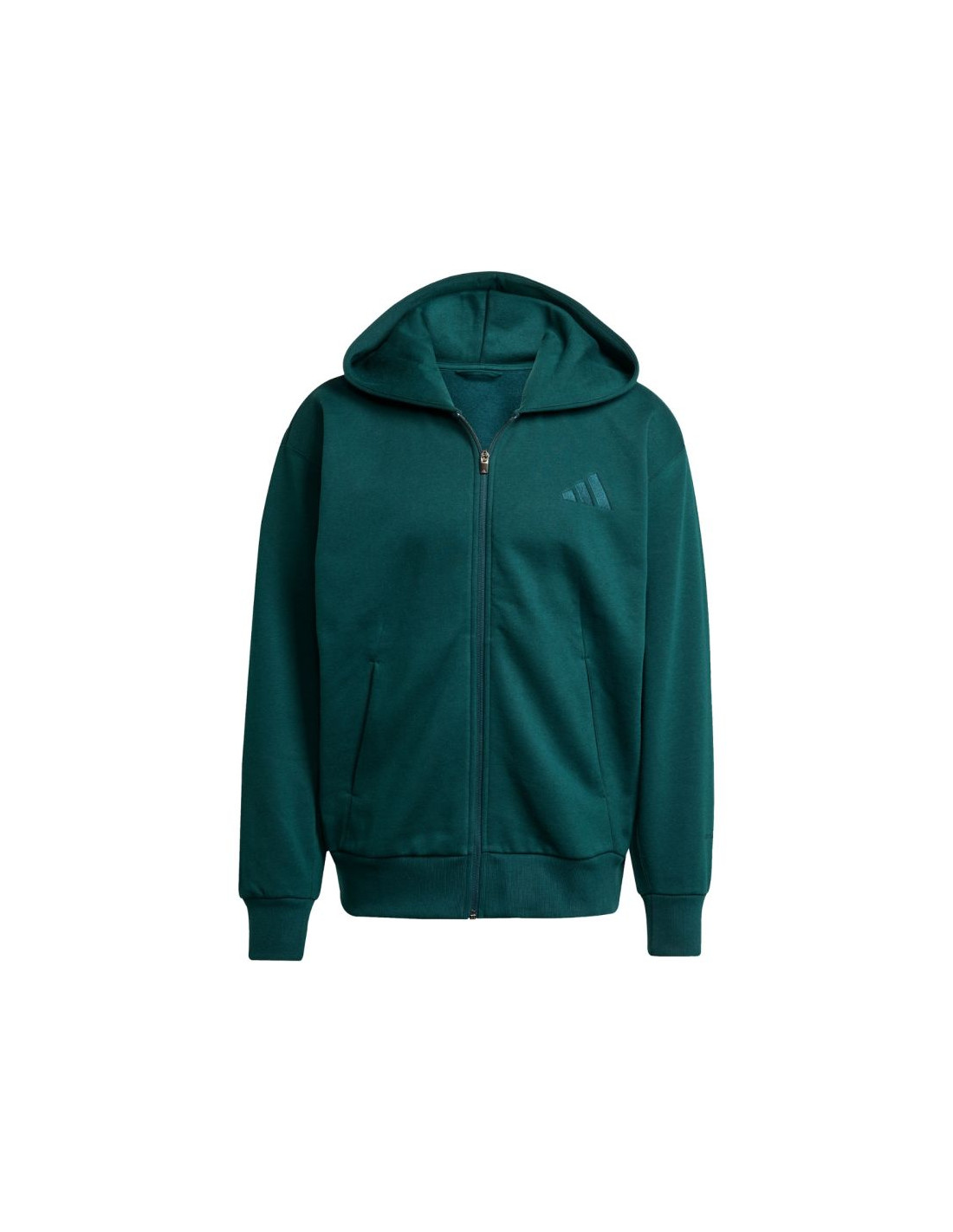 Bluza męska adidas ALL SZN Fleece Full-Zip zielona JX5101 Bluza męska adidas sprawdzi się na co dzień. Przyjemna w dotyku, bawełniana tkanina. Dodatek poliestrowych włókien. Polarowe wyściełanie miękko otula skórę zapewniając ciepło. Luźny krój. Kaptur bez regulacji. Elastyczne mankiety przy rękawach i na dole bluzy. Otwarte kieszenie boczne. Zamek na całej długości. Materiał: 70% bawełna, 30% poliester
