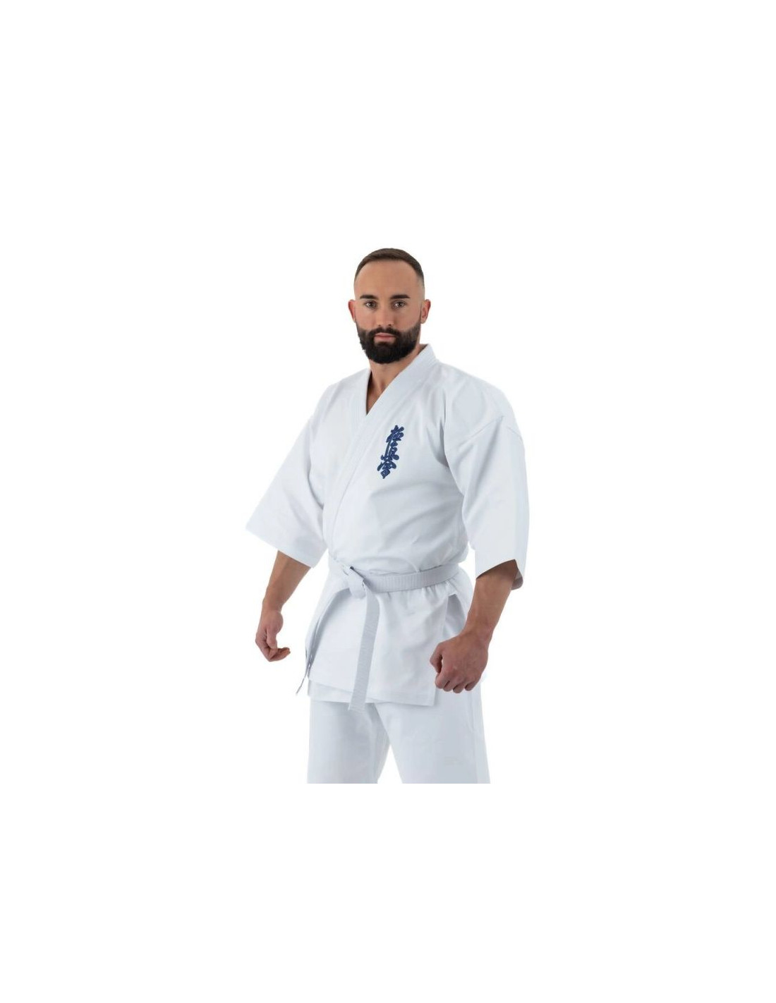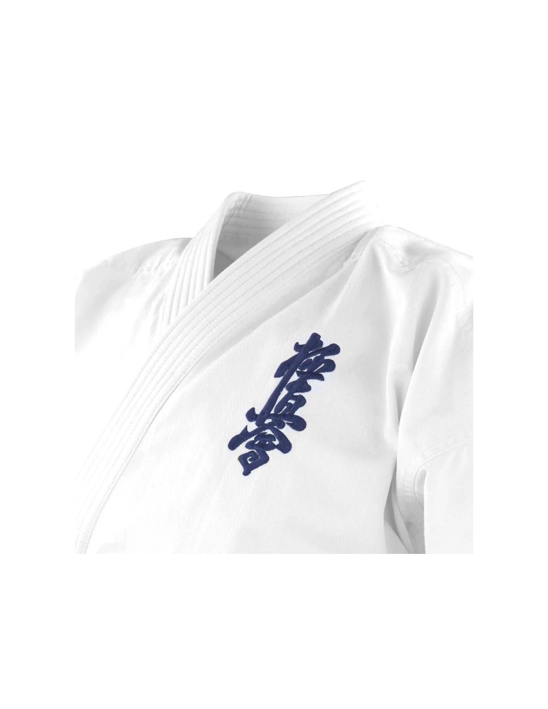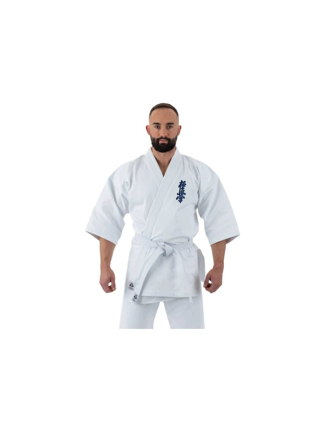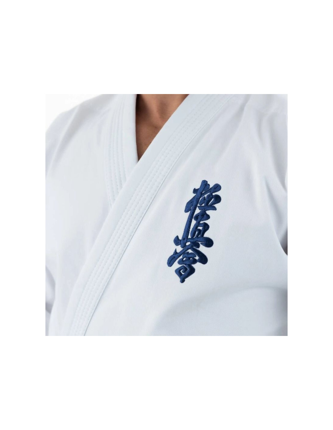 Bluzka kimona posiada szerokie opadające rękawy o długości ¾ oraz granatowy haft Kyokushin lewej piersi nadając jej charakterystyczny wygląd.