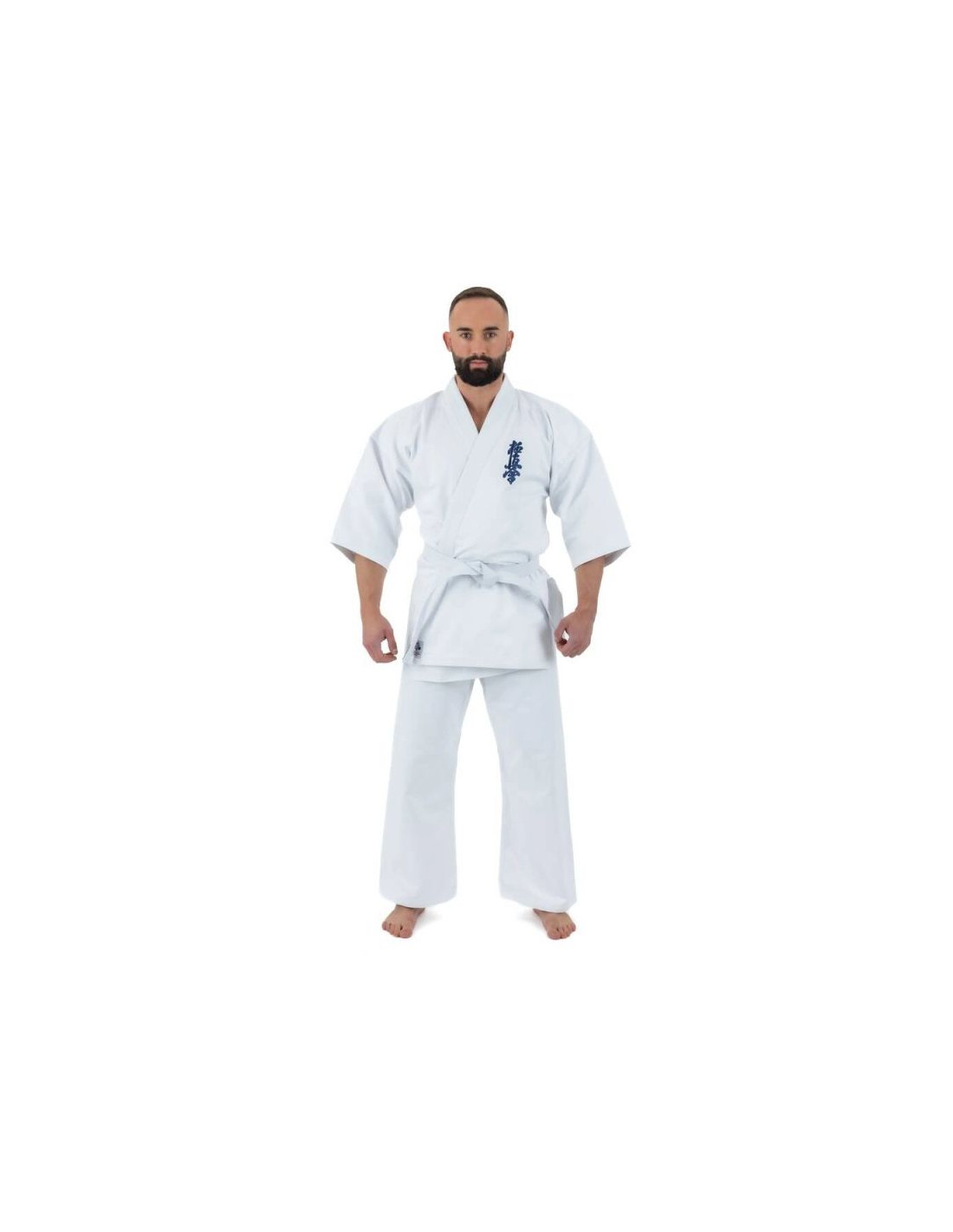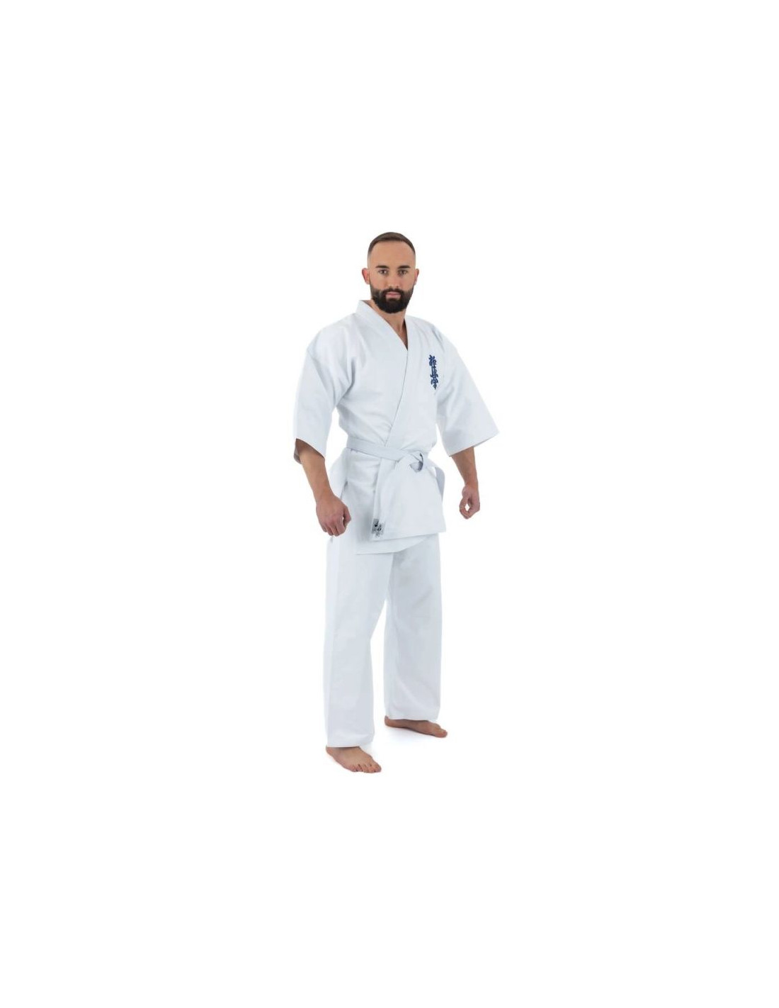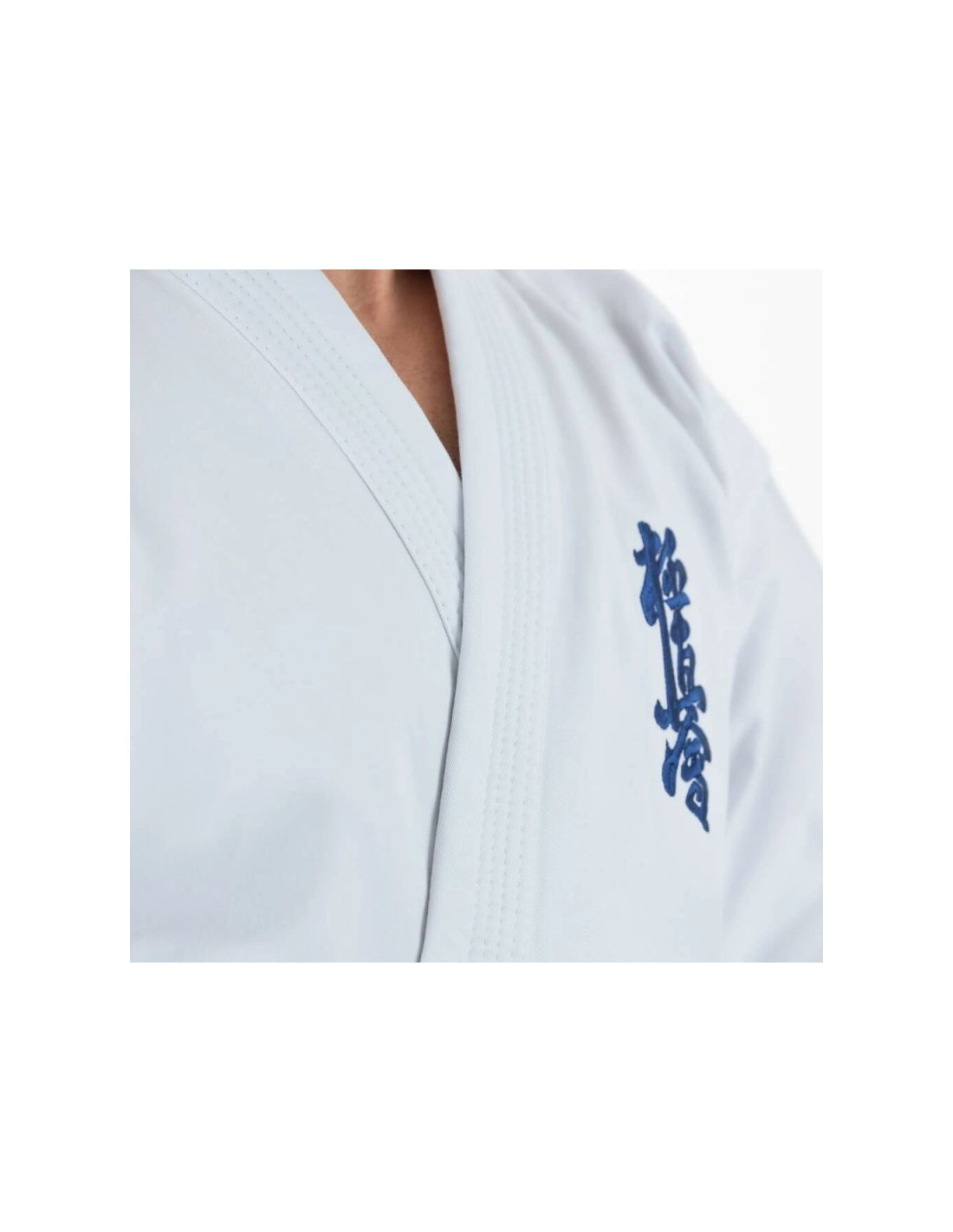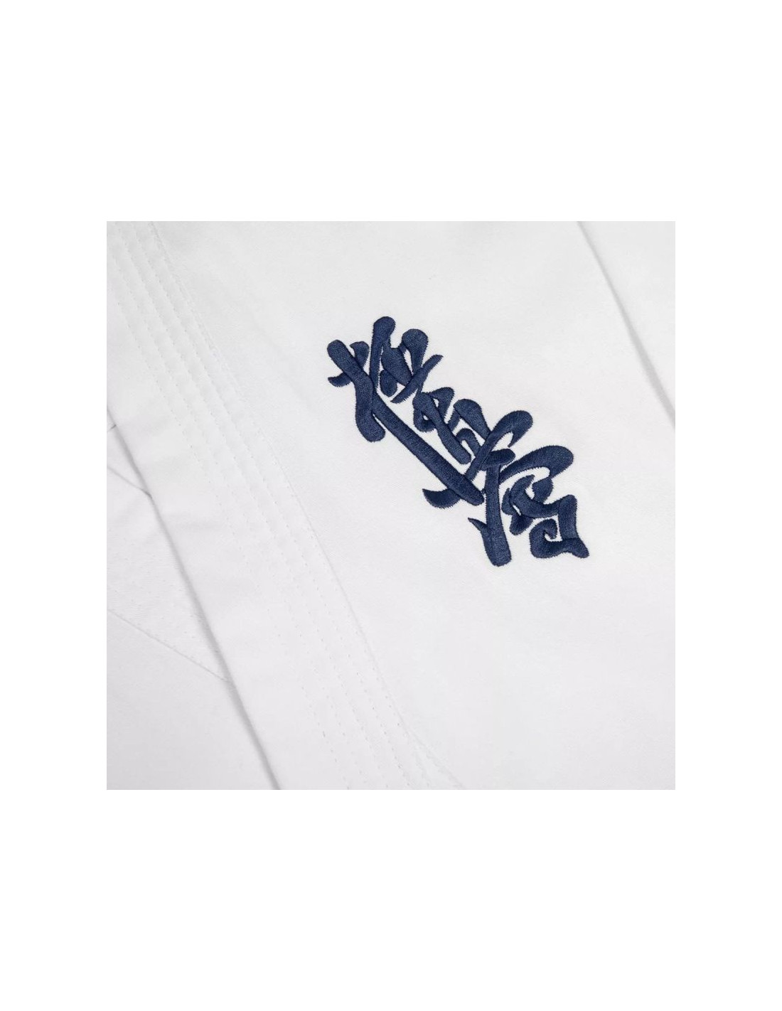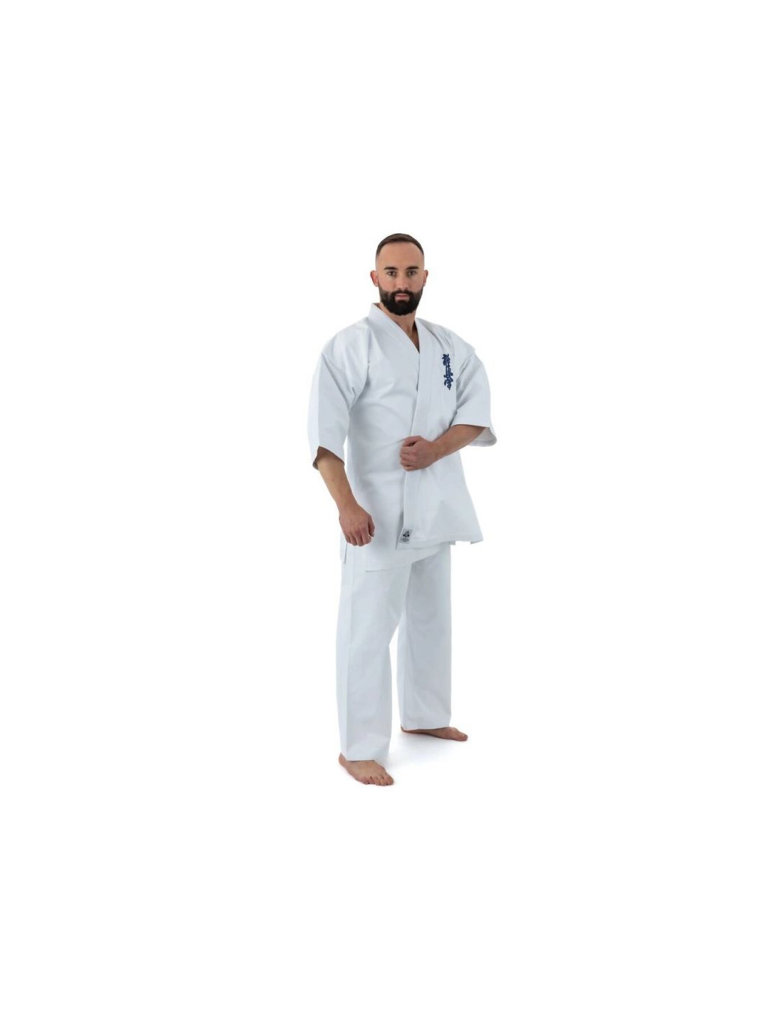 Bluzka kimona posiada szerokie opadające rękawy o długości ¾ oraz granatowy haft Kyokushin lewej piersi nadając jej charakterystyczny wygląd.