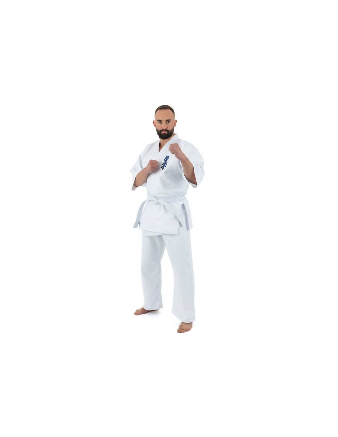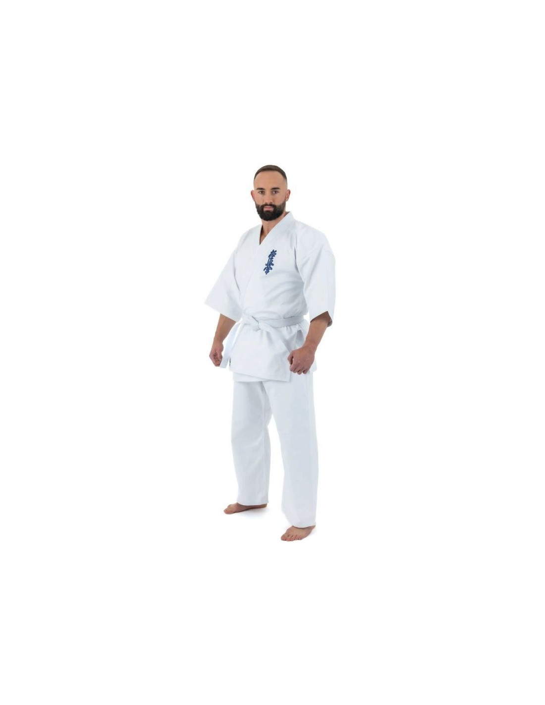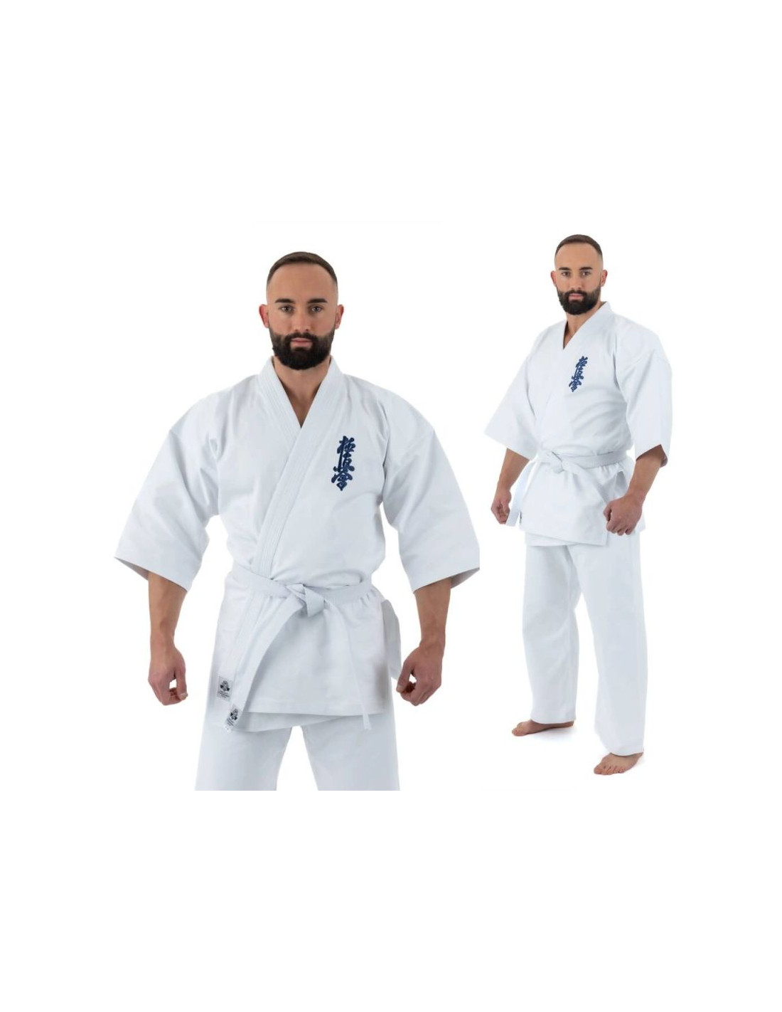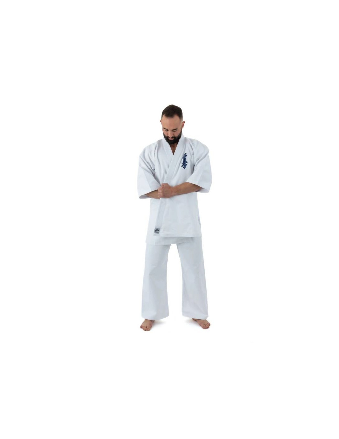Bluzka kimona posiada szerokie opadające rękawy o długości ¾ oraz granatowy haft Kyokushin lewej piersi nadając jej charakterystyczny wygląd.