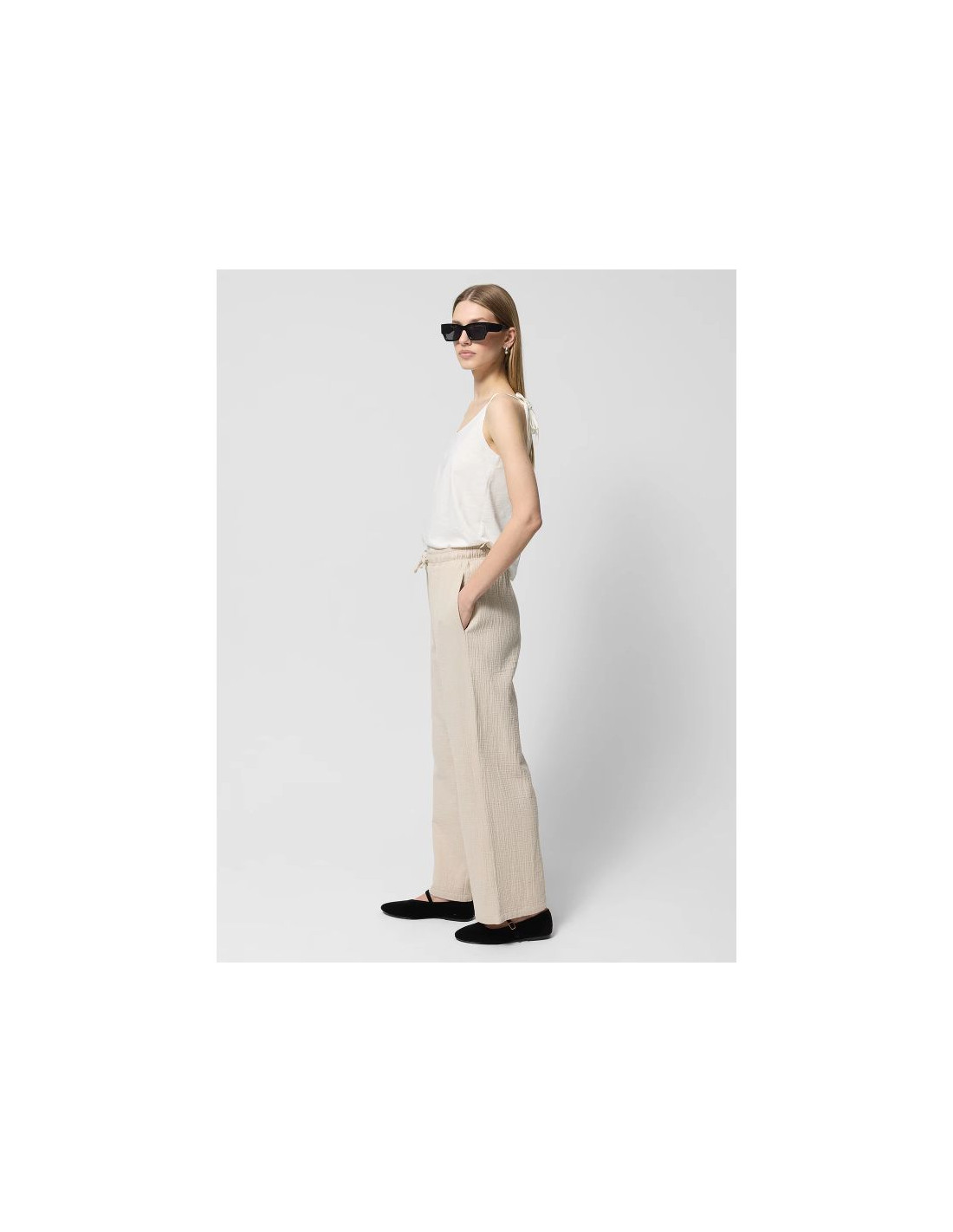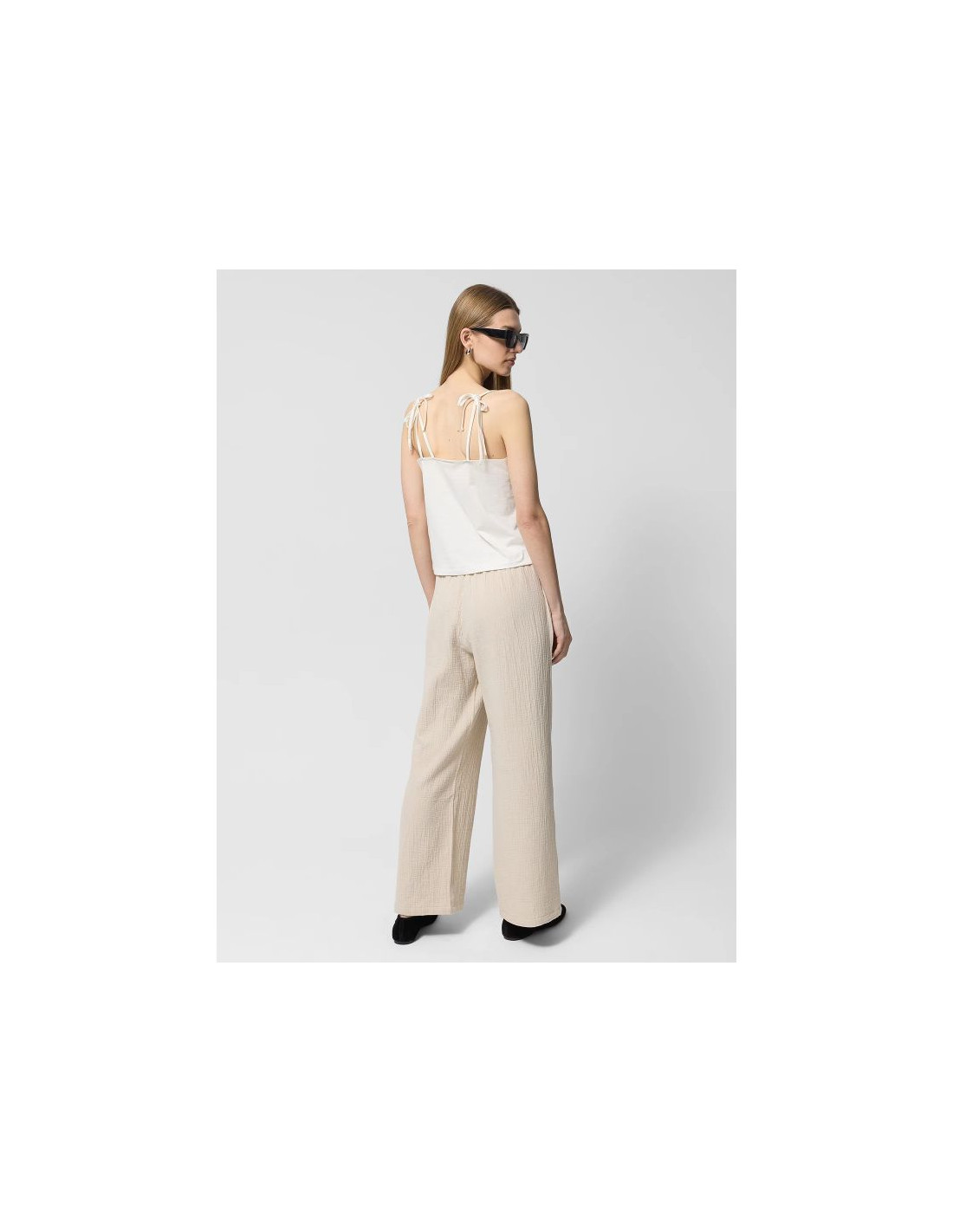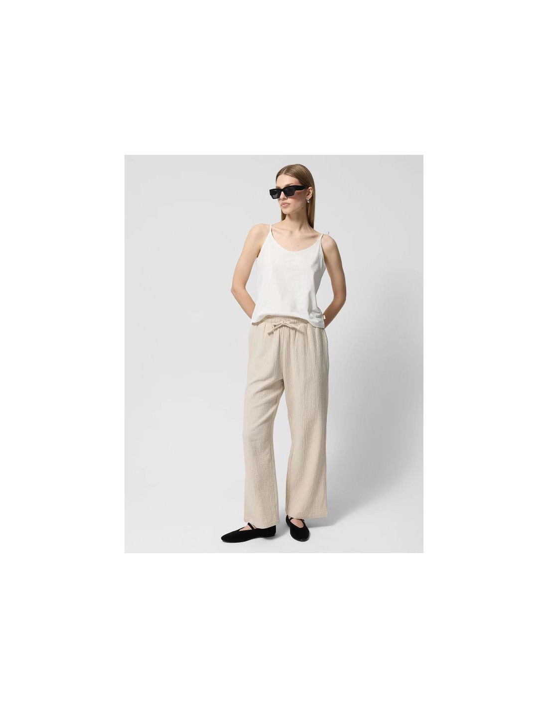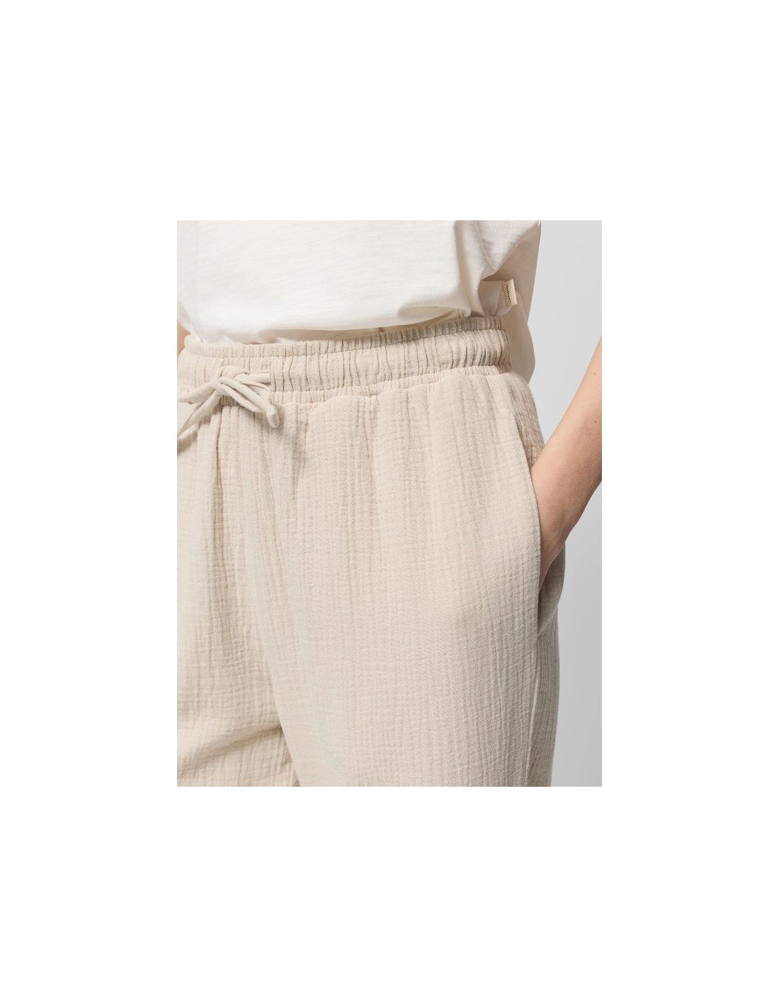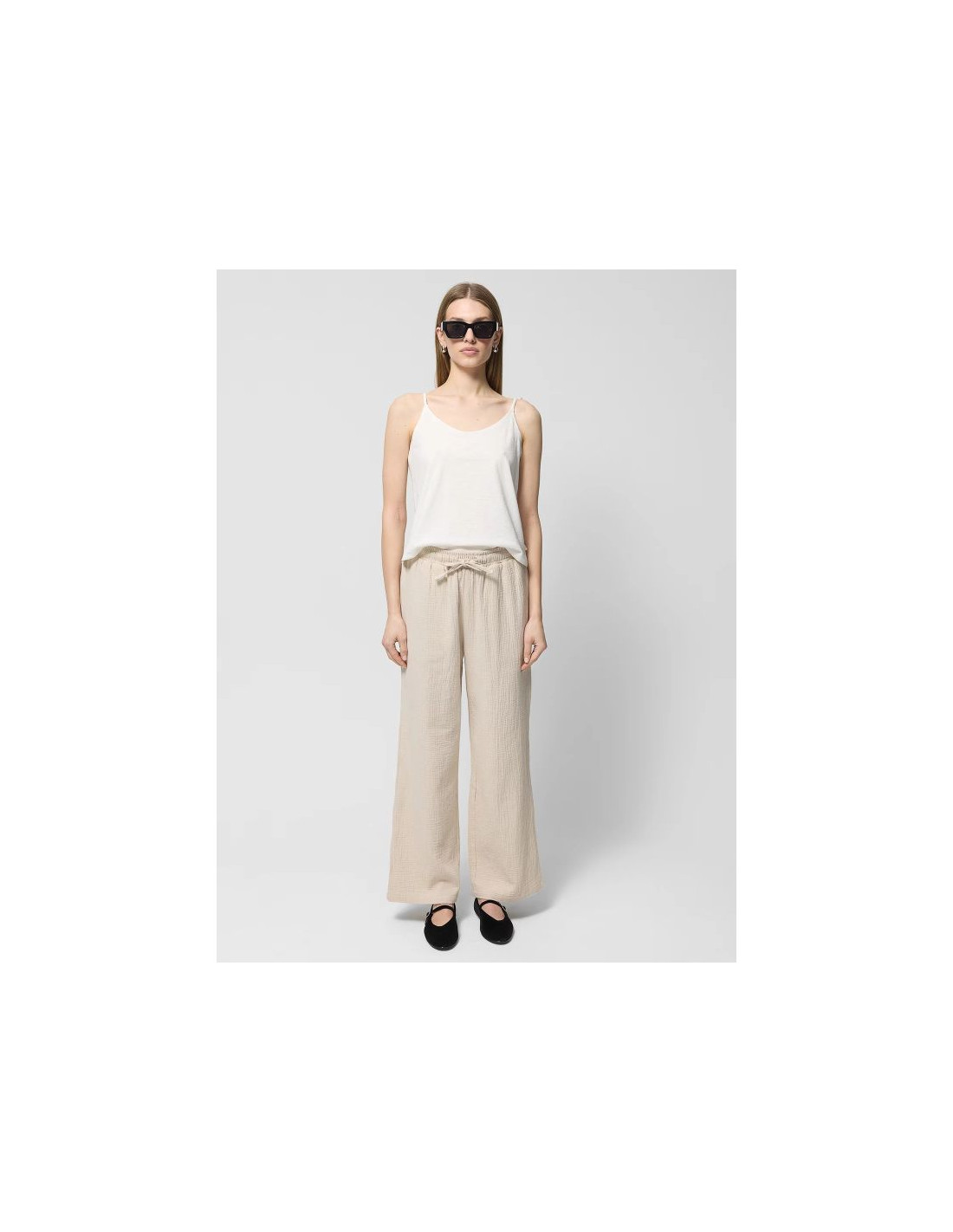 Bawełniany muślin jest niezwykle lekki, miękki w dotyku i przyjemny dla skóry. Dzięki luźniejszemu splotowi włókien jest przewiewny oraz oddychający, dzięki czemu idealnie sprawdzi się latem. Spodnie posiadają wysoki stan i elastyczny pas z wiązaniem. Szerokie, proste nogawki. Dwie otwarte kieszenie.