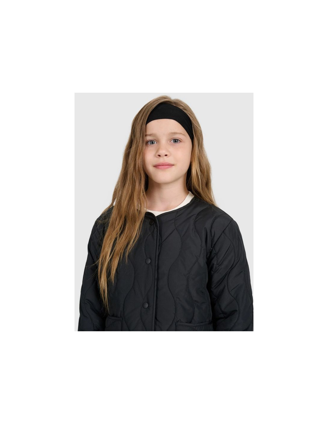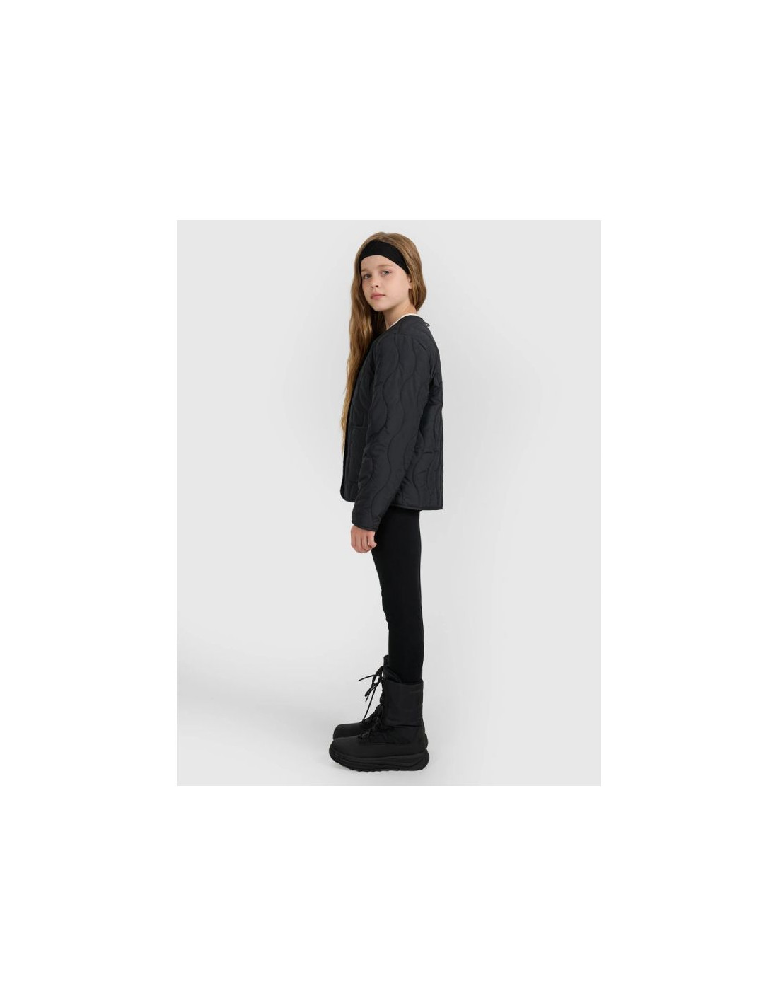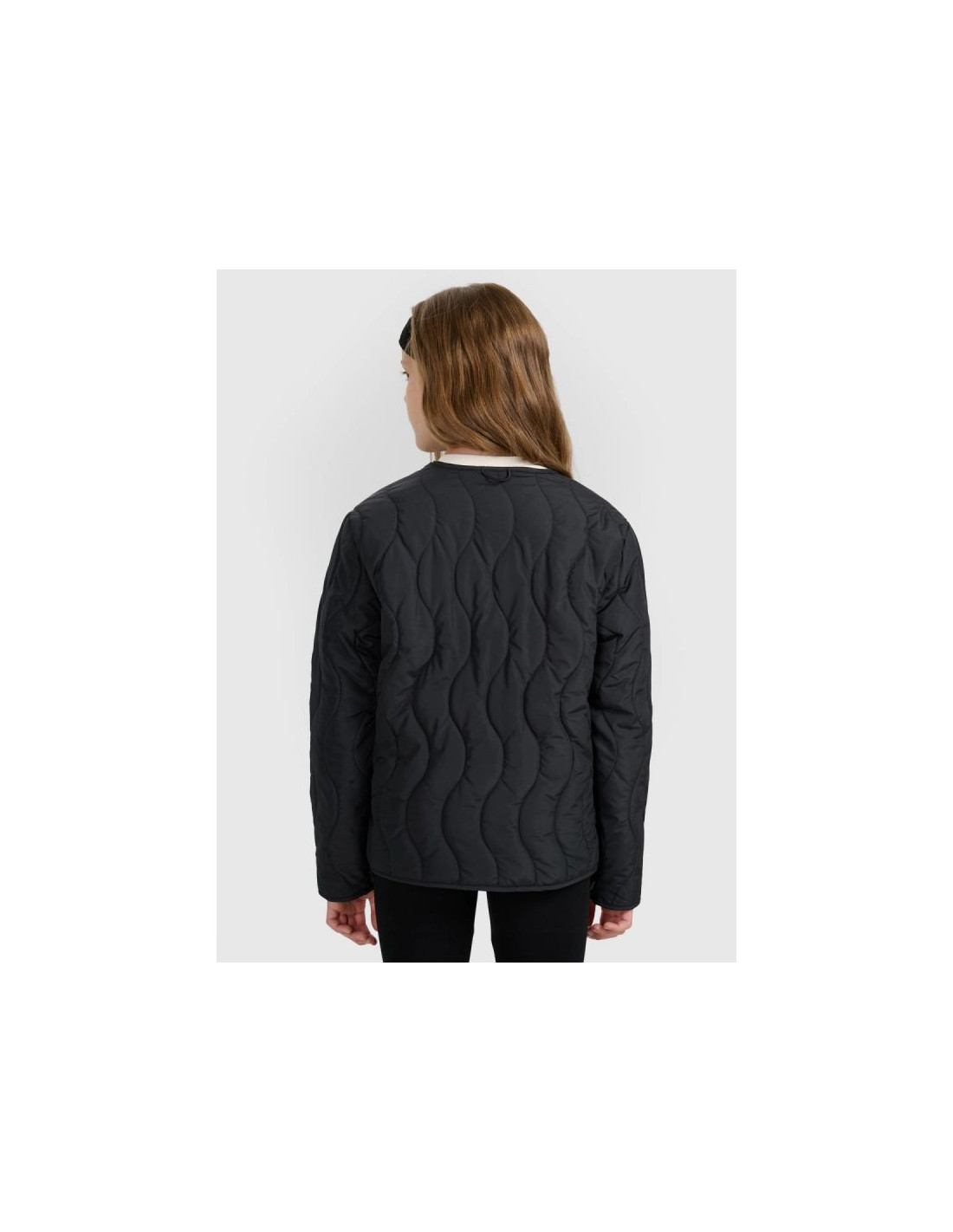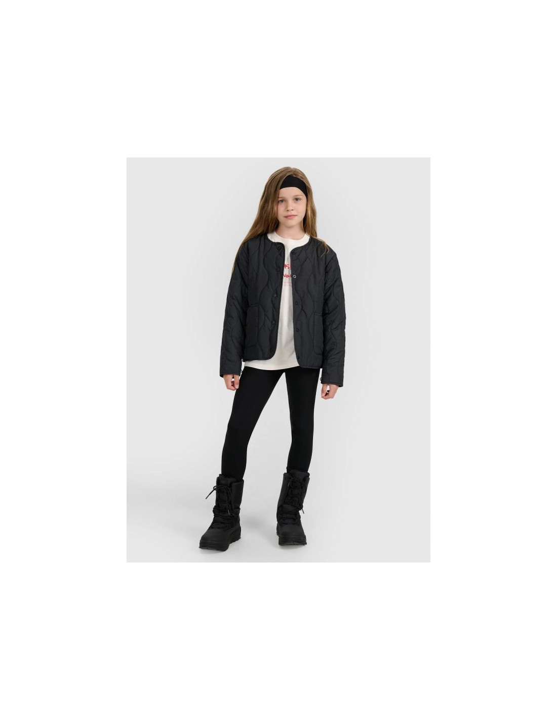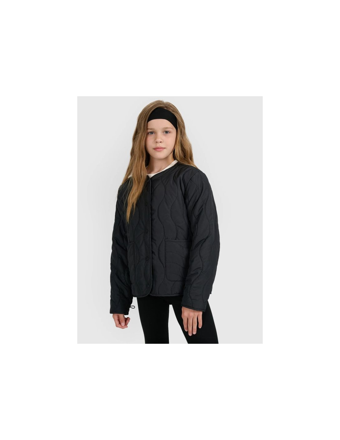 Ta dziewczęca kurtka puchowa 4F została stworzona jako praktyczna i wygodna warstwa na cieplejsze lub pochmurne dni okresu przejściowego. Krój oversize luźno układa się na sylwetce i zapewnia swobodę ruchów, a pikowanie w faliste linie nadaje całości nowoczesny i wyjątkowy charakter. Lekka ocieplina poliestrowa gwarantuje komfort cieplny, a gładka poliestrowa podszewka ułatwia zakładanie i poprawia wygodę noszenia. Elastyczne pętelki z gumki umożliwiają spięcie kurtki z kompatybilnym modelem, tworząc funkcjonalny zestaw chroniący przed podwiewaniem. Zapięcie na metalowe napy oraz dwie otwarte kieszenie boczne zapewniają prostotę użytkowania i praktyczną funkcjonalność. To stylowy, lekki i wygodny wybór na co dzień.