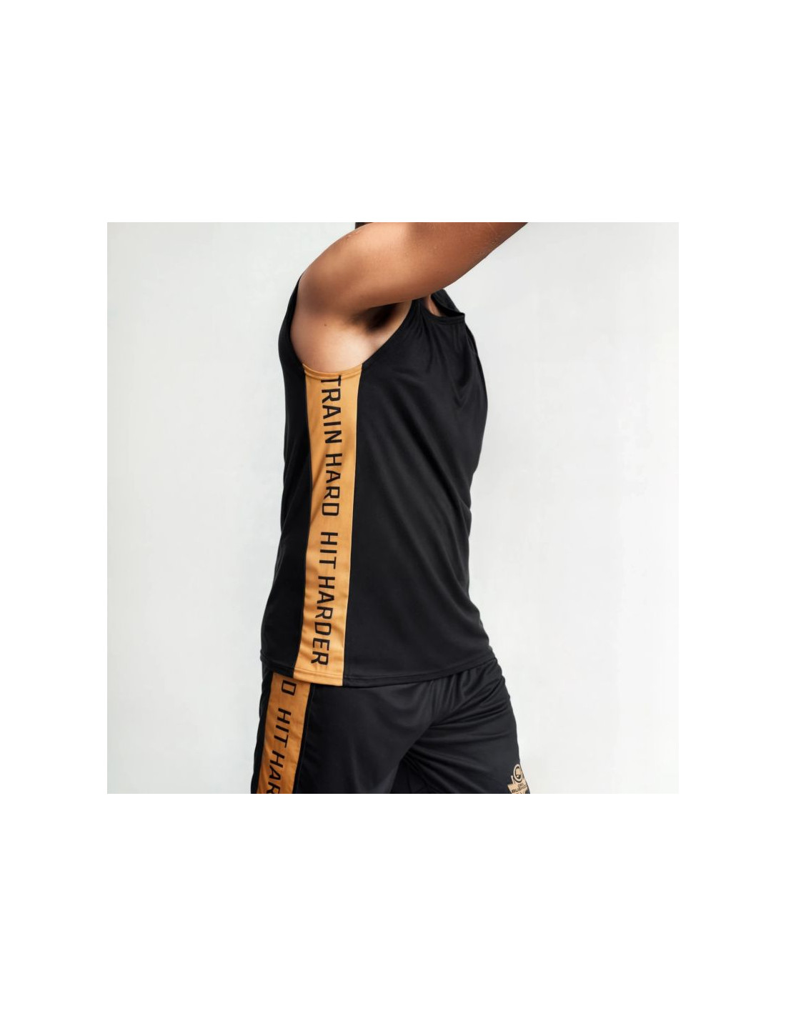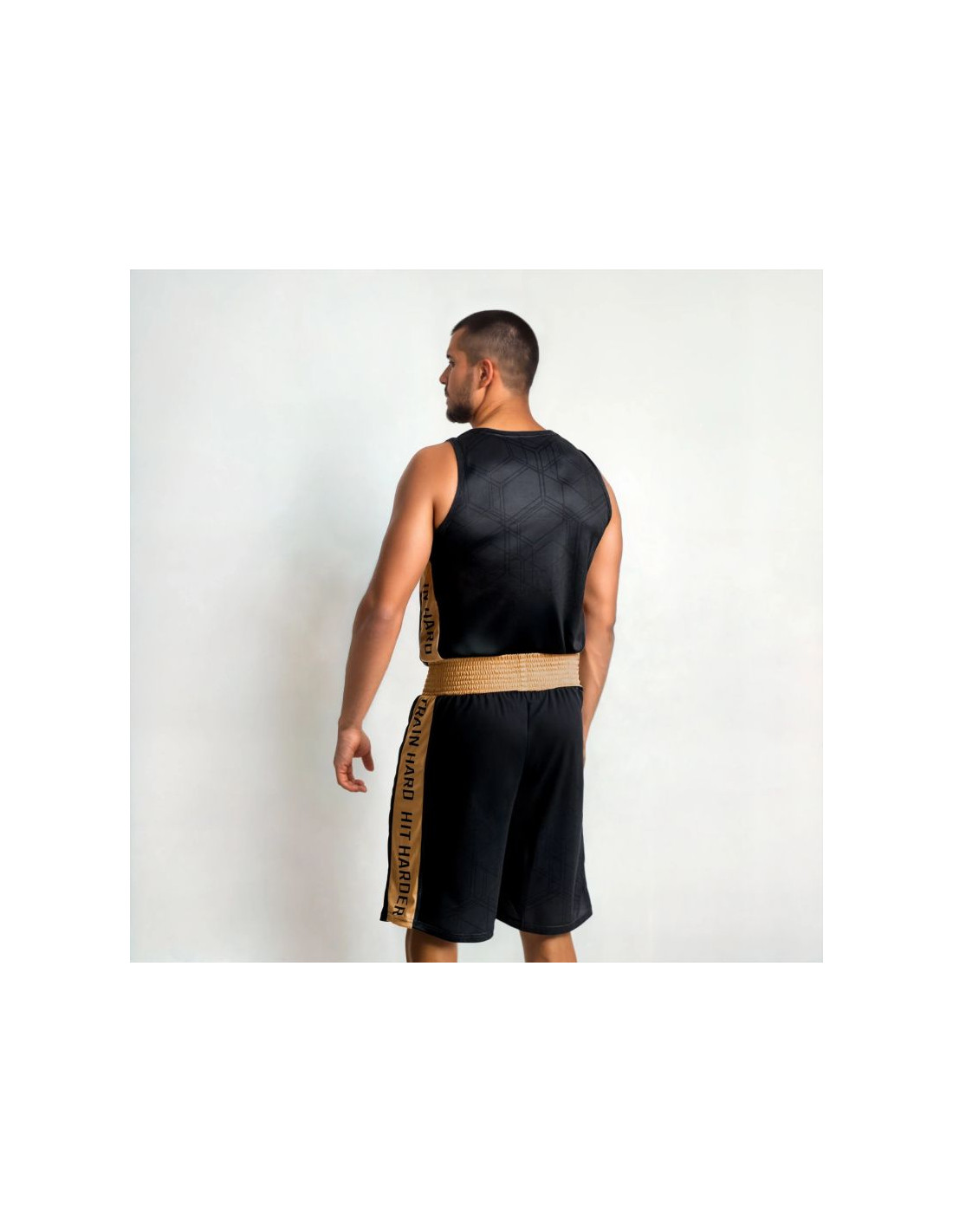 Wzdłuż tułowia widnieje motto: "TRAIN HARD. HIT HARDER." – przypomnienie, że pot wylany na treningu procentuje w każdej walce.