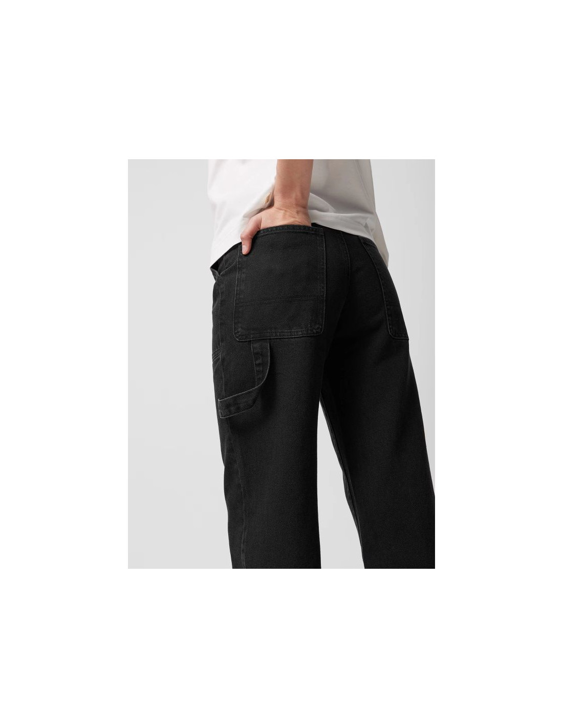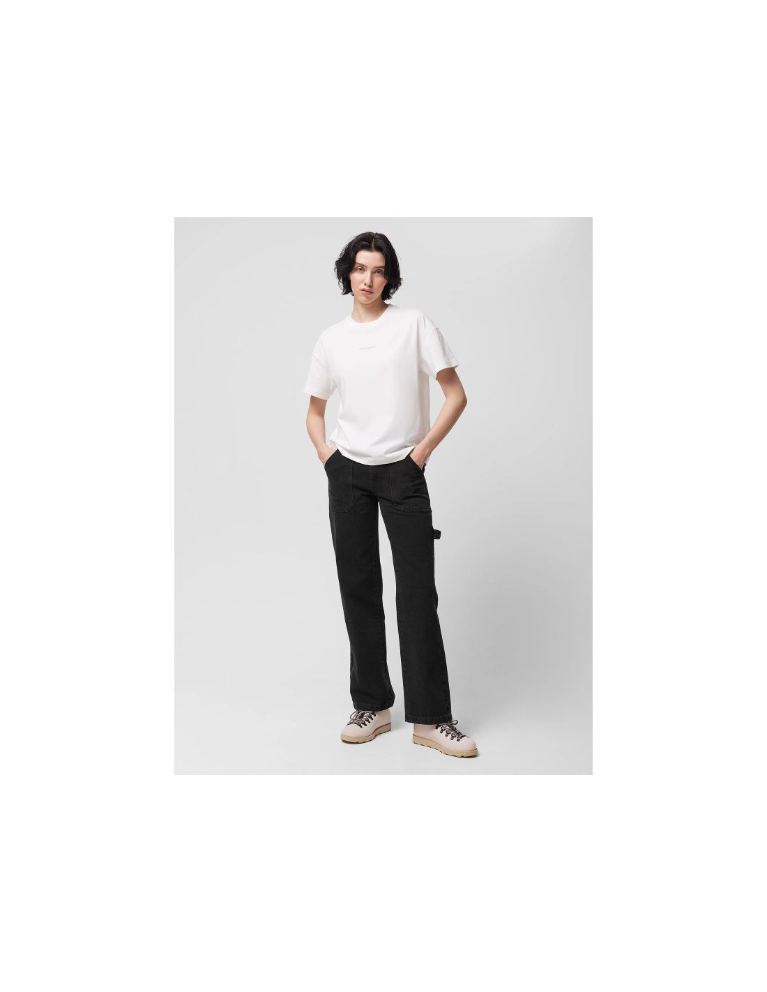 Spodnie jeansowe posiadają wysoki stan i pas ze szlufkami. Zapięcie na zamek błyskawiczny oraz guzik. Duże otwarte kieszenie z przodu. Z tyłu trzy kieszenie oraz pętelka inspirowana spodniami roboczymi. Wykonane z bawełnianej tkaniny. Materiał został poddany procesowi sprania, dzięki czemu nie jest sztywny, dobrze układa się na sylwetce oraz jest przyjemny w dotyku. Na szlufce wyhaftowany unikalny numer modelu, który wskazuje na krój oraz sezon, z którego pochodzą jeansy.