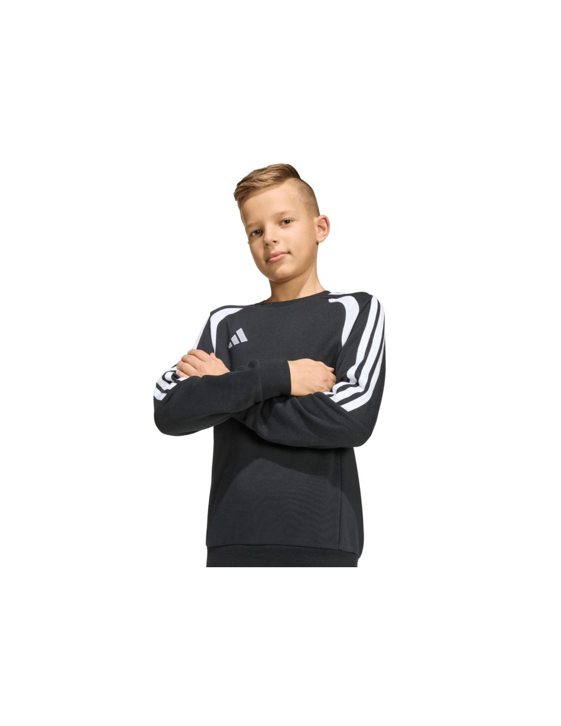 Bluza dla dzieci adidas Tiro 26 League Sweat Crew czarna KF5822 Bluza dla dzieci adidas sprawdzi się podczas codziennego użytkowania niezależnie od pory roku. Konstrukcja o regularnym kroju. Mieszanka bawełny oraz poliestru pochodzącego z recyklingu. Wewnątrz zastosowano miękkie ocieplenie. Ściągacze w mankietach i u dołu sprawiają, że bluza pozostaje na swoim miejscu. Materiał: 70% bawełna, 30% poliester z recyklingu