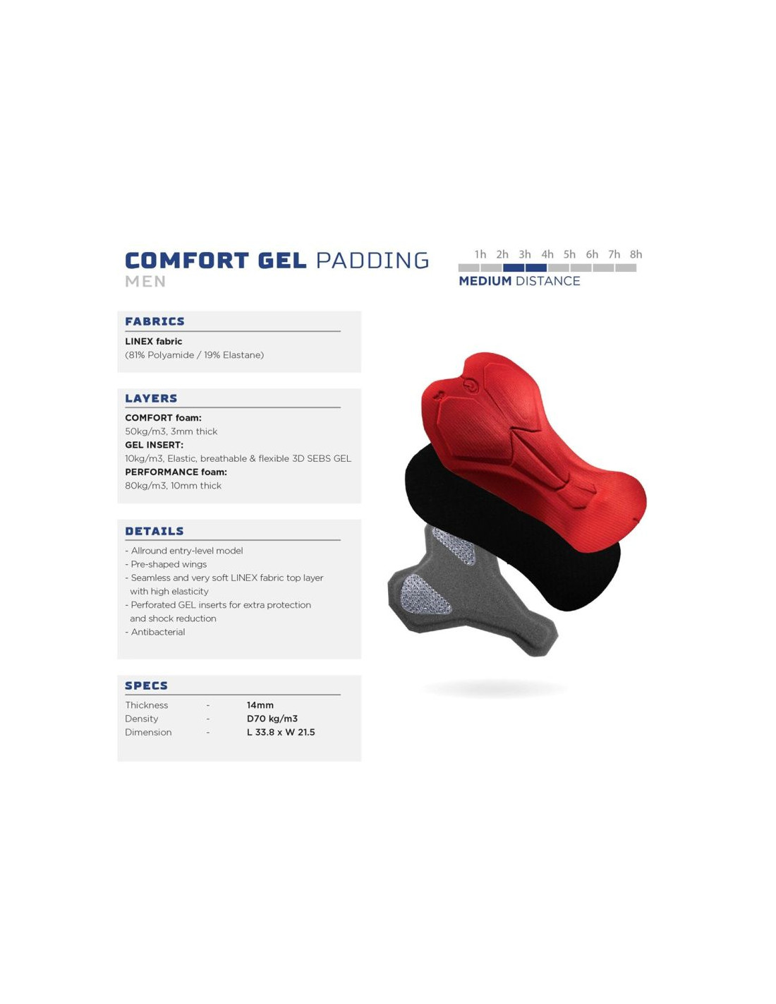 Spodnie posiadają wkładkę Comfort Gel, idealną na średnio długie przejażdżki. Dzięki konstrukcji 3D z zerowym tarciem, wkładka jest gładka i wygodna. Elementy żelowe w zamszu zapewniają wygodne siedzenie w siodle. Perforowana struktura i górna warstwa tkaniny LINEX zapewniają optymalną wentylację i regulację wilgoci.