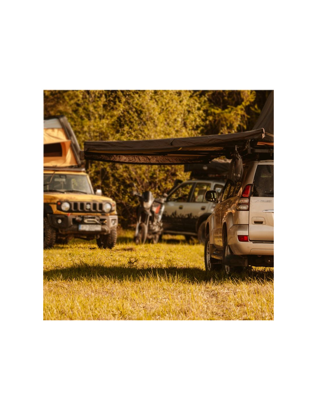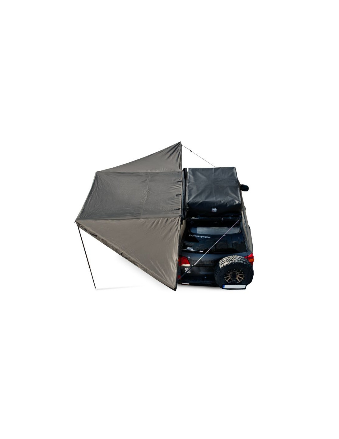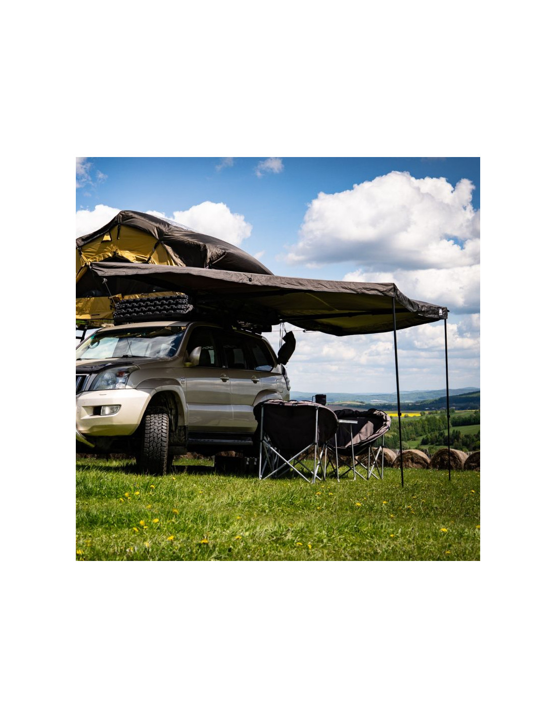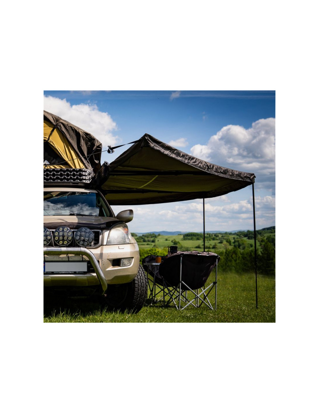 - Zadaszenie rozciąga się wokół samochodu aż na 180°, tworząc dużą, zacienioną przestrzeń, gdzie spokojnie odpoczniesz w upalne dni.