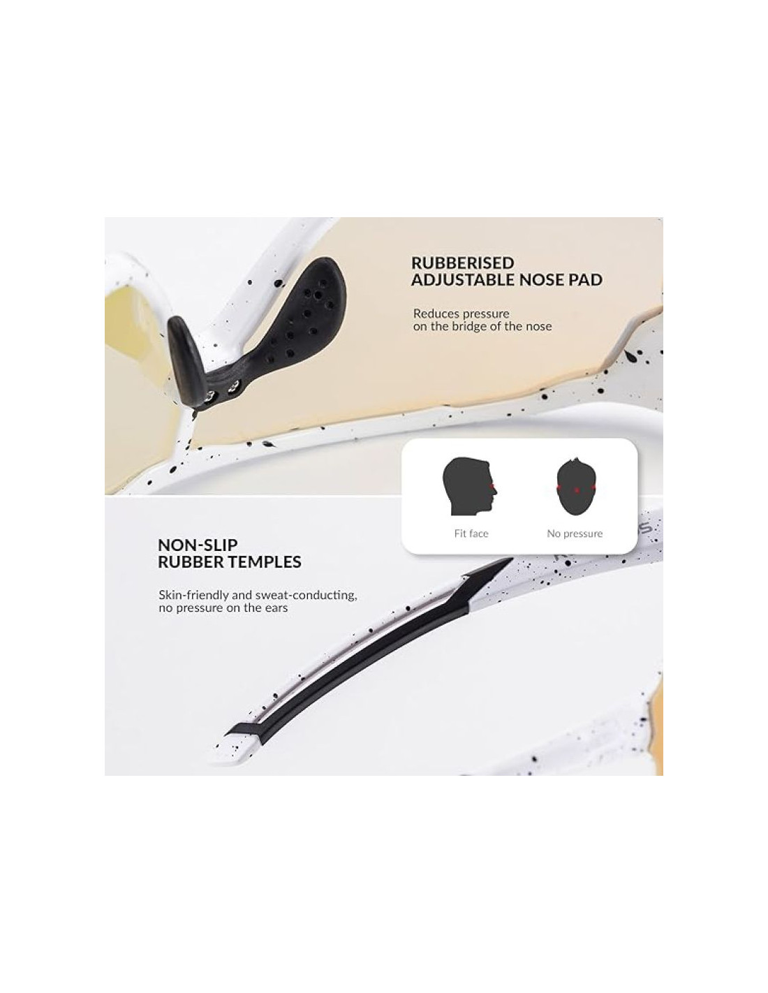 Regulowany gumowy mostek na nos zapewnia maksymalny komfort i antypoślizgowy chwyt, jednocześnie zmniejszając nacisk na nosek. Antypoślizgowe gumowe paski po obu stronach wykonane są z przyjaznego dla skóry materiału, który szybko odprowadza pot i zachowuje swój kształt.
