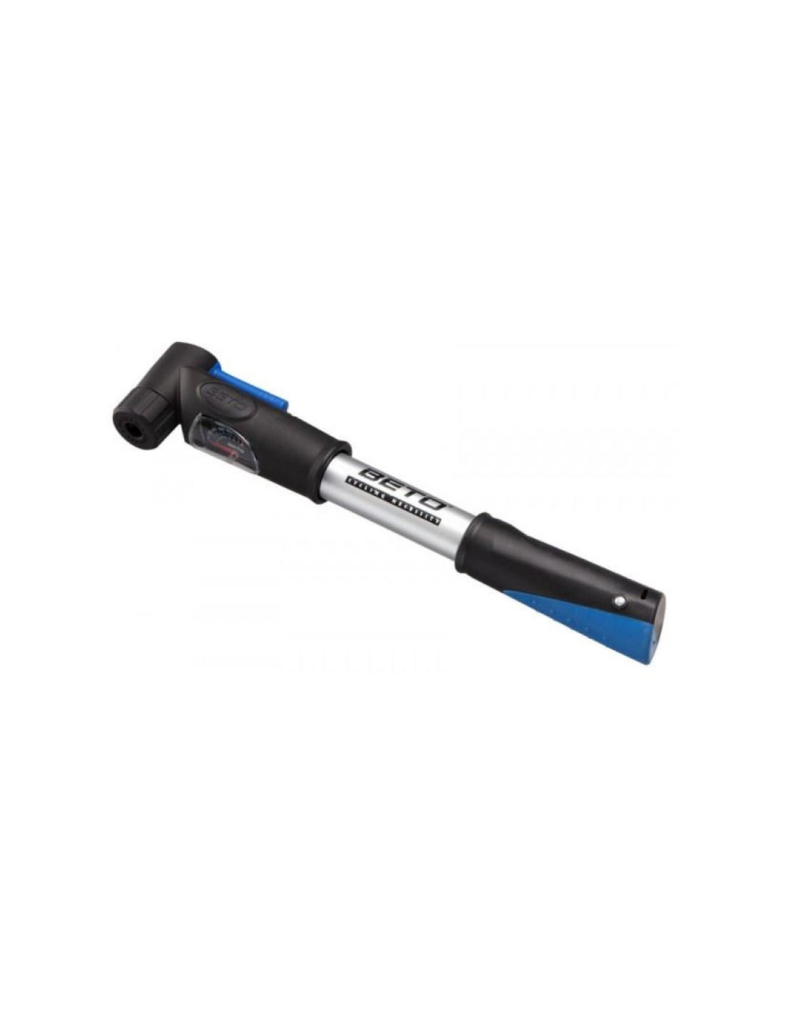 Pompka aluminiowa z MANOMETREM; dwustopniowa (pompuje w obie strony); miękka rękojeść kraton; zawór automatyczny Schrader / Presta, Ciśnienie max. 100 PSI/ 7 BAR