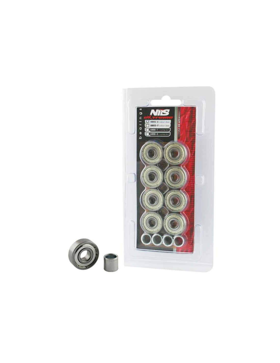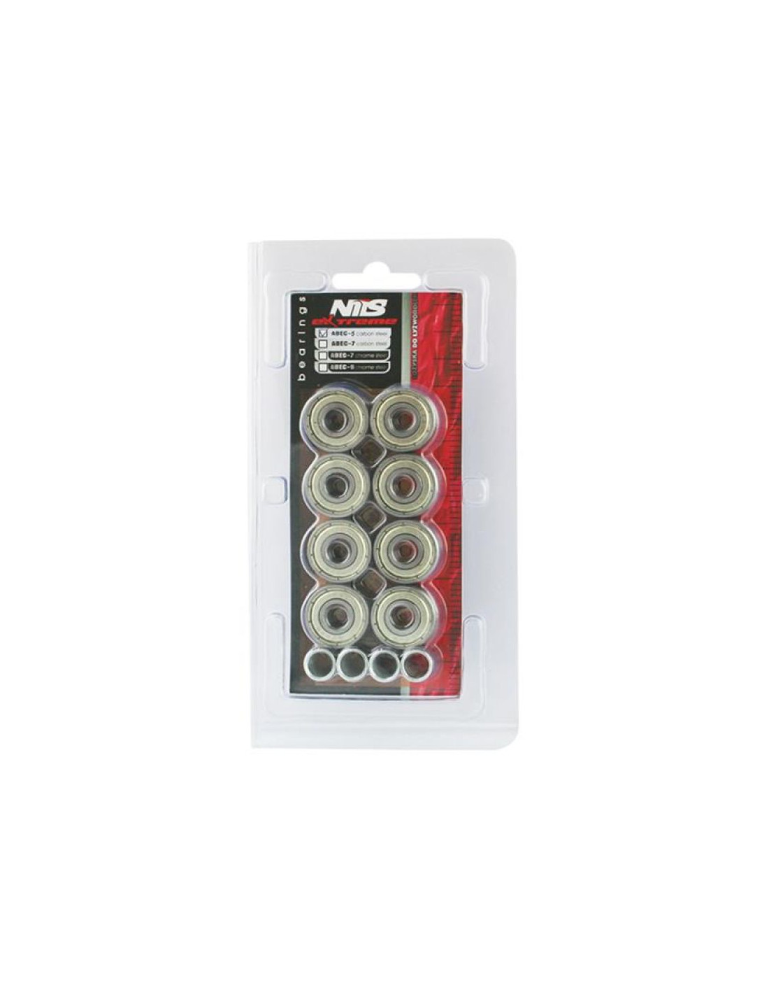 ABEC-5 Nils Extreme to łożyska, które wykonane zostały z wysokiej jakości stali węglowej, zapewniającej doskonałą twardość i wytrzymałość. Charakteryzuje się niskim oporem toczenia co przekłada się na większą prędkość w amerykańskiej normie Annular Bearing Engineering Commitee w skrócie ABEC. Istotnym parametrem tego łożyska jest mimośrodowość czyli okrągłość na torze w pierścieniu wewnętrznym i wynosi zaledwie 0,0035mm. Łożysko przeznaczone do rolek, deskorolek i hulajnóg.