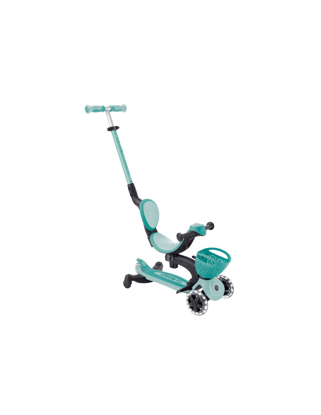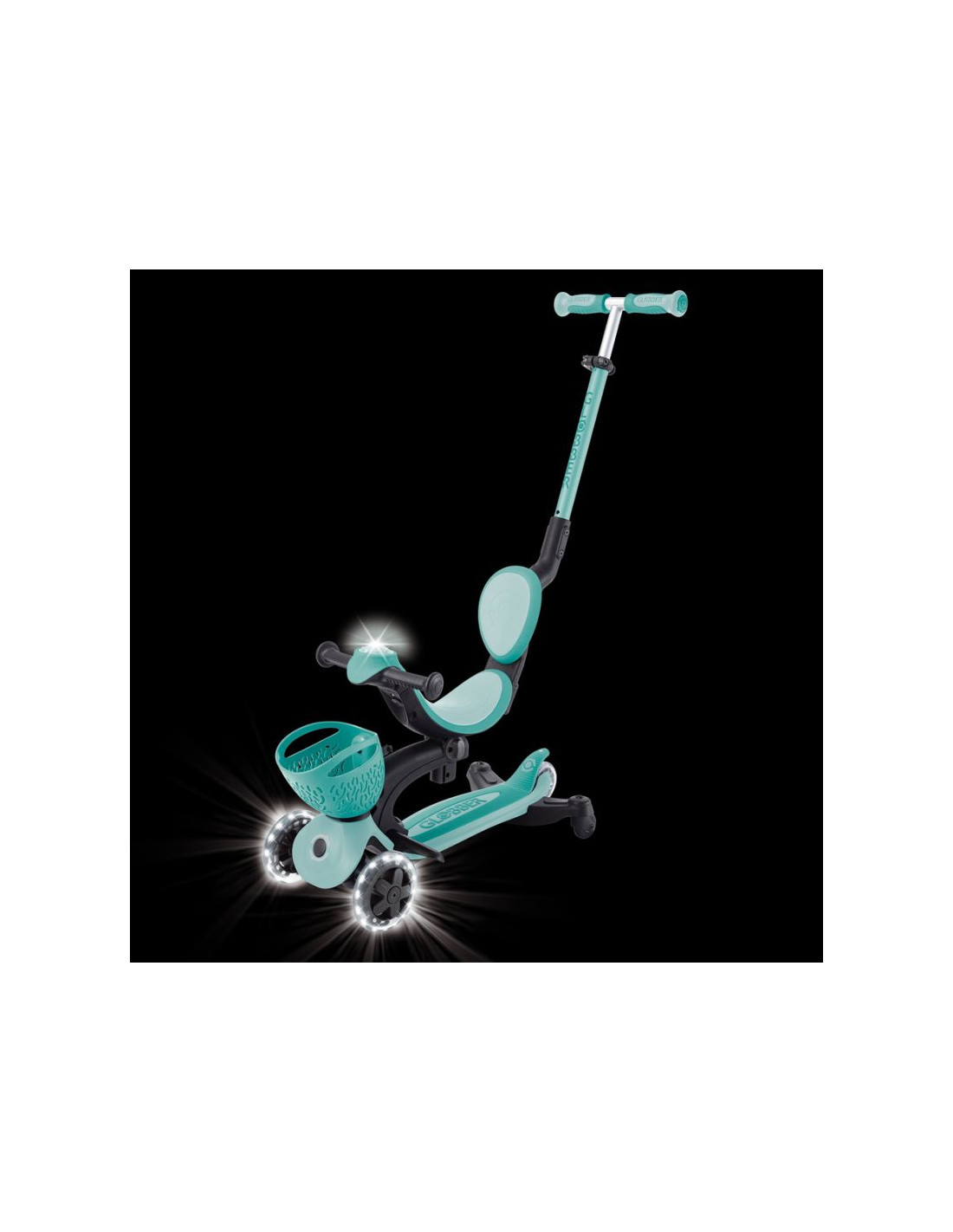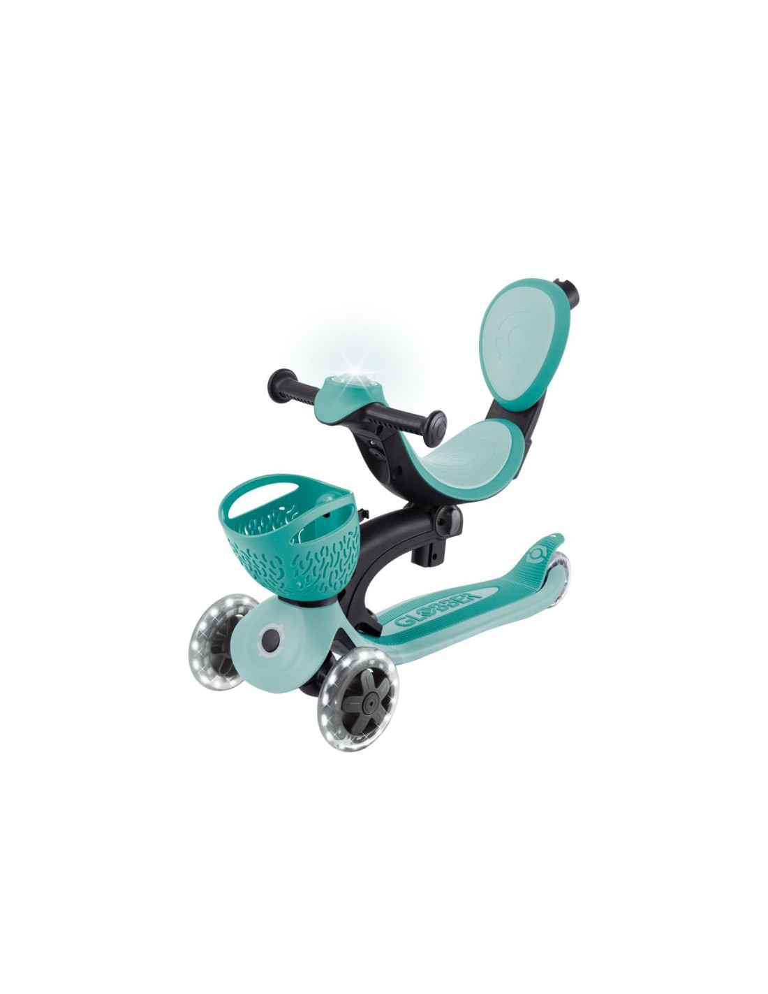 Wielofunkcyjny pojazd typu „wszystko w jednym”, z siedziskiem dla małych dzieci, wykonany z plastiku TBC pochodzącego z recyklingu, wyposażony w świecące kółka, światełko na kierownicy, koszyczek, oparcie i boczne kółka.